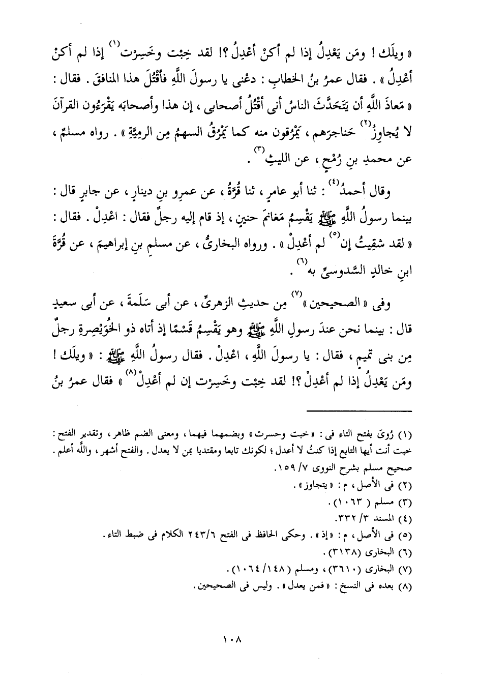 وَفِي " الصَّحِيحَيْنِ " مِنْ حَدِيثِ الزُّهْرِيِّ عَنْ أَبِي سَلَمَةَ عَنْ أَبِي سَعِيدٍ قَالَ: «بَيْنَمَا نَحْنُ عِنْدَ رَسُولِ اللَّهِ صَلَّى اللَّهُ عَلَيْهِ وَسَلَّمَ وَهُوَ يَقْسِمُ قَسْمًا إِذْ أَتَاهُ ذُو الْخُوَيْصِرَةِ رَجُلٌ مِنْ بَنِي تَمِيمٍ، فَقَالَ: يَا رَسُولَ اللَّهِ، اعْدِلْ. فَقَالَ رَسُولُ اللَّهِ صَلَّى اللَّهُ عَلَيْهِ وَسَلَّمَ: " وَيْلَكَ! وَمَنْ يَعْدِلُ إِذَا لَمْ أَعْدِلْ؟! لَقَدْ خِبْتَ وَخَسِرْتَ إِنْ لَمْ أَعْدِلْ " فَقَالَ عُمَرُ بْنُ