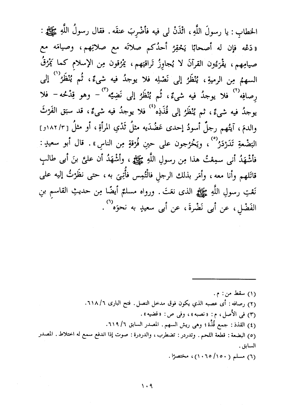 الْخِطَابِ: يَا رَسُولَ اللَّهِ، ائْذَنْ لِي فِيهِ فَأَضْرِبَ عُنُقَهُ. فَقَالَ رَسُولُ اللَّهِ صَلَّى اللَّهُ عَلَيْهِ وَسَلَّمَ: " دَعْهُ فَإِنَّ لَهُ أَصْحَابًا يَحْقِرُ أَحَدُكُمْ صَلَاتَهُ مَعَ صَلَاتِهِمْ، وَصِيَامَهُ مَعَ صِيَامِهِمْ، يَقْرَءُونَ الْقُرْآنَ لَا يُجَاوِزُ تَرَاقِيَهُمْ، يَمْرُقُونَ مِنَ الْإِسْلَامِ كَمَا يَمْرُقُ السَّهْمُ مِنَ الرَّمِيَّةِ، يَنْظُرُ إِلَى نَصْلِهِ فَلَا يُوجَدُ فِيهِ شَيْءٌ، ثُمَّ يَنْظُرُ إِلَى رِصَافِهِ فَلَا يُوجَدُ فِيهِ شَيْءٌ، ثُمَّ يَنْظُرُ إِلَى نَضِيِّهِ - وَهُوَ قِدْحُهُ - فَلَا يُوجَدُ فِيهِ شَيْءٌ، ثُمَّ يَنْظُرُ إِلَى قَذَذِهِ فَلَا يُوجَدُ فِيهِ شَيْءٌ، قَدْ سَبَقَ الْفَرْثَ وَالدَّمَ، آيَتُهُمْ رَجُلٌ أَسْوَدُ إِحْدَى عَضُدَيْهِ مِثْلُ ثَدْيِ الْمَرْأَةِ، أَوْ مِثْلُ الْبِضْعَةِ تَدَرْدُرُ، وَيَخْرُجُونَ عَلَى حِينِ فُرْقَةٍ مِنَ النَّاسِ ". قَالَ أَبُو سَعِيدٍ: فَأَشْهَدُ أَنِّي سَمِعْتُ هَذَا مِنْ رَسُولِ اللَّهِ صَلَّى اللَّهُ عَلَيْهِ وَسَلَّمَ، وَأَشْهَدُ أَنَّ عَلِيَّ بْنَ أَبِي طَالِبٍ قَاتَلَهُمْ وَأَنَا مَعَهُ، وَأَمَرَ بِذَلِكَ الرَّجُلِ فَالْتُمِسَ فَأُتِيَ بِهِ، حِينَ نَظَرْتُ إِلَيْهِ عَلَى نَعْتِ رَسُولِ اللَّهِ صَلَّى اللَّهُ عَلَيْهِ وَسَلَّمَ الَّذِي نَعَتَ.» وَرَوَاهُ مُسْلِمٌ أَيْضًا مِنْ حَدِيثِ الْقَاسِمِ بْنِ الْفَضْلِ عَنْ أَبِي نَضْرَةَ عَنْ أَبِي سَعِيدٍ بِهِ نَحْوَهُ.