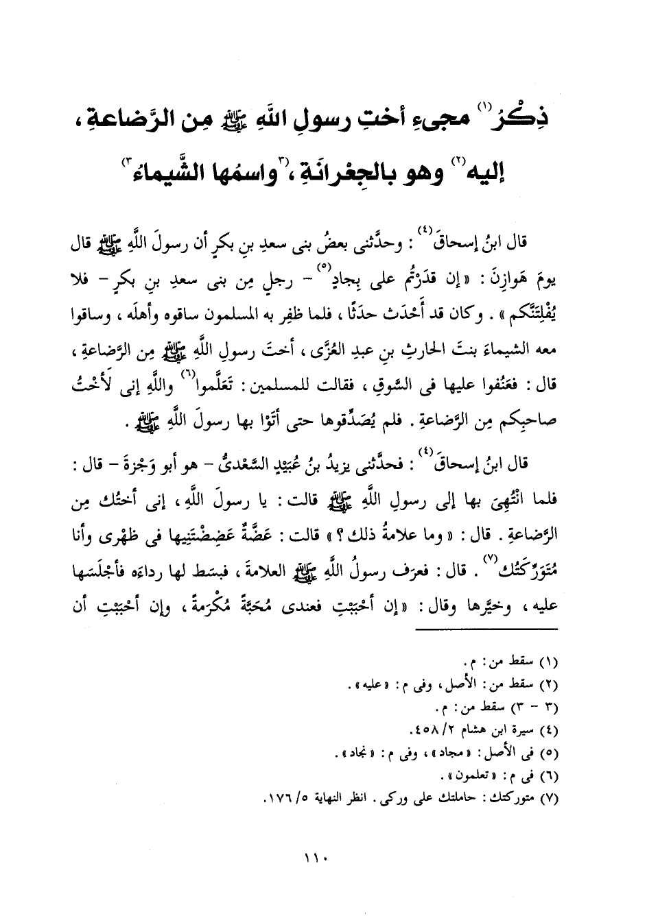 قَالَ ابْنُ إِسْحَاقَ: وَحَدَّثَنِي بَعْضُ بَنِي سَعْدِ بْنِ بَكْرٍ «أَنَّ رَسُولَ اللَّهِ صَلَّى اللَّهُ عَلَيْهِ وَسَلَّمَ قَالَ يَوْمَ هَوَازِنَ: " إِنْ قَدَرْتُمْ عَلَى بِجَادٍ - رَجُلٍ مَنْ بَنِي سَعْدِ بْنِ بَكْرٍ - فَلَا يُفْلِتَنَّكُمْ ". وَكَانَ قَدْ أَحْدَثَ حَدَثًا، فَلَمَّا ظَفِرَ بِهِ الْمُسْلِمُونَ سَاقُوهُ وَأَهْلَهُ، وَسَاقُوا مَعَهُ الشَّيْمَاءَ بِنْتَ الْحَارِثِ بْنِ عَبْدِ الْعُزَّى، أُخْتَ رَسُولِ اللَّهِ صَلَّى اللَّهُ عَلَيْهِ وَسَلَّمَ مِنَ الرَّضَاعَةِ، قَالَ: فَعَنَفُوا عَلَيْهَا فِي السُّوقِ، فَقَالَتْ لِلْمُسْلِمِينَ: تَعْلَمُوا وَاللَّهِ إِنِّي لَأُخْتُ صَاحِبِكُمْ مِنَ الرَّضَاعَةِ. فَلَمْ يُصَدِّقُوهَا حَتَّى أَتَوْا بِهَا رَسُولَ اللَّهِ صَلَّى اللَّهُ عَلَيْهِ وَسَلَّمَ.» .