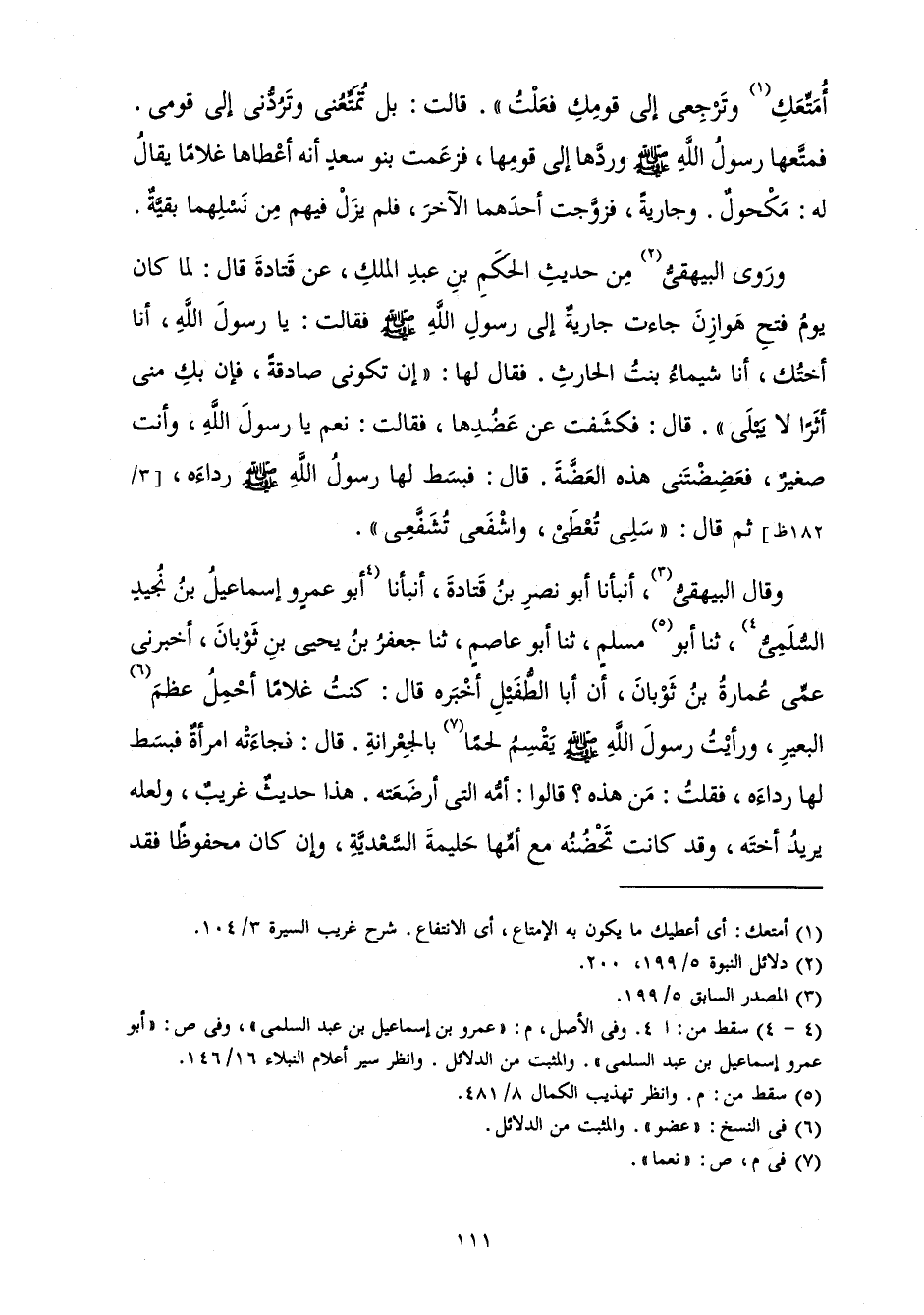 أُمَتِّعَكِ وَتَرْجِعِي إِلَى قَوْمِكِ فَعَلْتُ ". قَالَتْ: بَلْ تُمَتِّعُنِي وَتَرُدُّنِي إِلَى قَوْمِي. فَمَتَّعَهَا رَسُولُ اللَّهِ صَلَّى اللَّهُ عَلَيْهِ وَسَلَّمَ وَرَدَّهَا إِلَى قَوْمِهَا، فَزَعَمَتْ بَنُو سَعْدٍ أَنَّهُ أَعْطَاهَا غُلَامًا يُقَالُ لَهُ: مَكْحُولٌ. وَجَارِيَةً، فَزَوَّجَتْ أَحَدَهُمَا الْآخَرَ، فَلَمْ يَزَلْ فِيهِمْ مِنْ نَسْلِهِمَا بَقِيَّةٌ.» .