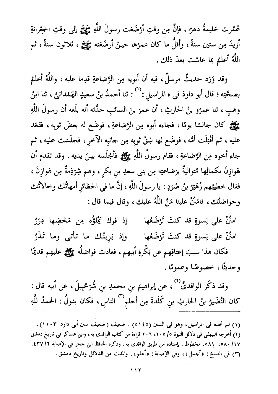 وَقَدْ وَرَدَ حَدِيثٌ مُرْسَلٌ، فِيهِ أَنَّ أَبَوَيْهِ مِنَ الرَّضَاعَةِ قَدِمَا عَلَيْهِ، وَاللَّهُ أَعْلَمُ بِصِحَّتِهِ; قَالَ أَبُو دَاوُدَ فِي " الْمَرَاسِيلِ ": ثَنَا أَحْمَدُ بْنُ سَعِيدٍ الْهَمْدَانِيُّ ثَنَا ابْنُ وَهْبٍ ثَنَا عَمْرُو بْنُ الْحَارِثِ أَنَّ عُمَرَ بْنَ السَّائِبِ حَدَّثَهُ أَنَّهُ بَلَغَهُ «أَنَّ رَسُولَ اللَّهِ صَلَّى اللَّهُ عَلَيْهِ وَسَلَّمَ كَانَ جَالِسًا يَوْمًا، فَجَاءَهُ أَبُوهُ مِنَ الرَّضَاعَةِ، فَوَضَعَ لَهُ بَعْضَ ثَوْبِهِ، فَقَعَدَ عَلَيْهِ، ثُمَّ أَقْبَلَتْ أُمُّهُ، فَوَضَعَ لَهَا شِقَّ ثَوْبِهِ مِنْ جَانِبِهِ الْآخَرِ، فَجَلَسَتْ عَلَيْهِ، ثُمَّ جَاءَ أَخُوهُ مِنَ الرَّضَاعَةِ، فَقَامَ رَسُولُ اللَّهِ صَلَّى اللَّهُ عَلَيْهِ وَسَلَّمَ فَأَجْلَسَهُ بَيْنَ يَدَيْهِ» وَقَدْ تَقَدَّمَ أَنَّ هَوَازِنَ بِكَمَالِهَا مُتَوَالِيَةٌ بِرَضَاعَتِهِ مِنْ بَنِي سَعْدِ بْنِ بَكْرٍ، وَهُمْ شِرْذِمَةٌ مِنْ هَوَازِنَ، فَقَالَ خَطِيبُهُمْ زُهَيْرُ بْنُ صُرَدٍ: يَا رَسُولَ اللَّهِ، إِنَّ مَا فِي الْحَظَائِرِ أُمَّهَاتُكَ وَخَالَاتُكَ وَحَوَاضِنُكَ فَامْنُنْ عَلَيْنَا مَنَّ اللَّهُ عَلَيْكَ، وَقَالَ فِيمَا قَالَ: