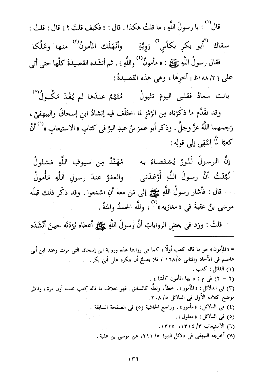 فَقَالَ رَسُولُ اللَّهِ صَلَّى اللَّهُ عَلَيْهِ وَسَلَّمَ: " مَأْمُونٌ وَاللَّهِ ". ثُمَّ أَنْشَدَهُ الْقَصِيدَةَ كُلَّهَا حَتَّى أَتَى عَلَى آخِرِهَا،» وَهِيَ هَذِهِ الْقَصِيدَةُ: