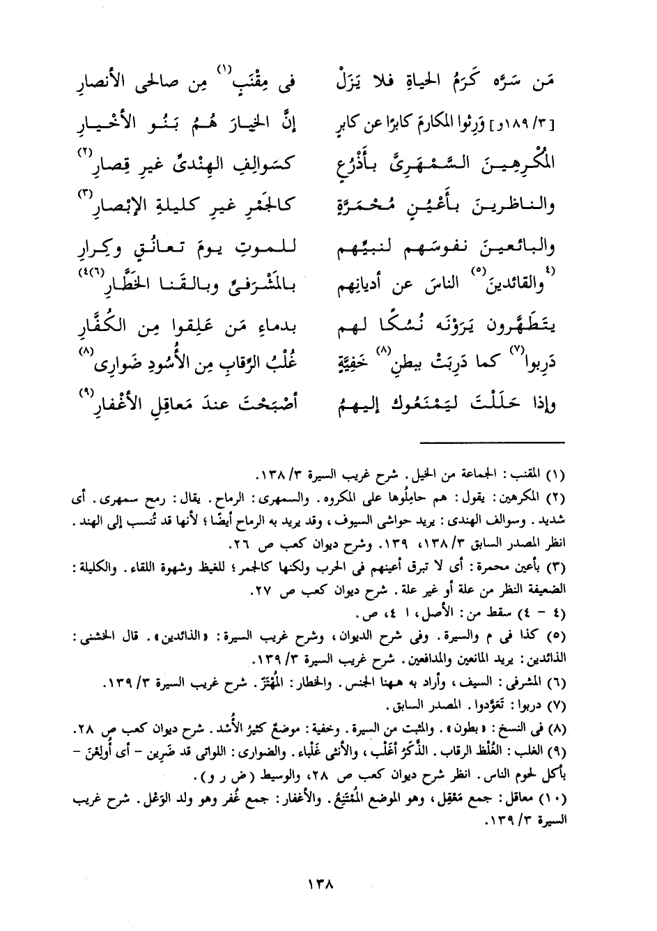 مَنْ سَرَّهُ كَرَمُ الْحَيَاةِ فَلَا يَزَلْ ... فِي مِقْنَبٍ مِنْ صَالِحِي الْأَنْصَارِ