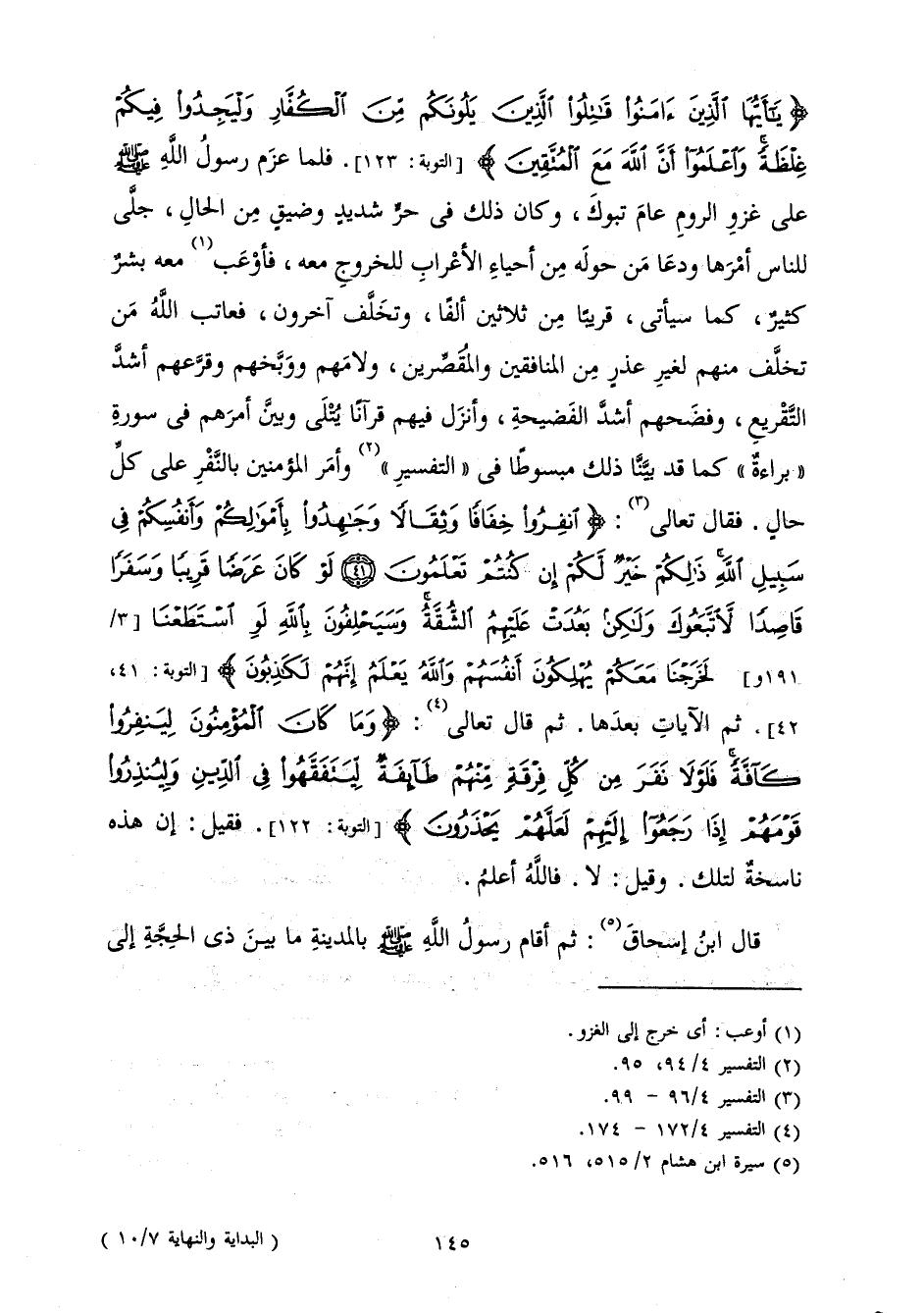 {يَا أَيُّهَا الَّذِينَ آمَنُوا قَاتِلُوا الَّذِينَ يَلُونَكُمْ مِنَ الْكُفَّارِ وَلْيَجِدُوا فِيكُمْ غِلْظَةً وَاعْلَمُوا أَنَّ اللَّهَ مَعَ الْمُتَّقِينَ} [التوبة: 123] (التَّوْبَةِ: 123) فَلَمَّا عَزَمَ رَسُولُ اللَّهِ صَلَّى اللَّهُ عَلَيْهِ وَسَلَّمَ عَلَى غَزْوِ الرُّومِ عَامَ تَبُوكَ وَكَانَ ذَلِكَ فِي حَرٍّ شَدِيدٍ وَضِيقٍ مِنَ الْحَالِ، جَلَّى لِلنَّاسِ أَمْرَهَا وَدَعَا مَنْ حَوْلَهُ مِنْ أَحْيَاءِ الْأَعْرَابِ لِلْخُرُوجِ مَعَهُ، فَأَوْعَبَ مَعَهُ بَشَرٌ كَثِيرٌ، كَمَا سَيَأْتِي، قَرِيبًا مِنْ ثَلَاثِينَ أَلْفًا، وَتَخَلَّفَ آخَرُونَ، فَعَاتَبَ اللَّهُ مَنْ تَخَلَّفَ مِنْهُمْ لِغَيْرِ عُذْرٍ مِنَ الْمُنَافِقِينَ وَالْمُقَصِّرِينَ، وَلَامَهُمْ وَوَبَّخَهُمْ وَقَرَّعَهُمْ أَشَدَّ التَّقْرِيعِ، وَفَضَحَهُمْ أَشَدَّ الْفَضِيحَةِ، وَأَنْزَلَ فِيهِمْ قُرْآنًا يُتْلَى وَبَيَّنَ أَمْرَهُمْ فِي سُورَةِ " بَرَاءَةَ " كَمَا قَدْ بَيَّنَّا ذَلِكَ مَبْسُوطًا فِي " التَّفْسِيرِ " وَأَمَرَ الْمُؤْمِنِينَ بِالنَّفْرِ عَلَى كُلِّ حَالٍ. فَقَالَ تَعَالَى: {انْفِرُوا خِفَافًا وَثِقَالًا وَجَاهِدُوا بِأَمْوَالِكُمْ وَأَنْفُسِكُمْ فِي سَبِيلِ اللَّهِ ذَلِكُمْ خَيْرٌ لَكُمْ إِنْ كُنْتُمْ تَعْلَمُونَ لَوْ كَانَ عَرَضًا قَرِيبًا وَسَفَرًا قَاصِدًا لَاتَّبَعُوكَ وَلَكِنْ بَعُدَتْ عَلَيْهِمُ الشُّقَّةُ وَسَيَحْلِفُونَ بِاللَّهِ لَوِ اسْتَطَعْنَا لَخَرَجْنَا مَعَكُمْ يُهْلِكُونَ أَنْفُسَهُمْ وَاللَّهُ يَعْلَمُ إِنَّهُمْ لَكَاذِبُونَ} [التوبة: 41] ثُمَّ الْآيَاتِ بَعْدَهَا. ثُمَّ قَالَ تَعَالَى: {وَمَا كَانَ الْمُؤْمِنُونَ لِيَنْفِرُوا كَافَّةً فَلَوْلَا نَفَرَ مِنْ كُلِّ فِرْقَةٍ مِنْهُمْ طَائِفَةٌ لِيَتَفَقَّهُوا فِي الدِّينِ وَلِيُنْذِرُوا قَوْمَهُمْ إِذَا رَجَعُوا إِلَيْهِمْ لَعَلَّهُمْ يَحْذَرُونَ} [التوبة: 122] فَقِيلَ: إِنَّ هَذِهِ نَاسِخَةٌ لِتِلْكَ. وَقِيلَ: لَا. فَاللَّهُ أَعْلَمُ.
