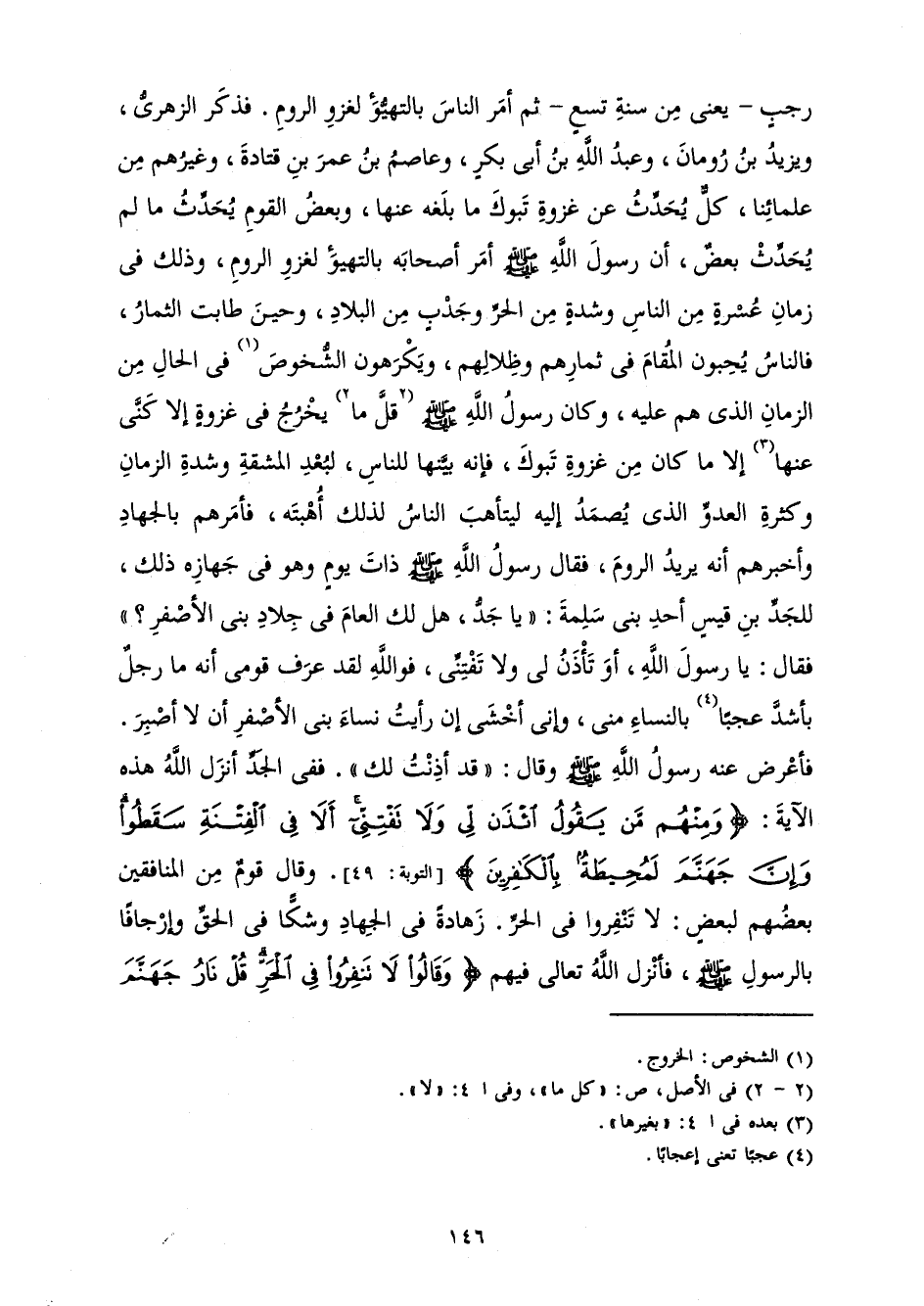 رَجَبٍ - يَعْنِي مِنْ سَنَةِ تِسْعٍ - ثُمَّ أَمَرَ النَّاسَ بِالتَّهَيُّؤِ لِغَزْوِ الرُّومِ. فَذَكَرَ الزُّهْرِيُّ وَيَزِيدُ بْنُ رُومَانَ وَعَبْدُ اللَّهِ بْنُ أَبِي بَكْرٍ وَعَاصِمُ بْنُ عُمَرَ بْنِ قَتَادَةَ وَغَيْرُهُمْ مِنْ عُلَمَائِنَا، كَلٌّ يُحَدِّثُ عَنْ غَزْوَةِ تَبُوكَ مَا بَلَغَهُ عَنْهَا، وَبَعْضُ الْقَوْمِ يُحَدِّثُ مَا لَمْ يُحَدِّثْ بَعْضٌ، أَنَّ رَسُولَ اللَّهِ صَلَّى اللَّهُ عَلَيْهِ وَسَلَّمَ أَمَرَ أَصْحَابَهُ بِالتَّهَيُّؤِ لِغَزْوِ الرُّومِ، وَذَلِكَ فِي زَمَانِ عُسْرَةٍ مِنَ النَّاسِ وَشِدَّةٍ مِنَ الْحَرِّ وَجَدْبٍ مِنَ الْبِلَادِ، وَحِينَ طَابَتِ الثِّمَارُ، فَالنَّاسُ يُحِبُّونَ الْمُقَامَ فِي ثِمَارِهِمْ وَظِلَالِهِمْ، وَيَكْرَهُونَ الشُّخُوصَ فِي الْحَالِ مِنَ الزَّمَانِ الَّذِي هُمْ عَلَيْهِ، وَكَانَ رَسُولُ اللَّهِ صَلَّى اللَّهُ عَلَيْهِ وَسَلَّمَ قَلَّ مَا يَخْرُجُ فِي غَزْوَةٍ إِلَّا كَنَّى عَنْهَا إِلَّا مَا كَانَ مِنْ غَزْوَةِ تَبُوكَ فَإِنَّهُ بَيَّنَهَا لِلنَّاسِ، لِبُعْدِ الْمَشَقَّةِ وَشِدَّةِ الزَّمَانِ وَكَثْرَةِ الْعَدُوِّ الَّذِي يُصْمَدُ إِلَيْهِ لِيَتَأَهَّبَ النَّاسُ لِذَلِكَ أُهْبَتَهُ، فَأَمَرَهُمْ بِالْجِهَادِ وَأَخْبَرَهُمْ أَنَّهُ يُرِيدُ الرُّومَ، فَقَالَ رَسُولُ اللَّهِ صَلَّى اللَّهُ عَلَيْهِ وَسَلَّمَ ذَاتَ يَوْمٍ وَهُوَ فِي جِهَازِهِ ذَلِكَ لِلْجَدِّ بْنِ قَيْسٍ أَحَدِ بَنِي سَلِمَةَ: " يَا جَدُّ هَلْ لَكَ الْعَامَ فِي جِلَادِ بَنِي الْأَصْفَرِ؟ " فَقَالَ: يَا رَسُولَ اللَّهِ، أَوَتَأْذَنُ لِي وَلَا تَفْتِنِّي، فَوَاللَّهِ لَقَدْ عَرَفَ قَوْمِي أَنَّهُ مَا رَجُلٌ بِأَشَدَّ عَجَبًا بِالنِّسَاءِ مِنِّي، وَإِنِّي أَخْشَى إِنْ رَأَيْتُ نِسَاءَ بَنِي الْأَصْفَرِ أَنْ لَا أَصْبِرَ. فَأَعْرَضَ عَنْهُ رَسُولُ اللَّهِ صَلَّى اللَّهُ عَلَيْهِ وَسَلَّمَ وَقَالَ: " قَدْ أَذِنْتُ لَكَ ". فَفِي الْجَدِّ أَنْزَلَ اللَّهُ هَذِهِ الْآيَةَ: {وَمِنْهُمْ مَنْ يَقُولُ ائْذَنْ لِي وَلَا تَفْتِنِّي أَلَا فِي الْفِتْنَةِ سَقَطُوا وَإِنَّ جَهَنَّمَ لَمُحِيطَةٌ بِالْكَافِرِينَ} [التوبة: 49] (التَّوْبَةِ: 49) وَقَالَ قَوْمٌ مِنَ الْمُنَافِقِينَ بَعْضُهُمْ لِبَعْضٍ: لَا تَنْفِرُوا فِي الْحَرِّ. زَهَادَةً فِي الْجِهَادِ وَشَكًّا فِي الْحَقِّ وَإِرْجَافًا بِالرَّسُولِ صَلَّى اللَّهُ عَلَيْهِ وَسَلَّمَ، فَأَنْزَلَ اللَّهُ تَعَالَى فِيهِمْ {" وَقَالُوا لَا تَنْفِرُوا فِي الْحَرِّ قُلْ نَارُ جَهَنَّمَ أَشَدُّ حَرًّا لَوْ كَانُوا يَفْقَهُونَ فَلْيَضْحَكُوا قَلِيلًا وَلْيَبْكُوا كَثِيرًا جَزَاءً بِمَا كَانُوا يَكْسِبُونَ "} [التوبة: 81] (التَّوْبَةِ: 81، 82) .