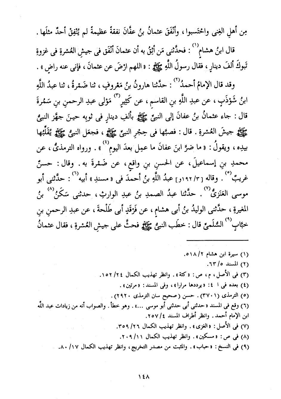 وَقَدْ قَالَ الْإِمَامُ أَحْمَدُ: حَدَّثَنَا هَارُونُ بْنُ مَعْرُوفٍ ثنا ضَمْرَةُ ثنا عَبْدُ اللَّهِ بْنُ شَوْذَبٍ عَنْ عَبْدِ اللَّهِ بْنِ الْقَاسِمِ عَنْ كَثِيرٍ مَوْلَى عَبْدِ الرَّحْمَنِ بْنِ سَمُرَةَ قَالَ: «جَاءَ عُثْمَانُ بْنُ عَفَّانَ إِلَى النَّبِيِّ صَلَّى اللَّهُ عَلَيْهِ وَسَلَّمَ بِأَلْفِ دِينَارٍ فِي ثَوْبِهِ حِينَ جَهَّزَ النَّبِيُّ صَلَّى اللَّهُ عَلَيْهِ وَسَلَّمَ جَيْشَ الْعُسْرَةِ. قَالَ: فَصَبَّهَا فِي حِجْرِ النَّبِيِّ صَلَّى اللَّهُ عَلَيْهِ وَسَلَّمَ، فَجَعَلَ النَّبِيُّ صَلَّى اللَّهُ عَلَيْهِ وَسَلَّمَ يُقَلِّبُهَا بِيَدِهِ، وَيَقُولُ: " مَا ضَرَّ ابْنُ عَفَّانَ مَا عَمِلَ بَعْدَ الْيَوْمِ» وَرَوَاهُ التِّرْمِذِيُّ عَنْ مُحَمَّدِ بْنِ إِسْمَاعِيلَ عَنِ الْحَسَنِ بْنِ وَاقِعٍ عَنْ ضَمْرَةَ بِهِ. وَقَالَ: حَسَنٌ غَرِيبٌ. وَقَالَهُ عَبْدُ اللَّهِ بْنُ أَحْمَدَ فِي " مُسْنَدِ " أَبِيهِ: حَدَّثَنِي أَبُو مُوسَى الْعَنَزِيُّ. حَدَّثَنَا عَبْدُ الصَّمَدِ بْنُ عَبْدِ الْوَارِثِ حَدَّثَنِي سَكَنُ بْنُ الْمُغِيرَةِ حَدَّثَنِي الْوَلِيدُ بْنُ أَبِي هِشَامٍ عَنْ فَرْقَدٍ أَبِي طَلْحَةَ عَنْ عَبْدِ الرَّحْمَنِ بْنِ خَبَّابٍ السُّلَمِيِّ قَالَ: «خَطَبَ النَّبِيُّ صَلَّى اللَّهُ عَلَيْهِ وَسَلَّمَ فَحَثَّ عَلَى جَيْشِ الْعُسْرَةِ، فَقَالَ عُثْمَانُ