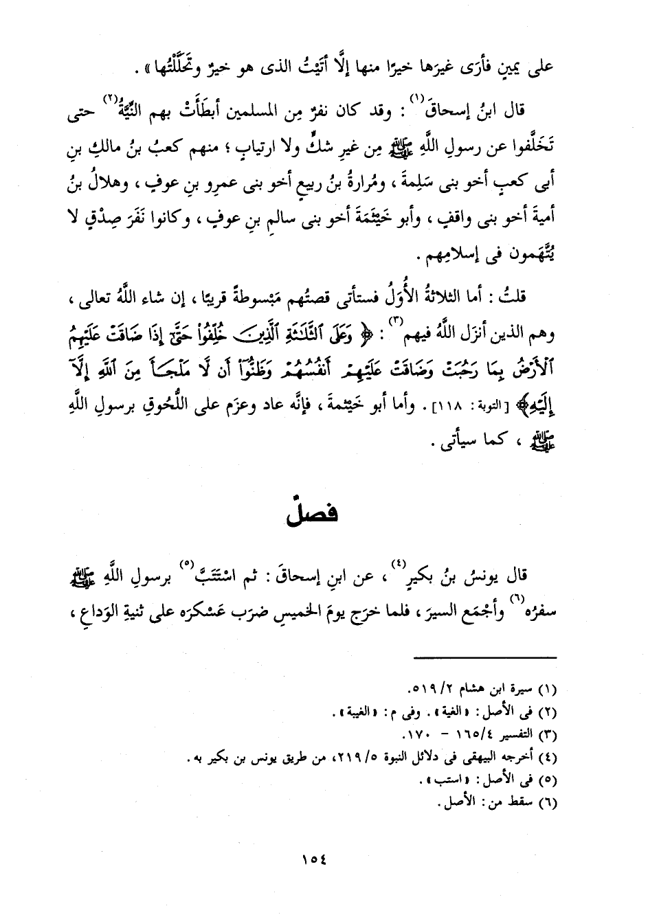 قَالَ ابْنُ إِسْحَاقَ: وَقَدْ كَانَ نَفَرٌ مِنِ الْمُسْلِمِينَ أَبْطَأَتْ بِهِمُ النِّيَّةُ حَتَّى تَخَلَّفُوا عَنْ رَسُولِ اللَّهِ صَلَّى اللَّهُ عَلَيْهِ وَسَلَّمَ مِنْ غَيْرِ شَكٍّ وَلَا ارْتِيَابٍ ; مِنْهُمْ كَعْبُ بْنُ مَالِكِ بْنِ أَبِي كَعْبٍ أَخُو بَنِي سَلِمَةَ، وَمُرَارَةُ بْنُ رَبِيعٍ أَخُو بَنِي عَمْرِو بْنِ عَوْفٍ، وَهِلَالُ بْنُ أُمَيَّةَ أَخُو بَنِي وَاقِفٍ، وَأَبُو خَيْثَمَةَ أَخُو بَنِي سَالِمِ بْنِ عَوْفٍ، وَكَانُوا نَفَرَ صِدْقٍ لَا يُتَّهَمُونَ فِي إِسْلَامِهِمْ.
