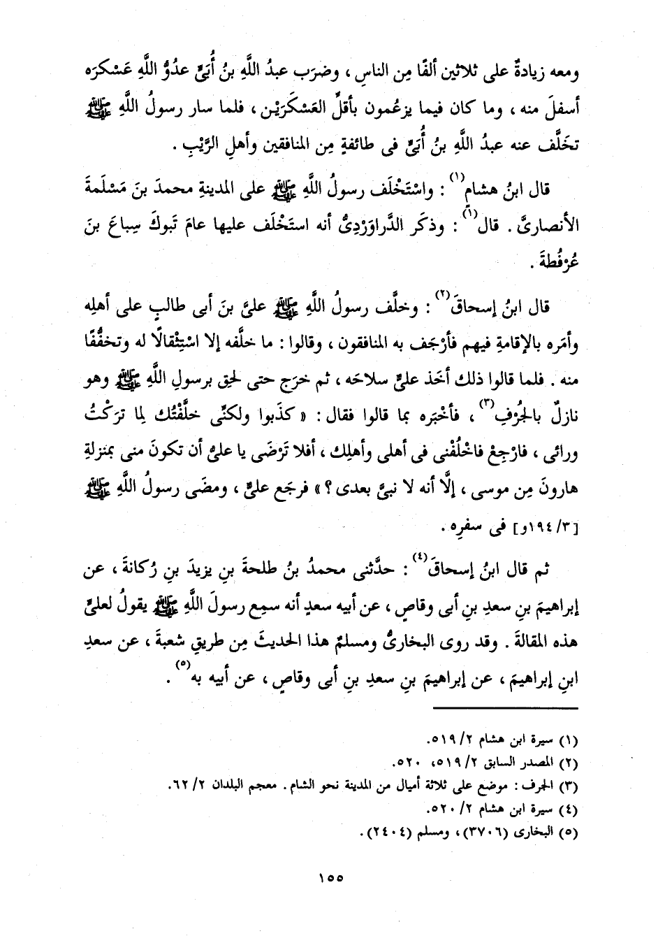 قَالَ ابْنُ إِسْحَاقَ: وَخَلَّفَ رَسُولُ اللَّهِ صَلَّى اللَّهُ عَلَيْهِ وَسَلَّمَ عَلِيَّ بْنَ أَبِي طَالِبٍ عَلَى أَهْلِهِ وَأَمَرَهُ بِالْإِقَامَةِ فِيهِمْ فَأَرْجَفَ بِهِ الْمُنَافِقُونَ، وَقَالُوا: مَا خَلَّفَهُ إِلَّا اسْتِثْقَالًا لَهُ وَتَخَفُّفًا مِنْهُ. فَلَمَّا قَالُوا ذَلِكَ أَخَذَ عَلِيٌّ سِلَاحَهُ، ثُمَّ خَرَجَ حَتَّى لَحِقَ بِرَسُولِ اللَّهِ صَلَّى اللَّهُ عَلَيْهِ وَسَلَّمَ وَهُوَ نَازِلٌ بِالْجُرْفِ، فَأَخْبَرَهُ بِمَا قَالُوا فَقَالَ «: كَذَبُوا وَلَكِنِّي خَلَّفْتُكَ لِمَا تَرَكْتُ وَرَائِي، فَارْجِعْ فَاخْلُفْنِي فِي أَهْلِي وَأَهْلِكَ، أَفَلَا تَرْضَى يَا عَلِيُّ أَنْ تَكُونَ مِنِّي بِمَنْزِلَةِ هَارُونَ مِنْ مُوسَى، إِلَّا أَنَّهُ لَا نَبِيَّ بَعْدِي» ؟ فَرَجَعَ عَلِيٌّ وَمَضَى رَسُولُ اللَّهِ صَلَّى اللَّهُ عَلَيْهِ وَسَلَّمَ فِي سَفَرِهِ.