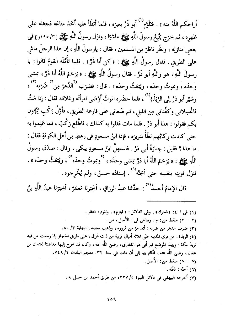 أَرَاحَكُمُ اللَّهُ مِنْهُ ". فَتَلَوَّمَ أَبُو ذَرٍّ بَعِيرَهُ، فَلَمَّا أَبْطَأَ عَلَيْهِ أَخَذَ مَتَاعَهُ فَجَعَلَهُ عَلَى ظَهْرِهِ، ثُمَّ خَرَجَ يَتَّبِعُ رَسُولَ اللَّهِ صَلَّى اللَّهُ عَلَيْهِ وَسَلَّمَ مَاشِيًا، وَنَزَلَ رَسُولُ اللَّهِ صَلَّى اللَّهُ عَلَيْهِ وَسَلَّمَ فِي بَعْضِ مَنَازِلِهِ، وَنَظَرَ نَاظِرٌ مِنَ الْمُسْلِمِينَ، فَقَالَ: يَا رَسُولَ اللَّهِ، إِنَّ هَذَا الرَّجُلَ مَاشٍ عَلَى الطَّرِيقِ. فَقَالَ رَسُولُ اللَّهِ صَلَّى اللَّهُ عَلَيْهِ وَسَلَّمَ: " كُنْ أَبَا ذَرٍّ ". فَلَمَّا تَأَمَّلَهُ الْقَوْمُ قَالُوا: يَا رَسُولَ اللَّهِ، هُوَ وَاللَّهِ أَبُو ذَرٍّ. فَقَالَ رَسُولُ اللَّهِ صَلَّى اللَّهُ عَلَيْهِ وَسَلَّمَ: " يَرْحَمُ اللَّهُ أَبَا ذَرٍّ يَمْشِي وَحْدَهُ، وَيَمُوتُ وَحْدَهُ، وَيُبْعَثُ وَحْدَهُ» . قَالَ: فَضَرَبَ الدَّهْرُ مِنْ ضَرْبِهِ، وَسُيِّرَ أَبُو ذَرٍّ إِلَى الرَّبَذَةِ فَلَمَّا حَضَرَهُ الْمَوْتُ أَوْصَى امْرَأَتَهُ وَغُلَامَهُ فَقَالَ: إِذَا مِتُّ فَاغْسِلَانِي وَكَفِّنَانِي مِنَ اللَّيْلِ، ثُمَّ ضَعَانِي عَلَى قَارِعَةِ الطَّرِيقِ، فَأَوَّلُ رَكْبٍ يَمُرُّونَ بِكُمْ فَقُولُوا: هَذَا أَبُو ذَرٍّ. فَلَمَّا مَاتَ فَعَلُوا بِهِ كَذَلِكَ، فَاطَّلَعَ رَكْبٌ، فَمَا عَلِمُوا بِهِ حَتَّى كَادَتْ رِكَابُهُمْ تَطَأُ سَرِيرَهُ، فَإِذَا ابْنُ مَسْعُودٍ فِي رَهْطٍ مِنْ أَهْلِ الْكُوفَةِ فَقَالَ: مَا هَذَا؟ فَقِيلَ: جِنَازَةُ أَبِي ذَرٍّ. فَاسْتَهَلَّ ابْنُ مَسْعُودٍ يَبْكِي، وَقَالَ: صَدَقَ رَسُولُ اللَّهِ صَلَّى اللَّهُ عَلَيْهِ وَسَلَّمَ: «يَرْحَمُ اللَّهُ أَبَا ذَرٍّ يَمْشِي وَحْدَهُ، وَيَمُوتُ وَحْدَهُ، وَيُبْعَثُ وَحْدَهُ» . فَنَزَلَ فَوَلِيَهُ بِنَفْسِهِ حَتَّى أَجَنَّهُ. إِسْنَادُهُ حَسَنٌ، وَلَمْ يُخْرِجُوهُ.