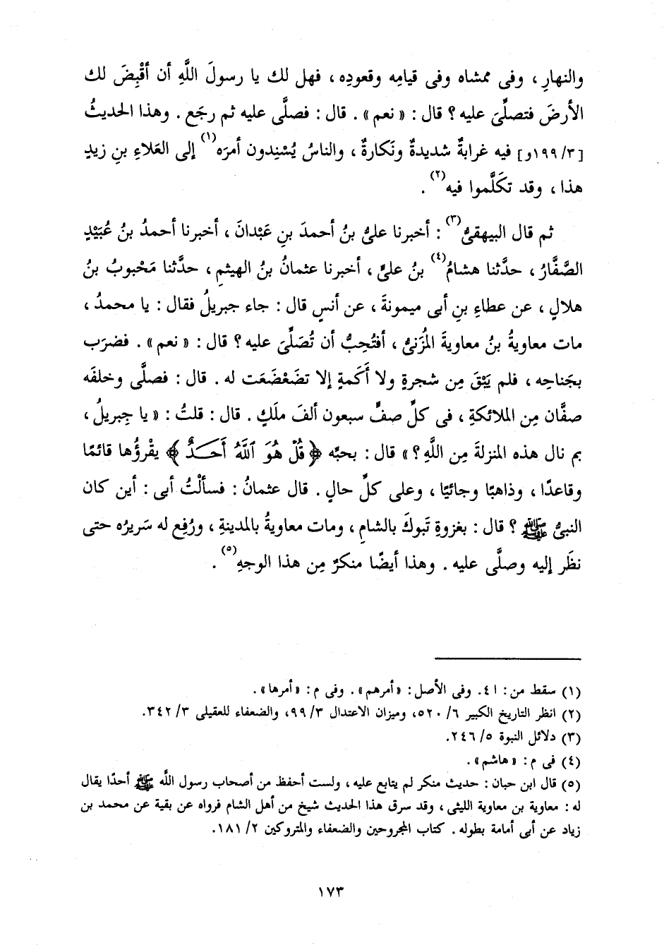 ثُمَّ قَالَ الْبَيْهَقِيُّ: أَخْبَرَنَا عَلِيُّ بْنُ أَحْمَدَ بْنِ عَبْدَانَ أَخْبَرَنَا أَحْمَدُ بْنُ عُبَيْدٍ الصَّفَّارُ حَدَّثَنَا هَاشِمُ بْنُ عَلِيٍّ أَخْبَرَنَا عُثْمَانُ بْنُ الْهَيْثَمِ حَدَّثَنَا مَحْبُوبُ بْنُ هِلَالٍ عَنْ عَطَاءِ بْنِ أَبِي مَيْمُونَةَ عَنْ أَنَسٍ قَالَ: «جَاءَ جِبْرِيلُ فَقَالَ: يَا مُحَمَّدُ، مَاتَ مُعَاوِيَةُ بْنُ مُعَاوِيَةَ الْمُزَنِيُّ أَفَتُحِبُّ أَنْ تُصَلِّيَ عَلَيْهِ؟ قَالَ: " نَعَمْ ". فَضَرَبَ بِجَنَاحِهِ، فَلَمْ يَبْقَ مِنْ شَجَرَةٍ وَلَا أَكَمَةٍ إِلَّا تَضَعْضَعَتْ لَهُ. قَالَ: فَصَلَّى وَخَلْفَهُ صَفَّانِ مِنَ الْمَلَائِكَةِ، فِي كُلِّ صَفٍّ سَبْعُونَ أَلْفَ مَلَكٍ. قَالَ: قُلْتُ: " يَا جِبْرِيلُ، بِمَا نَالَ هَذِهِ الْمَنْزِلَةَ مِنَ اللَّهِ؟ " قَالَ: بِحُبِّهِ {قُلْ هُوَ اللَّهُ أَحَدٌ} [الإخلاص: 1] يَقْرَؤُهَا قَائِمًا وَقَاعِدًا، وَذَاهِبًا وَجَائِيًا، وَعَلَى كُلِّ حَالٍ. قَالَ عُثْمَانُ: فَسَأَلْتُ أَبِي: أَيْنَ كَانَ النَّبِيُّ صَلَّى اللَّهُ عَلَيْهِ وَسَلَّمَ؟ قَالَ: بِغَزْوَةِ تَبُوكَ بِالشَّامِ، وَمَاتَ مُعَاوِيَةُ بِالْمَدِينَةِ، وَرُفِعَ لَهُ سَرِيرُهُ حَتَّى نَظَرَ إِلَيْهِ وَصَلَّى عَلَيْهِ» . وَهَذَا أَيْضًا مُنْكَرٌ مِنْ هَذَا الْوَجْهِ.