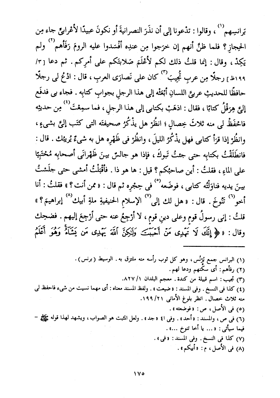 بَرَانِسِهِمْ، وَقَالُوا: تَدْعُونَا إِلَى أَنْ نَذَرَ النَّصْرَانِيَّةَ أَوْ نَكُونَ عَبِيدًا لِأَعْرَابِيٍّ جَاءَ مِنَ الْحِجَازِ؟ فَلَمَّا ظَنَّ أَنَّهُمْ إِنْ خَرَجُوا مِنْ عِنْدِهِ أَفْسَدُوا عَلَيْهِ الرُّومَ رَفَأَهُمْ وَلَمْ يَكَدْ، وَقَالَ: إِنَّمَا قُلْتُ ذَلِكَ لَكُمْ لِأَعْلَمَ صَلَابَتَكُمْ عَلَى أَمْرِكُمْ. ثُمَّ دَعَا رَجُلًا مِنْ عَرَبِ تُجِيبَ كَانَ عَلَى نَصَارَى الْعَرَبِ، قَالَ: ادْعُ لِي رَجُلًا حَافِظًا لِلْحَدِيثِ عَرَبِيَّ اللِّسَانِ أَبْعَثُهُ إِلَى هَذَا الرَّجُلِ بِجَوَابِ كِتَابِهِ. فَجَاءَ بِي فَدَفَعَ إِلَيَّ هِرَقْلُ كِتَابًا، فَقَالَ: اذْهَبْ بِكِتَابِي إِلَى هَذَا الرَّجُلِ، فَمَا سَمِعْتَ مِنْ حَدِيثِهِ فَاحْفَظْ لِي مِنْهُ ثَلَاثَ خِصَالٍ ; انْظُرْ هَلْ يَذْكُرُ صَحِيفَتَهُ الَّتِي كَتَبَ إِلَيَّ بِشَيْءٍ، وَانْظُرْ إِذَا قَرَأَ كِتَابِي فَهَلْ يَذْكُرُ اللَّيْلَ، وَانْظُرْ فِي ظَهْرِهِ هَلْ بِهِ شَيْءٌ يُرِيبُكَ. قَالَ: فَانْطَلَقْتُ بِكِتَابِهِ حَتَّى جِئْتُ تَبُوكَ، فَإِذَا هُوَ جَالِسٌ بَيْنَ ظَهْرَانِي أَصْحَابِهِ مُحْتَبِيًا عَلَى الْمَاءِ، فَقُلْتُ: أَيْنَ صَاحِبُكُمْ؟ قِيلَ: هَا هُوَ ذَا. فَأَقْبَلْتُ أَمْشِي حَتَّى جَلَسْتُ بَيْنَ يَدَيْهِ فَنَاوَلْتُهُ كِتَابِي، فَوَضَعَهُ فِي حِجْرِهِ ثُمَّ قَالَ: " مِمَّنْ أَنْتَ؟ " فَقُلْتُ: أَنَا أَخُو تَنُوخَ. قَالَ: " هَلْ لَكَ إِلَى الْإِسْلَامِ الْحَنِيفِيَّةِ مِلَّةِ أَبِيكَ إِبْرَاهِيمَ؟ " قُلْتُ: إِنِّي رَسُولُ قَوْمٍ وَعَلَى دِينِ قَوْمٍ، لَا أَرْجِعُ عَنْهُ حَتَّى أَرْجِعَ إِلَيْهِمْ. فَضَحِكَ وَقَالَ: {إِنَّكَ لَا تَهْدِي مَنْ أَحْبَبْتَ وَلَكِنَّ اللَّهَ يَهْدِي مَنْ يَشَاءُ وَهُوَ أَعْلَمُ بِالْمُهْتَدِينَ} [القصص: 56] (الْقَصَصِ: 56) يَا أَخَا تَنُوخَ، إِنِّي كَتَبْتُ بِكِتَابٍ إِلَى كِسْرَى فَمَزَّقَهُ، وَاللَّهُ مُمَزِّقُهُ وَمُمَزِّقُ مُلْكِهِ، وَكَتَبْتُ إِلَى النَّجَاشِيِّ بِصَحِيفَةٍ فَخَرَّقَهَا وَاللَّهُ مُخَرِّقُهُ وَمُخَرِّقُ مُلْكِهِ، وَكَتَبْتُ إِلَى صَاحِبِكَ بِصَحِيفَةٍ فَأَمْسَكَهَا، فَلَنْ يَزَالَ النَّاسُ يَجِدُونَ مِنْهُ بَأْسًا مَا دَامَ فِي الْعَيْشِ خَيْرٌ ". قُلْتُ: هَذِهِ إِحْدَى الثَّلَاثِ الَّتِي أَوْصَانِي بِهَا صَاحِبِي. فَأَخَذْتُ سَهْمًا مِنْ جَعْبَتِي فَكَتَبْتُهُ فِي جِلْدِ سَيْفِي، ثُمَّ إِنَّهُ نَاوَلَ الصَّحِيفَةَ رَجُلًا عَنْ يَسَارِهِ، قُلْتُ: مَنْ صَاحِبُ كِتَابِكُمُ الَّذِي يَقْرَأُ لَكُمْ؟ قَالُوا: مُعَاوِيَةُ. فَإِذَا فِي كِتَابِ صَاحِبِي: تَدْعُونِي إِلَى جَنَّةٍ عَرْضُهَا السَّمَاوَاتُ وَالْأَرْضُ أُعِدَّتْ لِلْمُتَّقِينَ، فَأَيْنَ النَّارُ؟ فَقَالَ رَسُولُ اللَّهِ صَلَّى اللَّهُ عَلَيْهِ وَسَلَّمَ: " سُبْحَانَ اللَّهِ! أَيْنَ اللَّيْلُ إِذَا جَاءَ النَّهَارُ؟ ! " قَالَ: فَأَخَذْتُ سَهْمًا مِنْ جَعْبَتِي فَكَتَبْتُهُ فِي جِلْدِ سَيْفِي. فَلَمَّا أَنْ فَرَغَ مِنْ قِرَاءَةِ كِتَابِي، قَالَ: " إِنَّ لَكَ حَقًّا وَإِنَّكَ رَسُولٌ، فَلَوْ وَجَدْتُ عِنْدَنَا جَائِزَةً جَوَّزْنَاكَ بِهَا، إِنَّا سُفْرٌ مُرْمِلُونَ ". قَالَ: فَنَادَاهُ رَجُلٌ مِنْ طَائِفَةِ النَّاسِ، قَالَ: أَنَا أُجَوِّزُهُ فَفَتَحَ رَحْلَهُ، فَإِذَا هُوَ يَأْتِي بِحُلَّةٍ صَفُّورِيَّةٍ فَوَضَعَهَا فِي حِجْرِي، قُلْتُ: مَنْ صَاحِبُ الْجَائِزَةِ؟ قِيلَ لِي: عُثْمَانُ. ثُمَّ قَالَ رَسُولُ اللَّهِ: " أَيُّكُمْ يُنْزِلُ هَذَا الرَّجُلَ؟ " فَقَالَ فَتًى مِنَ الْأَنْصَارِ: أَنَا. فَقَامَ الْأَنْصَارِيُّ وَقُمْتُ مَعَهُ حَتَّى إِذَا خَرَجْتُ مِنْ طَائِفَةِ الْمَجْلِسِ نَادَانِي رَسُولُ اللَّهِ فَقَالَ: " تَعَالَ يَا أَخَا تَنُوخَ ". فَأَقْبَلْتُ أَهْوِي إِلَيْهِ حَتَّى كُنْتُ قَائِم