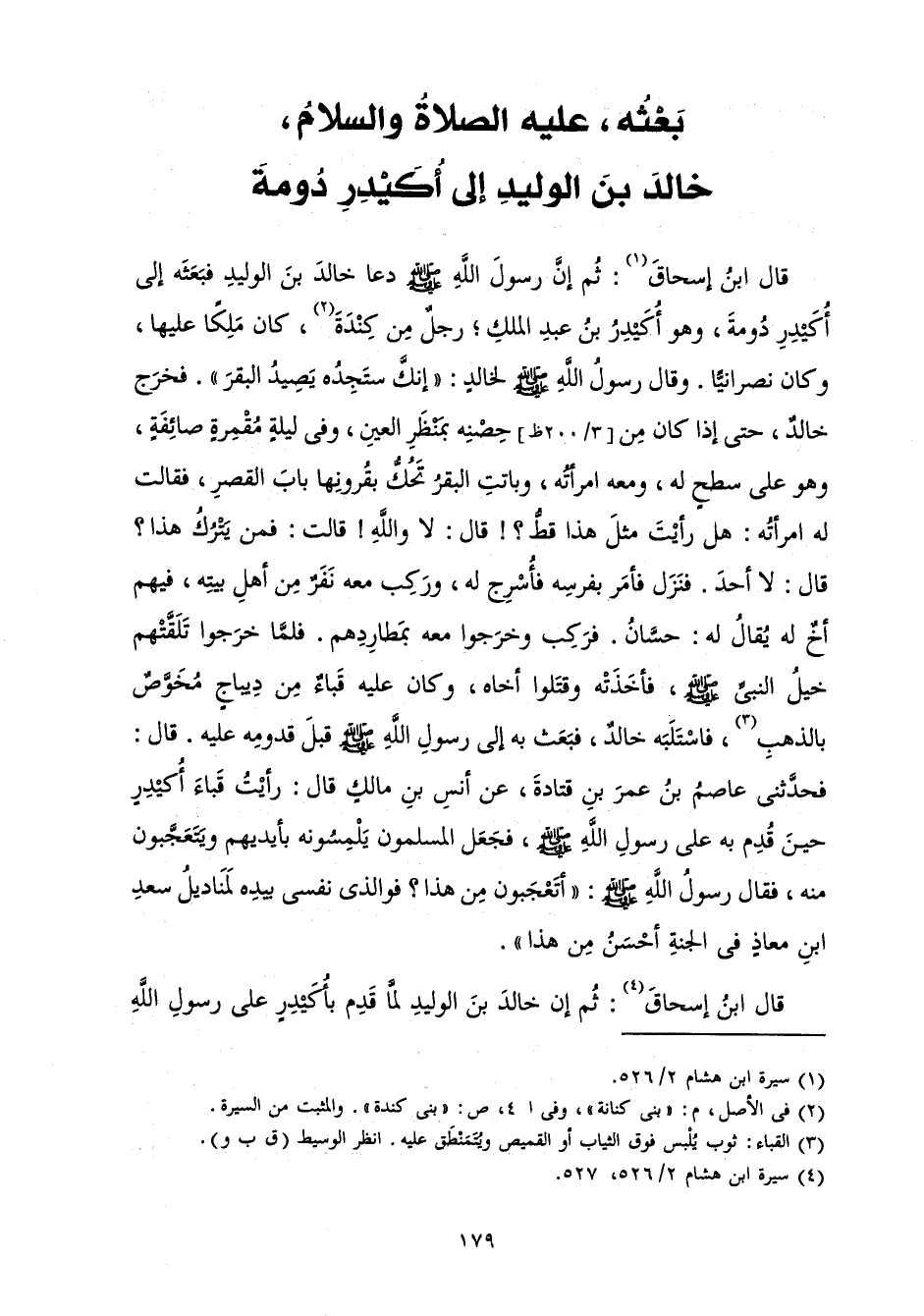 قَالَ ابْنُ إِسْحَاقَ: ثُمَّ إِنَّ رَسُولَ اللَّهِ صَلَّى اللَّهُ عَلَيْهِ وَسَلَّمَ دَعَا خَالِدَ بْنَ الْوَلِيدِ فَبَعَثَهُ إِلَى أُكَيْدِرِ دَوْمَةَ وَهُوَ أُكَيْدِرُ بْنُ عَبْدِ الْمَلِكِ ; رَجُلٌ مِنْ كِنْدَةَ، كَانَ مَلِكًا عَلَيْهَا، وَكَانَ نَصْرَانِيًّا، وَقَالَ رَسُولُ اللَّهِ صَلَّى اللَّهُ عَلَيْهِ وَسَلَّمَ لِخَالِدٍ: " إِنَّكَ سَتَجِدُهُ يَصِيدُ الْبَقَرَ ". فَخَرَجَ خَالِدٌ حَتَّى إِذَا كَانَ مِنْ حِصْنِهِ بِمَنْظَرِ الْعَيْنِ، وَفِي لَيْلَةٍ مُقْمِرَةٍ صَائِفَةٍ، وَهُوَ عَلَى سَطْحٍ لَهُ، وَمَعَهُ امْرَأَتُهُ، وَبَاتَتِ الْبَقَرُ تَحُكُّ بِقُرُونِهَا بَابَ الْقَصْرِ، فَقَالَتْ لَهُ امْرَأَتُهُ: هَلْ رَأَيْتَ مِثْلَ هَذَا قَطُّ؟ ! قَالَ لَا وَاللَّهِ! قَالَتْ: فَمَنْ يَتْرُكُ هَذَا؟ قَالَ: لَا أَحَدَ. فَنَزَلَ فَأَمَرَ بِفَرَسِهِ فَأُسْرِجَ لَهُ، وَرَكِبَ وَمَعَهُ نَفَرٌ مِنْ أَهْلِ بَيْتِهِ، فِيهِمْ أَخٌ لَهُ يُقَالُ لَهُ: حَسَّانُ. فَرَكِبَ وَخَرَجُوا مَعَهُ بِمَطَارِدِهِمْ، فَلَمَّا خَرَجُوا تَلَقَّتْهُمْ خَيْلُ النَّبِيِّ صَلَّى اللَّهُ عَلَيْهِ وَسَلَّمَ، فَأَخَذَتْهُ وَقَتَلُوا أَخَاهُ، وَكَانَ عَلَيْهِ قَبَاءٌ مِنْ دِيبَاجٍ مُخَوَّصٍ بِالذَّهَبِ، فَاسْتَلَبَهُ خَالِدٌ فَبَعَثَ بِهِ إِلَى رَسُولِ اللَّهِ صَلَّى اللَّهُ عَلَيْهِ وَسَلَّمَ قَبْلَ قُدُومِهِ عَلَيْهِ. قَالَ: فَحَدَّثَنِي عَاصِمُ بْنُ عُمَرَ بْنِ قَتَادَةَ عَنْ أَنَسِ بْنِ مَالِكٍ قَالَ: رَأَيْتُ قَبَاءَ أُكَيْدِرٍ حِينَ قُدِمَ بِهِ عَلَى رَسُولِ اللَّهِ صَلَّى اللَّهُ عَلَيْهِ وَسَلَّمَ، فَجَعَلَ الْمُسْلِمُونَ يَلْمِسُونَهُ بِأَيْدِيهِمْ وَيَتَعَجَّبُونَ مِنْهُ، فَقَالَ رَسُولُ اللَّهِ صَلَّى اللَّهُ عَلَيْهِ وَسَلَّمَ: «أَتَعْجَبُونَ مِنْ هَذَا؟ فَوَالَّذِي نَفْسِي بِيَدِهِ لَمَنَادِيلُ سَعْدِ بْنِ مُعَاذٍ فِي الْجَنَّةِ أَحْسَنُ مِنْ هَذَا» . .