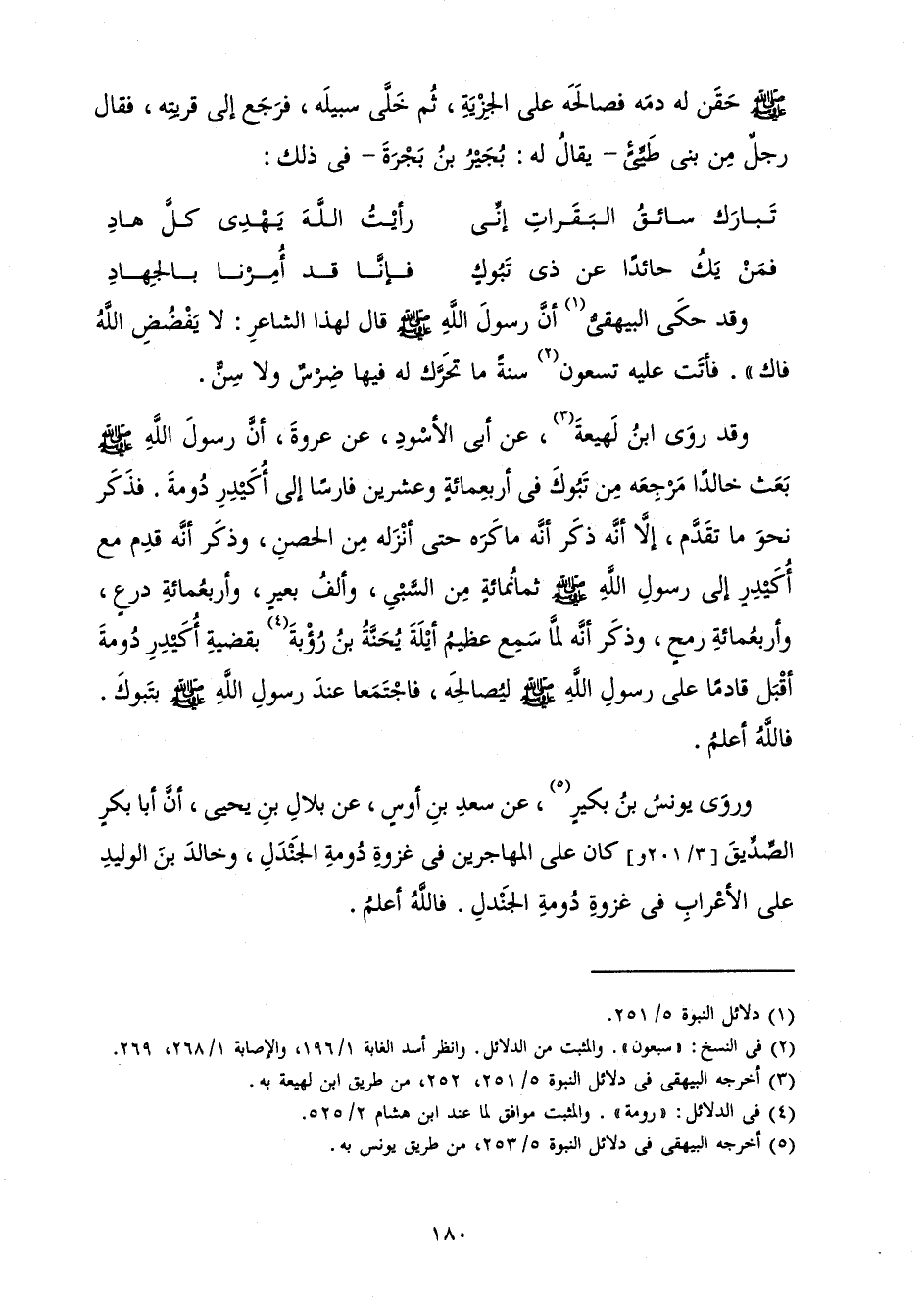 صَلَّى اللَّهُ عَلَيْهِ وَسَلَّمَ حَقَنَ لَهُ دَمَهُ فَصَالَحَهُ عَلَى الْجِزْيَةِ، ثُمَّ خَلَّى سَبِيلَهُ، فَرَجَعَ إِلَى قَرْيَتِهِ، فَقَالَ رَجُلٌ مِنْ بَنِي طَيِّئٍ - يُقَالُ لَهُ: بُجَيْرُ بْنُ بَجْرَةَ - فِي ذَلِكَ: