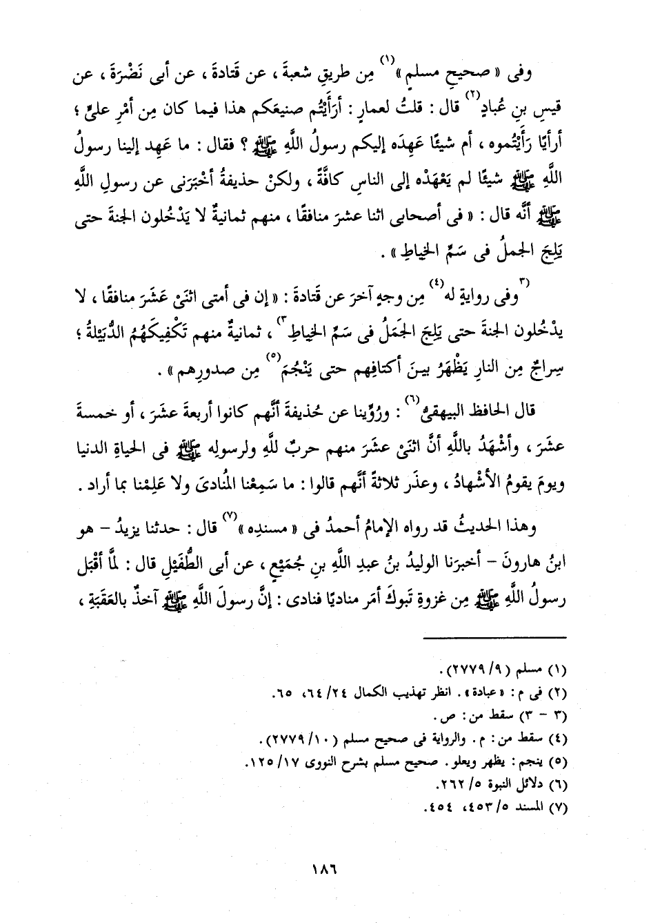 وَفِي " صَحِيحِ مُسْلِمٍ " مِنْ طَرِيقِ شُعْبَةَ عَنْ قَتَادَةَ عَنْ أَبِي نَضْرَةَ عَنْ قَيْسِ بْنِ عَبَّادٍ قَالَ: قُلْتُ لِعَمَّارٍ: أَرَأَيْتُمْ صَنِيعَكُمْ هَذَا فِيمَا كَانَ مِنْ أَمْرِ عَلِيٍّ ; أَرَأْيًا رَأَيْتُمُوهُ أَمْ شَيْئًا عَهِدَهُ إِلَيْكُمْ رَسُولُ اللَّهِ صَلَّى اللَّهُ عَلَيْهِ وَسَلَّمَ؟ فَقَالَ: مَا عَهِدَ إِلَيْنَا رَسُولُ اللَّهِ صَلَّى اللَّهُ عَلَيْهِ وَسَلَّمَ شَيْئًا لَمْ يَعْهَدْهُ إِلَى النَّاسِ كَافَّةً، وَلَكِنْ حُذَيْفَةُ أَخْبَرَنِي عَنْ رَسُولِ اللَّهِ صَلَّى اللَّهُ عَلَيْهِ وَسَلَّمَ أَنَّهُ قَالَ: «فِي أَصْحَابِي اثَنَا عَشَرَ مُنَافِقًا، مِنْهُمْ ثَمَانِيَةٌ لَا يَدْخُلُونَ الْجَنَّةَ حَتَّى يَلِجَ الْجَمَلُ فِي سَمِّ الْخِيَاطِ» .