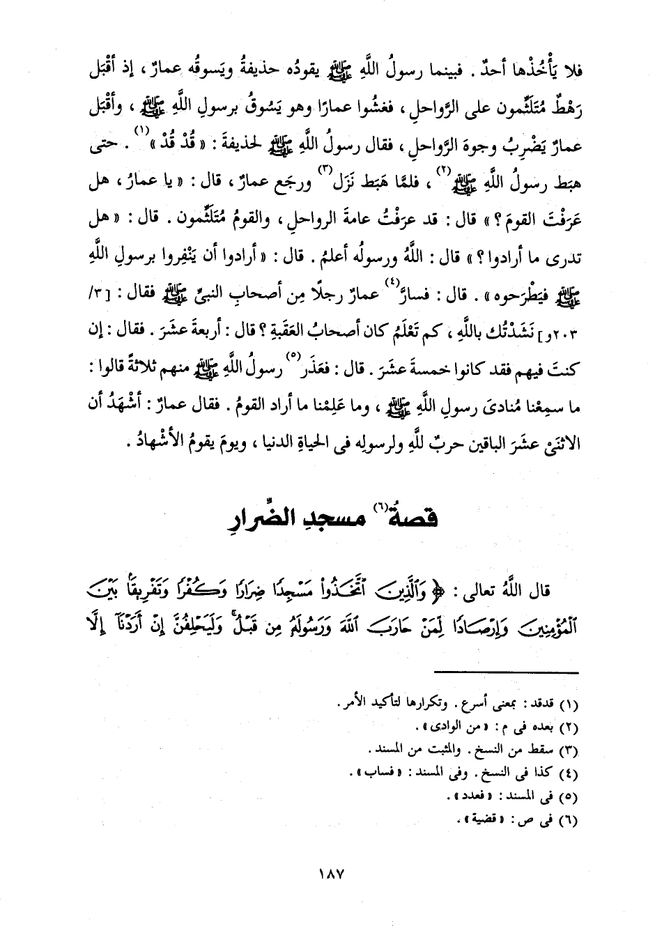 فَلَا يَأْخُذْهَا أَحَدٌ. فَبَيْنَمَا رَسُولُ اللَّهِ صَلَّى اللَّهُ عَلَيْهِ وَسَلَّمَ يَقُودُهُ حُذَيْفَةُ وَيَسُوقُهُ عَمَّارٌ إِذْ أَقْبَلَ رَهْطٌ مُتَلَثِّمُونَ عَلَى الرَّوَاحِلِ، فَغَشُوا عَمَّارًا وَهُوَ يَسُوقُ بِرَسُولِ اللَّهِ صَلَّى اللَّهُ عَلَيْهِ وَسَلَّمَ وَأَقْبَلَ عَمَّارٌ يَضْرِبُ وُجُوهَ الرَّوَاحِلِ، فَقَالَ رَسُولُ اللَّهِ صَلَّى اللَّهُ عَلَيْهِ وَسَلَّمَ لِحُذَيْفَةَ: " قُدْ قُدْ ". حَتَّى هَبَطَ رَسُولُ اللَّهِ صَلَّى اللَّهُ عَلَيْهِ وَسَلَّمَ، فَلَمَّا هَبَطَ نَزَلَ وَرَجَعَ عَمَّارٌ قَالَ: " يَا عَمَّارُ هَلْ عَرَفْتَ الْقَوْمَ؟ " قَالَ: قَدْ عَرَفْتُ عَامَّةَ الرَّوَاحِلِ، وَالْقَوْمُ مُتَلَثِّمُونَ. قَالَ: " هَلْ تَدْرِي مَا أَرَادُوا؟ " قَالَ: اللَّهُ وَرَسُولُهُ أَعْلَمُ. قَالَ: " أَرَادُوا أَنْ يَنْفِرُوا بِرَسُولِ اللَّهِ فَيَطْرَحُوهُ ". قَالَ: فَسَارَّ عَمَّارٌ رَجُلًا مِنْ أَصْحَابِ النَّبِيِّ صَلَّى اللَّهُ عَلَيْهِ وَسَلَّمَ فَقَالَ: نَشَدْتُكَ بِاللَّهِ، كَمْ تَعْلَمُ كَانَ أَصْحَابُ الْعَقَبَةِ؟ قَالَ: أَرْبَعَةَ عَشَرَ. فَقَالَ: إِنْ كُنْتُ فِيهِمْ فَقَدْ كَانُوا خَمْسَةَ عَشَرَ. قَالَ: فَعَذَرَ رَسُولُ اللَّهِ صَلَّى اللَّهُ عَلَيْهِ وَسَلَّمَ مِنْهُمْ ثَلَاثَةً قَالُوا: مَا سَمِعْنَا مُنَادِيَ رَسُولِ اللَّهِ صَلَّى اللَّهُ عَلَيْهِ وَسَلَّمَ، وَمَا عَلِمْنَا مَا أَرَادَ الْقَوْمُ. فَقَالَ عَمَّارٌ: أَشْهَدُ أَنَّ الِاثْنَيْ عَشَرَ الْبَاقِينَ حَرْبٌ لِلَّهِ وَلِرَسُولِهِ فِي الْحَيَاةِ الدُّنْيَا وَيَوْمَ يَقُومُ الْأَشْهَادُ.» .