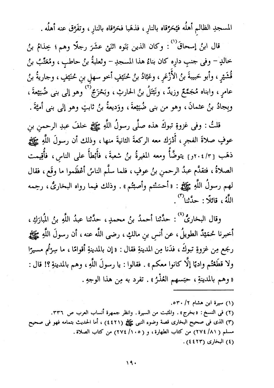 قُلْتُ: وَفِي غَزْوَةِ تَبُوكَ هَذِهِ صَلَّى رَسُولُ اللَّهِ صَلَّى اللَّهُ عَلَيْهِ وَسَلَّمَ خَلْفَ عَبْدِ الرَّحْمَنِ بْنِ عَوْفٍ صَلَاةَ الْفَجْرِ، أَدْرَكَ مَعَهُ الرَّكْعَةَ الثَّانِيَةَ مِنْهَا، وَذَلِكَ أَنَّ رَسُولَ اللَّهِ صَلَّى اللَّهُ عَلَيْهِ وَسَلَّمَ ذَهَبَ يَتَوَضَّأُ وَمَعَهُ الْمُغِيرَةُ بْنُ شُعْبَةَ فَأَبْطَأَ عَلَى النَّاسِ، فَأُقِيمَتِ الصَّلَاةُ فَتَقَدَّمَ عَبْدُ الرَّحْمَنِ بْنُ عَوْفٍ فَلَمَّا سَلَّمَ النَّاسُ أَعْظَمُوا مَا وَقَعَ، فَقَالَ لَهُمْ رَسُولُ اللَّهِ صَلَّى اللَّهُ عَلَيْهِ وَسَلَّمَ: " أَحْسَنْتُمْ وَأَصَبْتُمْ ". وَذَلِكَ فِيمَا رَوَاهُ الْبُخَارِيُّ رَحِمَهُ اللَّهُ قَائِلًا: حَدَّثَنَا.