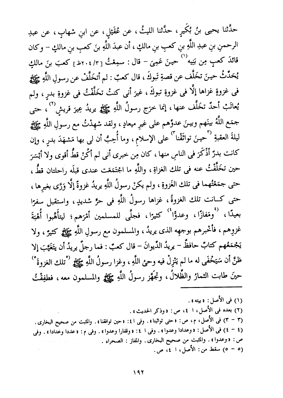 حَدَّثَنَا يَحْيَى بْنُ بُكَيْرٍ حَدَّثَنَا اللَّيْثُ عَنْ عُقَيْلٍ عَنِ ابْنِ شِهَابٍ عَنْ عَبْدِ الرَّحْمَنِ بْنِ عَبْدِ اللَّهِ بْنِ كَعْبِ بْنِ مَالِكٍ أَنَّ عَبْدَ اللَّهِ بْنَ كَعْبِ بْنِ مَالِكٍ - وَكَانَ قَائِدَ كَعْبٍ مِنْ بَنِيهِ حِينَ عَمِيَ - قَالَ: سَمِعْتُ كَعْبَ بْنَ مَالِكٍ يُحَدِّثُ حِينَ تَخَلَّفَ عَنْ قِصَّةِ تَبُوكَ، قَالَ كَعْبٌ: «لَمْ أَتَخَلَّفْ عَنْ رَسُولِ اللَّهِ صَلَّى اللَّهُ عَلَيْهِ وَسَلَّمَ فِي غَزْوَةٍ غَزَاهَا إِلَّا فِي غَزْوَةِ تَبُوكَ، غَيْرَ أَنِّي كُنْتُ تَخَلَّفْتُ فِي غَزْوَةِ بَدْرٍ، وَلَمْ يُعَاتَبْ أَحَدٌ تَخَلَّفَ عَنْهَا، إِنَّمَا خَرَجَ رَسُولُ اللَّهِ صَلَّى اللَّهُ عَلَيْهِ وَسَلَّمَ يُرِيدُ عِيرَ قُرَيْشٍ، حَتَّى جَمَعَ اللَّهُ بَيْنَهُمْ وَبَيْنَ عَدُوِّهِمْ عَلَى غَيْرِ مِيعَادٍ، وَلَقَدْ شَهِدْتُ مَعَ رَسُولِ اللَّهِ صَلَّى اللَّهُ عَلَيْهِ وَسَلَّمَ لَيْلَةَ الْعَقَبَةِ حَتَّى تَوَاثَقْنَا عَلَى الْإِسْلَامِ، وَمَا أُحِبُّ أَنَّ لِي بِهَا مَشْهَدَ بَدْرٍ، وَإِنْ كَانَتْ بَدْرٌ أَذْكَرَ فِي النَّاسِ مِنْهَا، كَانَ مِنْ خَبَرِي أَنِّي لَمْ أَكُنْ قَطُّ أَقْوَى وَلَا أَيْسَرَ حِينَ تَخَلَّفْتُ عَنْهُ فِي تِلْكَ الْغَزَاةِ، وَاللَّهِ مَا اجْتَمَعَتْ عِنْدِي قَبْلَهُ رَاحِلَتَانِ قَطُّ، حَتَّى جَمَعْتُهُمَا فِي تِلْكَ الْغَزْوَةِ، وَلَمْ يَكُنْ رَسُولُ اللَّهِ يُرِيدُ غَزْوَةً إِلَّا وَرَّى بِغَيْرِهَا، حَتَّى كَانَتْ تِلْكَ الْغَزْوَةُ، غَزَاهَا رَسُولُ اللَّهِ فِي حَرٍّ شَدِيدٍ، وَاسْتَقْبَلَ سَفَرًا بَعِيدًا، وَمَفَازًا، وَعَدُوًّا كَثِيرًا، فَجَلَّى لِلْمُسْلِمِينَ أَمْرَهُمْ، لِيَتَأَهَّبُوا أُهْبَةَ غَزْوِهِمْ، فَأَخْبَرَهُمْ بِوَجْهِهِ الَّذِي يُرِيدُ، وَالْمُسْلِمُونَ مَعَ رَسُولِ اللَّهِ صَلَّى اللَّهُ عَلَيْهِ وَسَلَّمَ كَثِيرٌ، وَلَا يَجْمَعُهُمْ كِتَابٌ حَافِظٌ - يُرِيدُ الدِّيوَانَ - قَالَ كَعْبٌ: فَمَا رَجُلٌ يُرِيدُ أَنْ يَتَغَيَّبَ إِلَّا ظَنَّ أَنْ سَيَخْفَى لَهُ مَا لَمْ يَنْزِلْ فِيهِ وَحْيُ اللَّهِ، وَغَزَا رَسُولُ اللَّهِ صَلَّى اللَّهُ عَلَيْهِ وَسَلَّمَ تِلْكَ الْغَزْوَةَ حِينَ طَابَتِ الثِّمَارُ وَالظِّلَالُ، وَتَجَهَّزَ رَسُولُ اللَّهِ صَلَّى اللَّهُ عَلَيْهِ وَسَلَّمَ وَالْمُسْلِمُونَ مَعَهُ، فَطَفِقْتُ أَغْدُو ; لِكَيْ أَتَجَهَّزَ مَعَهُمْ، فَأَرْجِعُ وَلَمْ أَقْضِ شَيْئًا، فَأَقُولُ فِي نَفْسِي: أَنَا قَادِرٌ عَلَيْهِ. فَلَمْ يَزَلْ يَتَمَادَى بِي حَتَّى اشْتَدَّ بِالنَّاسِ الْجِدُّ، فَأَصْبَحَ رَسُولُ اللَّهِ وَالْمُسْلِمُونَ مَعَهُ وَلَمْ أَقْضِ مِنْ جَهَازِي شَيْئًا، فَقُلْتُ: أَتَجَهَّزُ بَعْدَهُ بِيَوْمٍ أَوْ يَوْمَيْنِ، ثُمَّ أَلْحَقُهُمْ. فَغَدَوْتُ بَعْدَ أَنْ فَصَلُوا لِأَتَجَهَّزَ فَرَجَعْتُ وَلَمْ أَقْضِ شَيْئًا، ثُمَّ غَدَوْتُ ثُمَّ رَجَعْتُ وَلَمْ أَقْضِ شَيْئًا، فَلَمْ يَزَلْ بِي حَتَّى أَسْرَعُوا وَتَفَارَطَ الْغَزْوُ، وَهَمَمْتُ أَنْ أَرْتَحِلَ فَأُدْرِكَهُمْ - وَلَيْتَنِي فَعَلْتُ - فَلَمْ يُقَدَّرْ لِي ذَلِكَ، فَكُنْتُ إِذَا خَرَجْتُ فِي النَّاسِ بَعْدَ خُرُوجِ رَسُولِ اللَّهِ فَطُفْتُ فِيهِمْ، أَحْزَنَنِي أَنِّي لَا أَرَى إِلَّا رَجُلًا مَغْمُوصًا عَلَيْهِ النِّفَاقُ، أَوْ رَجُلًا مِمَّنْ عَذَرَ اللَّهُ مِنِ الضُّعَفَاءِ، وَلَمْ يَذْكُرْنِي رَسُولُ اللَّهِ صَلَّى اللَّهُ عَلَيْهِ وَسَلَّمَ حَتَّى بَلَغَ تَبُوكَ، فَقَالَ وَهُوَ جَالِسٌ فِي الْقَوْمِ بِتَبُوكَ: " مَا فَعَلَ كَعْبٌ؟ " فَقَالَ رَجُلٌ مِنْ بَنِي سَلِمَةَ: يَا رَسُولَ اللَّهِ حَبَسَهُ بُرْدَاهُ وَنَظَرُهُ فِي عِطْفَيْهِ. فَقَالَ مُعَاذُ بْنُ جَبَلٍ: بِئْسَ مَا قُلْتَ، وَاللَّهِ يَا رَسُولَ اللَّ