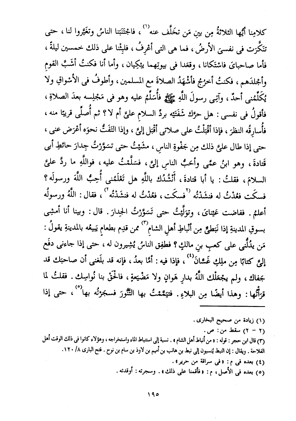 كَلَامِنَا أَيُّهَا الثَّلَاثَةُ مِنْ بَيْنِ مَنْ تَخَلَّفَ عَنْهُ، فَاجْتَنَبَنَا النَّاسُ وَتَغَيَّرُوا لَنَا، حَتَّى تَنَكَّرَتْ فِي نَفْسِي الْأَرْضُ، فَمَا هِيَ الَّتِي أَعْرِفُ، فَلَبِثْنَا عَلَى ذَلِكَ خَمْسِينَ لَيْلَةً، فَأَمَّا صَاحِبَايَ فَاسْتَكَانَا وَقَعَدَا فِي بُيُوتِهِمَا يَبْكِيَانِ، وَأَمَّا أَنَا فَكُنْتُ أَشَبَّ الْقَوْمِ وَأَجْلَدَهُمْ، فَكُنْتُ أَخْرُجُ فَأَشْهَدُ الصَّلَاةَ مَعَ الْمُسْلِمِينَ، وَأَطُوفُ فِي الْأَسْوَاقِ وَلَا يُكَلِّمُنِي أَحَدٌ، وَآتِي رَسُولَ اللَّهِ صَلَّى اللَّهُ عَلَيْهِ وَسَلَّمَ فَأُسَلِّمُ عَلَيْهِ وَهُوَ فِي مَجْلِسِهِ بَعْدَ الصَّلَاةِ، فَأَقُولُ فِي نَفْسِي: هَلْ حَرَّكَ شَفَتَيْهِ بِرَدِّ السَّلَامِ عَلَيَّ أَمْ لَا؟ ثُمَّ أُصَلِّي قَرِيبًا مِنْهُ فَأُسَارِقُهُ النَّظَرَ، فَإِذَا أَقْبَلْتُ عَلَى صَلَاتِي أَقْبَلَ إِلَيَّ، وَإِذَا الْتَفَتُّ نَحْوَهُ أَعْرَضَ عَنِّي، حَتَّى إِذَا طَالَ عَلَيَّ ذَلِكَ مِنْ جَفْوَةِ النَّاسِ، مَشَيْتُ حَتَّى تَسَوَّرْتُ جِدَارَ حَائِطِ أَبِي قَتَادَةَ وَهُوَ ابْنُ عَمِّي وَأَحَبُّ النَّاسِ إِلَيَّ، فَسَلَّمْتُ عَلَيْهِ فَوَاللَّهِ مَا رَدَّ عَلَيَّ السَّلَامَ، فَقُلْتُ: يَا أَبَا قَتَادَةَ أَنْشُدُكَ بِاللَّهِ هَلْ تَعْلَمُنِي أُحِبُّ اللَّهَ وَرَسُولَهُ؟ فَسَكَتَ، فَعُدْتُ لَهُ فَنَشَدْتُهُ فَسَكَتَ، فَعُدْتُ لَهُ فَنَشَدْتُهُ فَقَالَ: اللَّهُ وَرَسُولُهُ أَعْلَمُ. فَفَاضَتْ عَيْنَايَ وَتَوَلَّيْتُ حَتَّى تَسَوَّرْتُ الْجِدَارَ. قَالَ: وَبَيْنَا أَنَا أَمْشِي بِسُوقِ الْمَدِينَةِ إِذَا نَبَطِيٌّ مِنْ أَنْبَاطِ أَهْلِ الشَّامِ مِمَّنْ قَدِمَ بِطَعَامٍ يَبِيعُهُ بِالْمَدِينَةِ يَقُولُ: مَنْ يَدُلُّنِي عَلَى كَعْبِ بْنِ مَالِكٍ؟ فَطَفِقَ النَّاسُ يُشِيرُونَ لَهُ، حَتَّى إِذَا جَاءَنِي دَفَعَ إِلَيَّ كِتَابًا مِنْ مَلِكِ غَسَّانَ، فَإِذَا فِيهِ: أَمَّا بَعْدُ فَإِنَّهُ قَدْ بَلَغَنِي أَنَّ صَاحِبَكَ قَدْ جَفَاكَ، وَلَمْ يَجْعَلْكَ اللَّهُ بِدَارِ هَوَانٍ وَلَا مَضْيَعَةٍ، فَالْحَقْ بِنَا نُوَاسِكَ، فَقُلْتُ لَمَّا قَرَأْتُهَا: وَهَذَا أَيْضًا مِنَ الْبَلَاءِ، فَتَيَمَّمْتُ بِهَا التَّنُّورَ فَسَجَرْتُهُ بِهَا حَتَّى إِذَا
