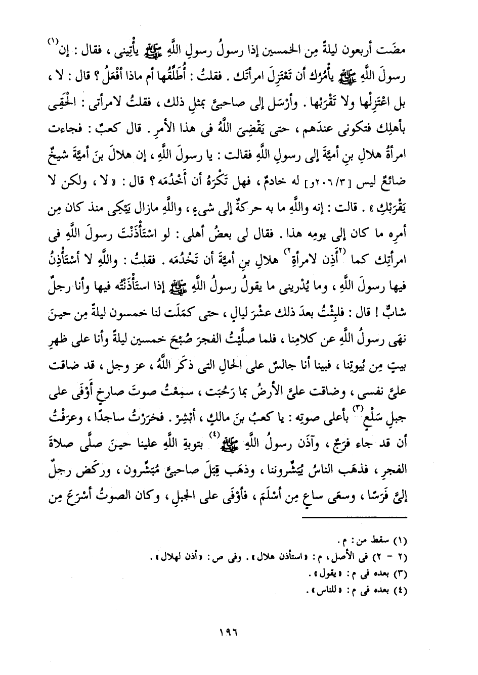 مَضَتْ أَرْبَعُونَ لَيْلَةً مِنَ الْخَمْسِينَ، إِذَا رَسُولُ رَسُولِ اللَّهِ صَلَّى اللَّهُ عَلَيْهِ وَسَلَّمَ يَأْتِينِي فَقَالَ: إِنَّ رَسُولَ اللَّهِ صَلَّى اللَّهُ عَلَيْهِ وَسَلَّمَ يَأْمُرُكَ أَنْ تَعْتَزِلَ امْرَأَتَكَ. فَقُلْتُ: أُطَلِّقُهَا أَمْ مَاذَا أَفْعَلُ؟ قَالَ: لَا بَلِ اعْتَزِلْهَا وَلَا تَقْرَبْهَا. وَأَرْسَلَ إِلَى صَاحِبَيَّ بِمِثْلِ ذَلِكَ، فَقُلْتُ لِامْرَأَتِي: الْحَقِي بِأَهْلِكِ فَتَكُونِي عِنْدَهُمْ حَتَّى يَقْضِيَ اللَّهُ فِي هَذَا الْأَمْرِ. قَالَ كَعْبٌ: فَجَاءَتِ امْرَأَةُ هِلَالِ بْنِ أُمَيَّةَ إِلَى رَسُولِ اللَّهِ فَقَالَتْ: يَا رَسُولَ اللَّهِ إِنَّ هِلَالَ بْنَ أُمَيَّةَ شَيْخٌ ضَائِعٌ لَيْسَ لَهُ خَادِمٌ فَهَلْ تَكْرَهُ أَنْ أَخْدِمَهُ؟ قَالَ: " لَا وَلَكِنْ لَا يَقْرَبْكِ ". قَالَتْ: إِنَّهُ وَاللَّهِ مَا بِهِ حَرَكَةٌ إِلَى شَيْءٍ، وَاللَّهِ مَا زَالَ يَبْكِي مُنْذُ كَانَ مِنْ أَمْرِهِ مَا كَانَ إِلَى يَوْمِهِ هَذَا. فَقَالَ لِي بَعْضُ أَهْلِي: لَوِ اسْتَأْذَنْتَ رَسُولَ اللَّهِ فِي امْرَأَتِكَ كَمَا أَذِنَ لِامْرَأَةِ هِلَالِ بْنِ أُمَيَّةَ أَنْ تَخْدِمَهُ. فَقُلْتُ: وَاللَّهِ لَا أَسْتَأْذِنُ فِيهَا رَسُولَ اللَّهِ، وَمَا يُدْرِينِي مَا يَقُولُ رَسُولُ اللَّهِ صَلَّى اللَّهُ عَلَيْهِ وَسَلَّمَ إِذَا اسْتَأْذَنْتُهُ فِيهَا وَأَنَا رَجُلٌ شَابٌّ! قَالَ: فَلَبِثْتُ بَعْدَ ذَلِكَ عَشْرَ لَيَالٍ، حَتَّى كَمَلَتْ لَنَا خَمْسُونَ لَيْلَةً مِنْ حِينِ نَهَى رَسُولُ اللَّهِ عَنْ كَلَامِنَا، فَلَمَّا صَلَّيْتُ الْفَجْرَ صُبْحَ خَمْسِينَ لَيْلَةً وَأَنَا عَلَى ظَهْرِ بَيْتٍ مِنْ بُيُوتِنَا، فَبَيْنَا أَنَا جَالِسٌ عَلَى الْحَالِ الَّتِي ذَكَرَ اللَّهُ، عَزَّ وَجَلَّ، قَدْ ضَاقَتْ عَلَيَّ نَفْسِي، وَضَاقَتْ عَلَيَّ الْأَرْضُ بِمَا رَحُبَتْ، سَمِعْتُ صَوْتَ صَارِخٍ أَوْفَى عَلَى جَبَلِ سَلْعٍ بِأَعْلَى صَوْتِهِ: يَا كَعْبَ بْنَ مَالِكٍ أَبْشِرْ. فَخَرَرْتُ سَاجِدًا وَعَرَفْتُ أَنْ قَدْ جَاءَ فَرَجٌ، وَآذَنَ رَسُولُ اللَّهِ صَلَّى اللَّهُ عَلَيْهِ وَسَلَّمَ بِتَوْبَةِ اللَّهِ عَلَيْنَا حِينَ صَلَّى صَلَاةَ الْفَجْرِ، فَذَهَبَ النَّاسُ يُبَشِّرُونَنَا، وَذَهَبَ قِبَلَ صَاحِبَيَّ مُبَشِّرُونَ، وَرَكَضَ رَجُلٌ إِلَيَّ فَرَسًا وَسَعَى سَاعٍ مِنْ أَسْلَمَ، فَأَوْفَى عَلَى الْجَبَلِ، وَكَانَ الصَّوْتُ أَسْرَعَ مِنَ