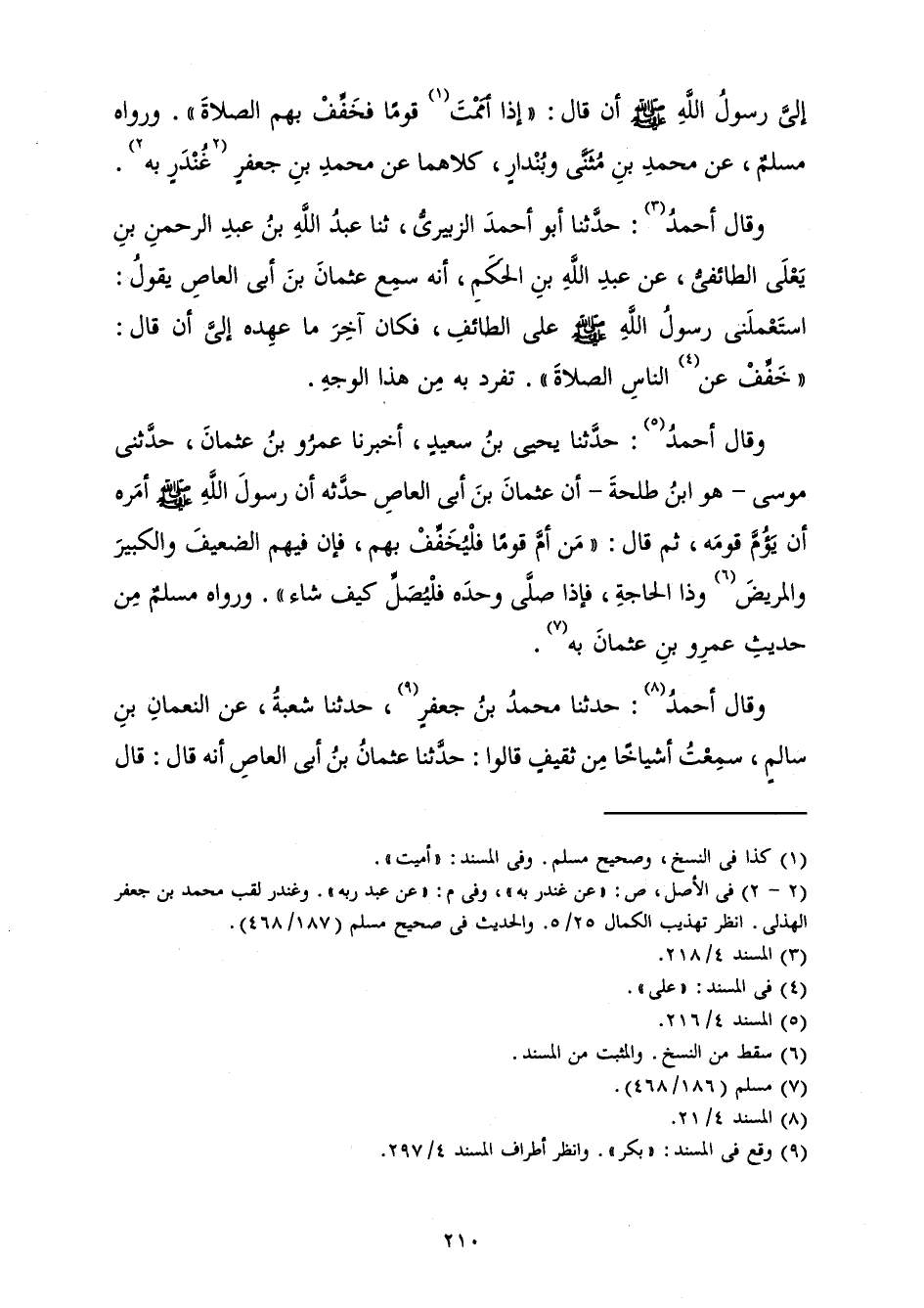 وَقَالَ أَحْمَدُ: حَدَّثَنَا يَحْيَى بْنُ سَعِيدٍ أَخْبَرَنَا عَمْرُو بْنُ عُثْمَانَ حَدَّثَنِي مُوسَى - هُوَ ابْنُ طَلْحَةَ - أَنَّ عُثْمَانَ بْنَ أَبِي الْعَاصِ حَدَّثَهُ «أَنَّ رَسُولَ اللَّهِ صَلَّى اللَّهُ عَلَيْهِ وَسَلَّمَ أَمَرَهُ أَنْ يَؤُمَّ قَوْمَهُ، ثُمَّ قَالَ: " مَنْ أَمَّ قَوْمًا فَلْيُخَفِّفْ بِهِمْ، فَإِنَّ فِيهِمُ الضَّعِيفَ وَالْكَبِيرَ وَالْمَرِيضَ وَذَا الْحَاجَةِ، فَإِذَا صَلَّى وَحْدَهُ فَلْيُصَلِّ كَيْفَ شَاءَ ".» وَرَوَاهُ مُسْلِمٌ مِنْ حَدِيثِ عَمْرِو بْنِ عُثْمَانَ بِهِ.