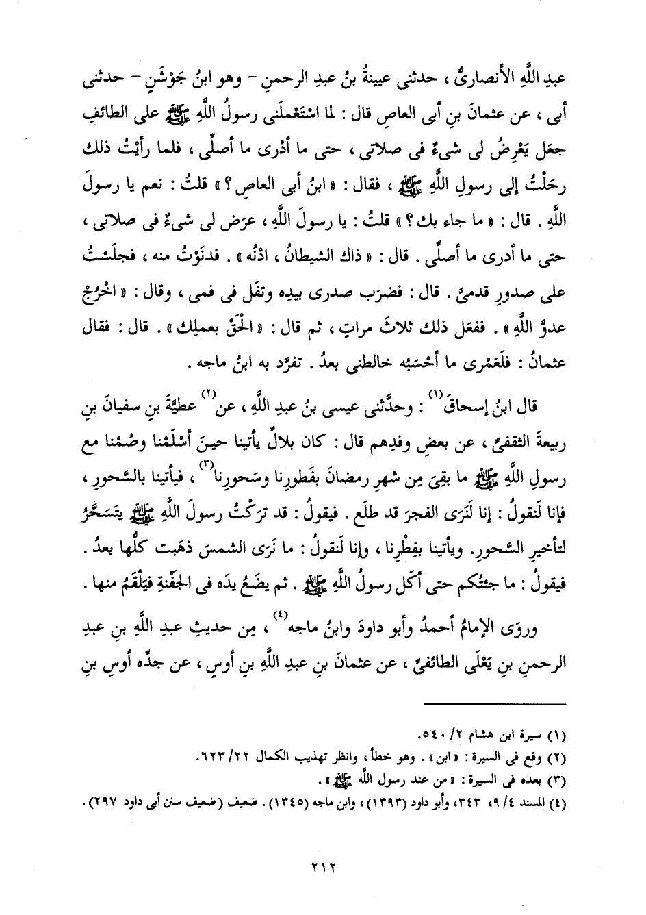 عَبْدِ اللَّهِ الْأَنْصَارِيُّ حَدَّثَنِي عُيَيْنَةُ بْنُ عَبْدِ الرَّحْمَنِ - وَهُوَ ابْنُ جَوْشَنٍ - حَدَّثَنِي أَبِي، عَنْ عُثْمَانَ بْنِ أَبِي الْعَاصِ قَالَ: «لَمَّا اسْتَعْمَلَنِي رَسُولُ اللَّهِ صَلَّى اللَّهُ عَلَيْهِ وَسَلَّمَ عَلَى الطَّائِفِ جَعَلَ يَعْرِضُ لِي شَيْءٌ فِي صَلَاتِي، حَتَّى مَا أَدْرِي مَا أُصَلِّي، فَلَمَّا رَأَيْتُ ذَلِكَ رَحَلْتُ إِلَى رَسُولِ اللَّهِ صَلَّى اللَّهُ عَلَيْهِ وَسَلَّمَ فَقَالَ: " ابْنُ أَبِي الْعَاصِ؟ " قُلْتُ: نَعَمْ يَا رَسُولَ اللَّهِ. قَالَ: " مَا جَاءَ بِكَ؟ " قُلْتُ: يَا رَسُولَ اللَّهِ، عَرَضَ لِي شَيْءٌ فِي صَلَاتِي حَتَّى مَا أَدْرِي مَا أُصَلِّي. قَالَ: " ذَاكَ الشَّيْطَانُ، ادْنُهْ ". فَدَنَوْتُ مِنْهُ فَجَلَسْتُ عَلَى صُدُورِ قَدَمَيَّ. قَالَ: فَضَرَبَ صَدْرِي بِيَدِهِ وَتَفَلَ فِي فَمِي، وَقَالَ: " اخْرُجْ عَدُوَّ اللَّهِ ". فَفَعَلَ ذَلِكَ ثَلَاثَ مَرَّاتٍ، ثُمَّ قَالَ: " الْحَقْ بِعَمَلِكَ ". قَالَ: فَقَالَ عُثْمَانُ: فَلَعَمْرِي مَا أَحْسَبُهُ خَالَطَنِي بَعْدُ.» تَفَرَّدَ بِهِ ابْنُ مَاجَهْ.