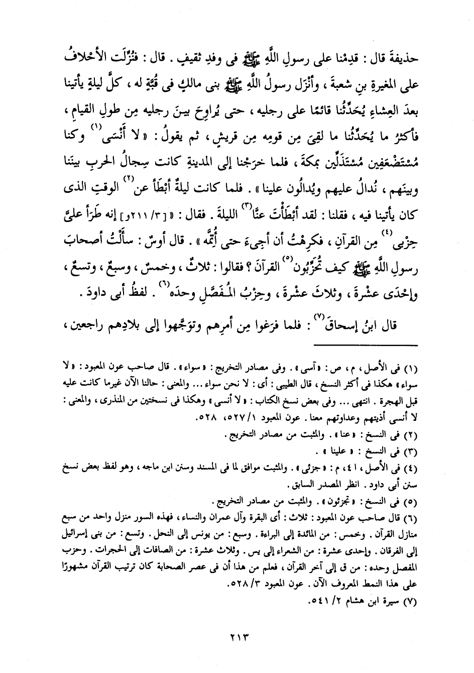 حُذَيْفَةَ قَالَ: «قَدِمْنَا عَلَى رَسُولِ اللَّهِ صَلَّى اللَّهُ عَلَيْهِ وَسَلَّمَ فِي وَفْدِ ثَقِيفٍ. قَالَ: فَنَزَلَتِ الْأَحْلَافُ عَلَى الْمُغِيرَةِ بْنِ شُعْبَةَ وَأَنْزَلَ رَسُولُ اللَّهِ صَلَّى اللَّهُ عَلَيْهِ وَسَلَّمَ بَنِي مَالِكٍ فِي قُبَّةٍ لَهُ، كُلَّ لَيْلَةٍ يَأْتِينَا بَعْدَ الْعِشَاءِ يُحَدِّثُنَا قَائِمًا عَلَى رِجْلَيْهِ، حَتَّى يُرَاوِحَ بَيْنَ رِجْلَيْهِ مِنْ طُولِ الْقِيَامِ، فَأَكْثَرُ مَا يُحَدِّثُنَا مَا لَقِيَ مِنْ قَوْمِهِ مِنْ قُرَيْشٍ، ثُمَّ يَقُولُ: " لَا أَنْسَى وَكُنَّا مُسْتَضْعَفِينَ مُسْتَذَلِّينَ بِمَكَّةَ، فَلَمَّا خَرَجْنَا إِلَى الْمَدِينَةِ كَانَتْ سِجَالُ الْحَرْبِ بَيْنَنَا وَبَيْنَهُمْ، نُدَالُ عَلَيْهِمْ وَيُدَالُونَ عَلَيْنَا ". فَلَمَّا كَانَتْ لَيْلَةٌ أَبْطَأَ عَنِ الْوَقْتِ الَّذِي كَانَ يَأْتِينَا فِيهِ فَقُلْنَا: لَقَدْ أَبْطَأْتَ عَنَّا اللَّيْلَةَ. فَقَالَ: " إِنَّهُ طَرَأَ عَلَيَّ حِزْبِي مِنَ الْقُرْآنِ، فَكَرِهْتُ أَنْ أَجِيءَ حَتَّى أُتِمَّهُ ". قَالَ أَوْسٌ: سَأَلْتُ أَصْحَابَ رَسُولِ اللَّهِ صَلَّى اللَّهُ عَلَيْهِ وَسَلَّمَ كَيْفَ تُحَزِّبُونَ الْقُرْآنَ؟ فَقَالُوا: ثَلَاثٌ، وَخُمْسٌ، وَسَبْعٌ، وَتِسْعٌ، وَإِحْدَى عَشْرَةَ، وَثَلَاثَ عَشْرَةَ، وَحِزْبُ الْمُفَصَّلِ وَحْدَهُ.» لَفْظُ أَبِي دَاوُدَ.