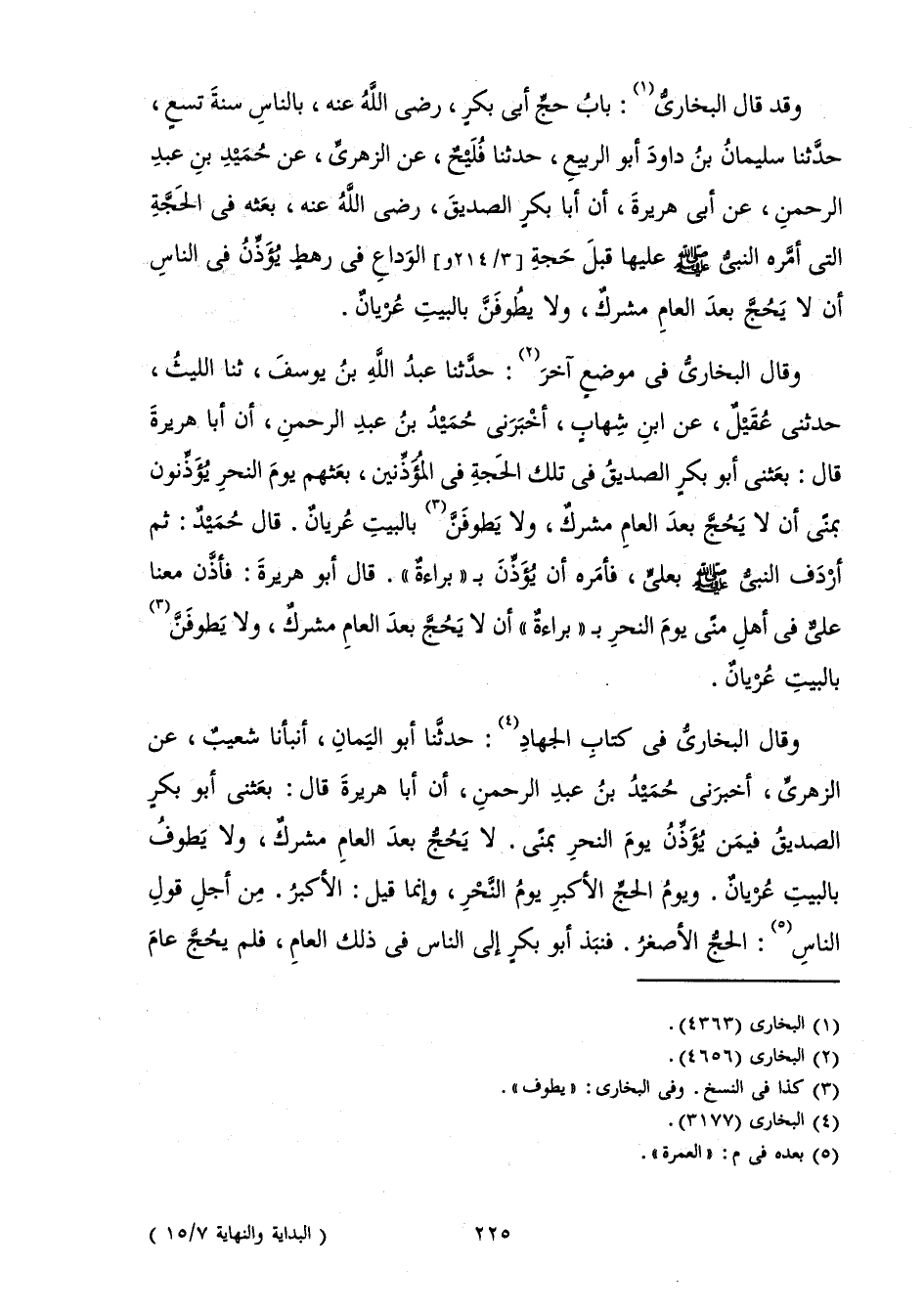 وَقَالَ الْبُخَارِيُّ فِي كِتَابِ الْجِهَادِ: حَدَّثَنَا أَبُو الْيَمَانِ أَنْبَأَنَا شُعَيْبٌ عَنِ الزُّهْرِيِّ أَخْبَرَنِي حُمَيْدُ بْنُ عَبْدِ الرَّحْمَنِ «أَنَّ أَبَا هُرَيْرَةَ قَالَ: بَعَثَنِي أَبُو بَكْرٍ الصِّدِّيقُ فِيمَنْ يُؤَذِّنُ يَوْمَ النَّحْرِ بِمِنًى. لَا يَحُجُّ بَعْدَ الْعَامِ مُشْرِكٌ، وَلَا يَطُوفُ بِالْبَيْتِ عُرْيَانٌ. وَيَوْمُ الْحَجِّ الْأَكْبَرِ يَوْمُ النَّحْرِ، وَإِنَّمَا قِيلَ: الْأَكْبَرُ. مِنْ أَجْلِ قَوْلِ النَّاسِ: الْحَجُّ الْأَصْغَرُ. فَنَبَذَ أَبُو بَكْرٍ إِلَى النَّاسِ فِي ذَلِكَ الْعَامِ، فَلَمْ يَحُجَّ عَامَ