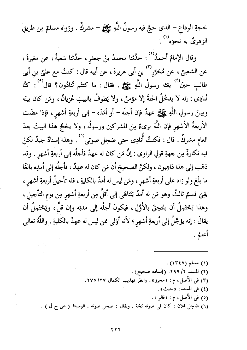 وَقَالَ الْإِمَامُ أَحْمَدُ: حَدَّثَنَا مُحَمَّدُ بْنُ جَعْفَرٍ حَدَّثَنَا شُعْبَةُ عَنْ مُغِيرَةَ عَنِ الشَّعْبِيِّ «عَنْ مُحَرَّرِ بْنِ أَبِي هُرَيْرَةَ عَنْ أَبِيهِ قَالَ: كُنْتُ مَعَ عَلِيِّ بْنِ أَبِي طَالِبٍ حِينَ بَعَثَهُ رَسُولُ اللَّهِ صَلَّى اللَّهُ عَلَيْهِ وَسَلَّمَ. فَقَالَ: مَا كُنْتُمْ تُنَادُونَ؟ قَالَ: كُنَّا نُنَادِي: أَنَّهُ لَا يَدْخُلُ الْجَنَّةَ إِلَّا مُؤْمِنٌ، وَلَا يَطُوفُ بِالْبَيْتِ عُرْيَانٌ، وَمَنْ كَانَ بَيْنَهُ وَبَيْنَ رَسُولِ اللَّهِ صَلَّى اللَّهُ عَلَيْهِ وَسَلَّمَ عَهْدٌ فَإِنَّ أَجَلَهُ - أَوْ أَمَدَهُ - إِلَى أَرْبَعَةِ أَشْهُرٍ، فَإِذَا مَضَتِ الْأَرْبَعَةُ الْأَشْهُرُ فَإِنَّ اللَّهَ بَرِيءٌ مِنَ الْمُشْرِكِينَ وَرَسُولُهُ، وَلَا يَحُجُّ هَذَا الْبَيْتَ بَعْدَ الْعَامِ مُشْرِكٌ. قَالَ: فَكُنْتُ أُنَادِي حَتَّى صَحِلَ صَوْتِي.» وَهَذَا إِسْنَادٌ جَيِّدٌ لَكِنْ فِيهِ نَكَارَةٌ مِنْ جِهَةِ قَوْلِ الرَّاوِي: إِنَّ مَنْ كَانَ لَهُ عَهْدٌ فَأَجَلُهُ إِلَى أَرْبَعَةِ أَشْهُرٍ. وَقَدْ ذَهَبَ إِلَى هَذَا ذَاهِبُونَ، وَلَكِنَّ الصَّحِيحَ أَنَّ مَنْ كَانَ لَهُ عَهْدٌ فَأَجَلُهُ إِلَى أَمَدِهِ بَالِغًا مَا بَلَغَ وَلَوْ زَادَ عَلَى أَرْبَعَةِ أَشْهُرٍ، وَمَنْ لَيْسَ لَهُ أَمَدٌ بِالْكُلِّيَّةِ فَلَهُ تَأْجِيلُ أَرْبَعَةِ أَشْهُرٍ، بَقِيَ قِسْمٌ ثَالِثٌ وَهُوَ مَنْ لَهُ أَمَدٌ يَتَنَاهَى إِلَى أَقَلَّ مِنْ أَرْبَعَةِ أَشْهُرٍ مِنْ يَوْمِ التَّأْجِيلِ، وَهَذَا يَحْتَمِلُ أَنْ يَلْتَحِقَ بِالْأَوَّلِ فَيَكُونَ أَجَلُهُ إِلَى مُدَّتِهِ وَإِنْ قَلَّ، وَيَحْتَمِلُ أَنْ يُقَالَ: إِنَّهُ يُؤَجَّلُ إِلَى أَرْبَعَةِ أَشْهُرٍ ; لِأَنَّهُ أَوْلَى مِمَّنْ لَيْسَ لَهُ عَهْدٌ بِالْكُلِّيَّةِ. وَاللَّهُ تَعَالَى أَعْلَمُ.