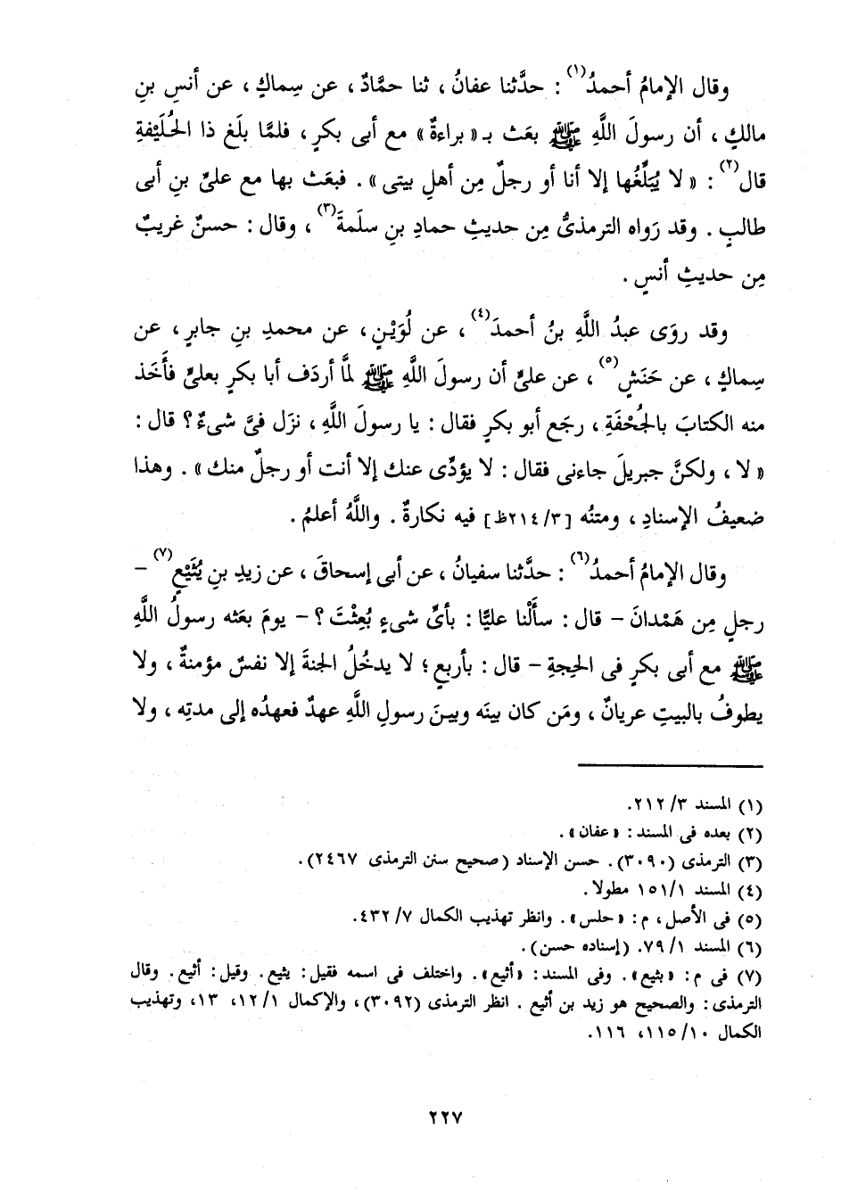 وَقَالَ الْإِمَامُ أَحْمَدُ: حَدَّثَنَا عَفَّانُ ثنا حَمَّادٌ عَنْ سِمَاكٍ عَنْ أَنَسِ بْنِ مَالِكٍ «أَنَّ رَسُولَ اللَّهِ صَلَّى اللَّهُ عَلَيْهِ وَسَلَّمَ بَعَثَ بِ " بَرَاءَةَ " مَعَ أَبِي بَكْرٍ فَلَمَّا بَلَغَ ذَا الْحُلَيْفَةِ قَالَ: " لَا يُبَلِّغُهَا إِلَّا أَنَا أَوْ رَجُلٌ مِنْ أَهْلِ بَيْتِي ". فَبَعَثَ بِهَا مَعَ عَلِيِّ بْنِ أَبِي طَالِبٍ» وَقَدْ رَوَاهُ التِّرْمِذِيُّ مِنْ حَدِيثِ حَمَّادِ بْنِ سَلَمَةَ، وَقَالَ: حَسَنٌ غَرِيبٌ مِنْ حَدِيثِ أَنَسٍ.