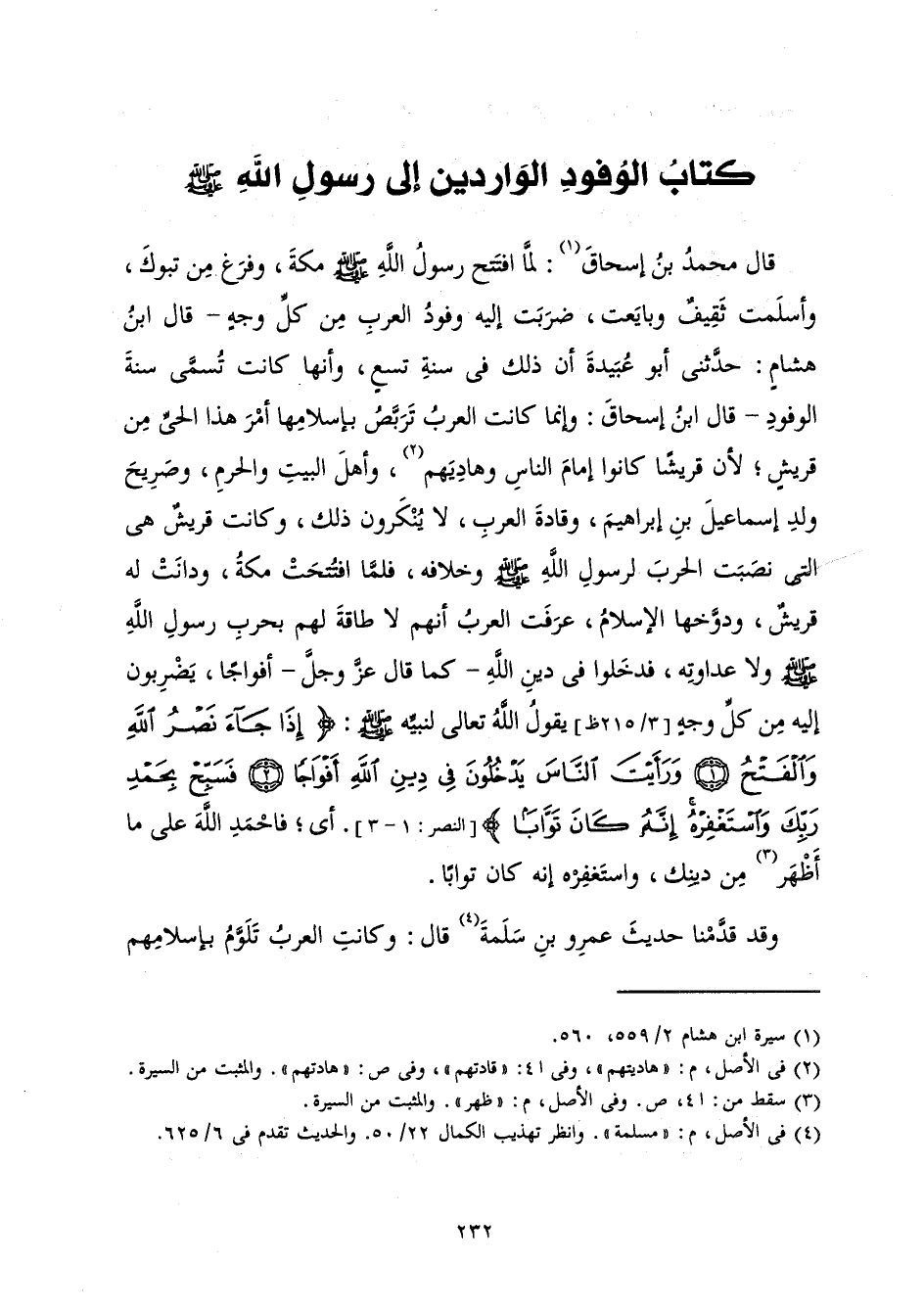 قَالَ مُحَمَّدُ بْنُ إِسْحَاقَ: لَمَّا افْتَتَحَ رَسُولُ اللَّهِ صَلَّى اللَّهُ عَلَيْهِ وَسَلَّمَ مَكَّةَ وَفَرَغَ مِنْ تَبُوكَ وَأَسْلَمَتْ ثَقِيفٌ وَبَايَعَتْ، ضَرَبَتْ إِلَيْهِ وُفُودُ الْعَرَبِ مِنْ كُلِّ وَجْهٍ - قَالَ ابْنُ هِشَامٍ: حَدَّثَنِي أَبُو عُبَيْدَةَ أَنَّ ذَلِكَ فِي سَنَةِ تِسْعٍ، وَأَنَّهَا كَانَتْ تُسَمَّى سَنَةَ الْوُفُودِ - قَالَ ابْنُ إِسْحَاقَ: وَإِنَّمَا كَانَتِ الْعَرَبُ تَرَبَّصُ بِإِسْلَامِهَا أَمْرَ هَذَا الْحَيِّ مِنْ قُرَيْشٍ ; لِأَنَّ قُرَيْشًا كَانُوا إِمَامَ النَّاسِ وَهَادِيَهُمْ، وَأَهْلَ الْبَيْتِ وَالْحَرَمِ، وَصَرِيحَ وَلَدِ إِسْمَاعِيلَ بْنِ إِبْرَاهِيمَ، وَقَادَةَ الْعَرَبِ، لَا يُنْكِرُونَ ذَلِكَ، وَكَانَتْ قُرَيْشٌ هِيَ الَّتِي نَصَبَتِ الْحَرْبَ لِرَسُولِ اللَّهِ صَلَّى اللَّهُ عَلَيْهِ وَسَلَّمَ وَخِلَافَهُ، فَلَمَّا افْتُتِحَتْ مَكَّةُ وَدَانَتْ لَهُ قُرَيْشٌ، وَدَوَّخَهَا الْإِسْلَامُ، عَرَفَتِ الْعَرَبُ أَنَّهُمْ لَا طَاقَةَ لَهُمْ بِحَرْبِ رَسُولِ اللَّهِ صَلَّى اللَّهُ عَلَيْهِ وَسَلَّمَ وَلَا عَدَاوَتِهِ، فَدَخَلُوا فِي دِينِ اللَّهِ - كَمَا قَالَ عَزَّ وَجَلَّ - أَفْوَاجًا، يَضْرِبُونَ إِلَيْهِ مِنْ كُلِّ وَجْهٍ، يَقُولُ اللَّهُ تَعَالَى لِنَبِيِّهِ صَلَّى اللَّهُ عَلَيْهِ وَسَلَّمَ: {إِذَا جَاءَ نَصْرُ اللَّهِ وَالْفَتْحُ وَرَأَيْتَ النَّاسَ يَدْخُلُونَ فِي دِينِ اللَّهِ أَفْوَاجًا فَسَبِّحْ بِحَمْدِ رَبِّكَ وَاسْتَغْفِرْهُ إِنَّهُ كَانَ تَوَّابًا} [النصر: 1] (النَّصْرِ: 1 - 3) أَيْ فَاحْمَدِ اللَّهَ عَلَى مَا أَظْهَرَ مِنْ دِينِكَ، وَاسْتَغْفِرْهُ إِنَّهُ كَانَ تَوَّابًا.