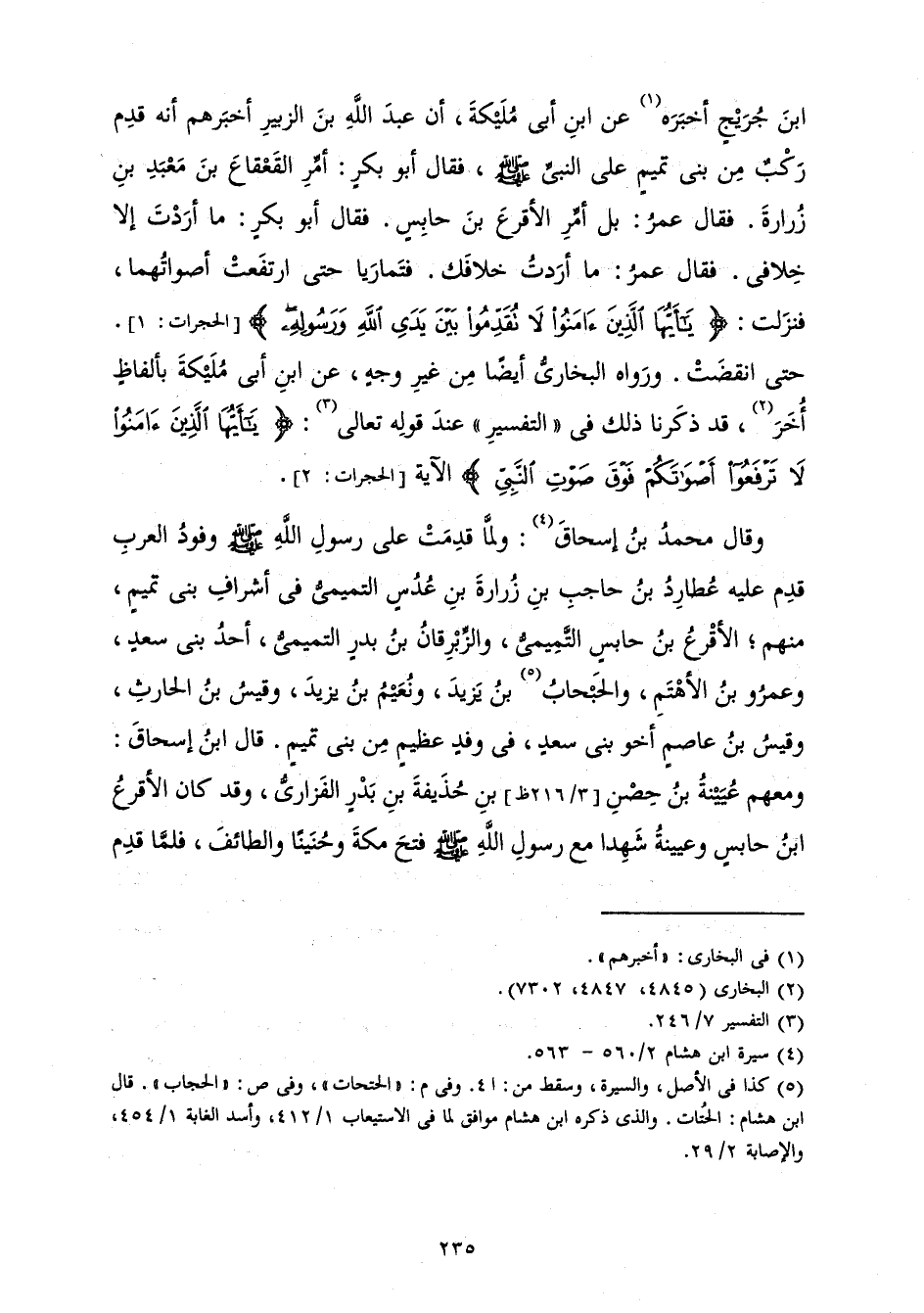 ابْنَ جُرَيْجٍ أَخْبَرَهُ عَنِ ابْنِ أَبِي مُلَيْكَةَ أَنَّ عَبْدَ اللَّهِ بْنَ الزُّبَيْرِ أَخْبَرَهُمْ أَنَّهُ «قَدِمَ رَكْبٌ مِنْ بَنِي تَمِيمٍ عَلَى النَّبِيِّ صَلَّى اللَّهُ عَلَيْهِ وَسَلَّمَ، فَقَالَ أَبُو بَكْرٍ: أَمِّرِ الْقَعْقَاعَ بْنَ مَعْبَدِ بْنِ زُرَارَةَ. فَقَالَ عُمَرُ: بَلْ أَمِّرِ الْأَقْرَعَ بْنَ حَابِسٍ فَقَالَ أَبُو بَكْرٍ: مَا أَرَدْتَ إِلَّا خِلَافِي. فَقَالَ عُمَرُ: مَا أَرَدْتُ خِلَافَكَ. فَتَمَارَيَا حَتَّى ارْتَفَعَتْ أَصْوَاتُهُمَا، فَنَزَلَتْ {يَا أَيُّهَا الَّذِينَ آمَنُوا لَا تُقَدِّمُوا بَيْنَ يَدَيِ اللَّهِ وَرَسُولِهِ} [الحجرات: 1] (الْحُجُرَاتِ: 1) حَتَّى انْقَضَتْ.» وَرَوَاهُ الْبُخَارِيُّ أَيْضًا مِنْ غَيْرِ وَجْهٍ، عَنِ ابْنِ أَبِي مُلَيْكَةَ بِأَلْفَاظٍ أُخَرَ، قَدْ ذَكَرْنَا ذَلِكَ فِي " التَّفْسِيرِ " عِنْدَ قَوْلِهِ تَعَالَى: {يَا أَيُّهَا الَّذِينَ آمَنُوا لَا تَرْفَعُوا أَصْوَاتَكُمْ فَوْقَ صَوْتِ النَّبِيِّ} [الحجرات: 2] الْآيَةَ.