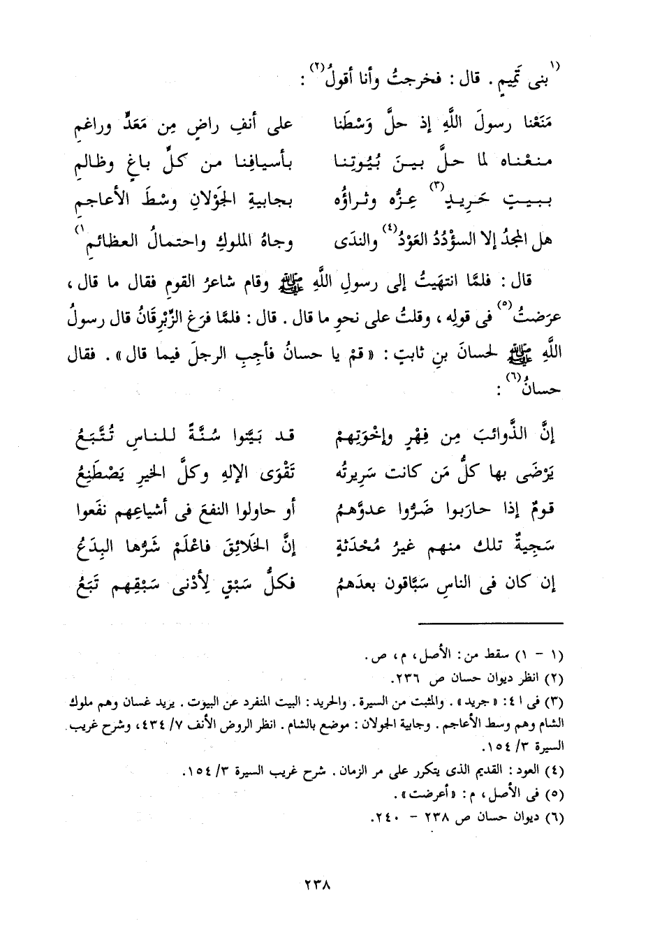 قَالَ: فَلَمَّا انْتَهَيْتُ إِلَى رَسُولِ اللَّهِ صَلَّى اللَّهُ عَلَيْهِ وَسَلَّمَ وَقَامَ شَاعِرُ الْقَوْمِ فَقَالَ مَا قَالَ، عَرَضْتُ فِي قَوْلِهِ، وَقُلْتُ عَلَى نَحْوِ مَا قَالَ. قَالَ: فَلَمَّا فَرَغَ الزِّبْرِقَانُ قَالَ رَسُولُ اللَّهِ صَلَّى اللَّهُ عَلَيْهِ وَسَلَّمَ لِحَسَّانَ بْنِ ثَابِتٍ: " قُمْ يَا حَسَّانُ فَأَجِبِ الرَّجُلَ فِيمَا قَالَ ". فَقَالَ حَسَّانُ:
