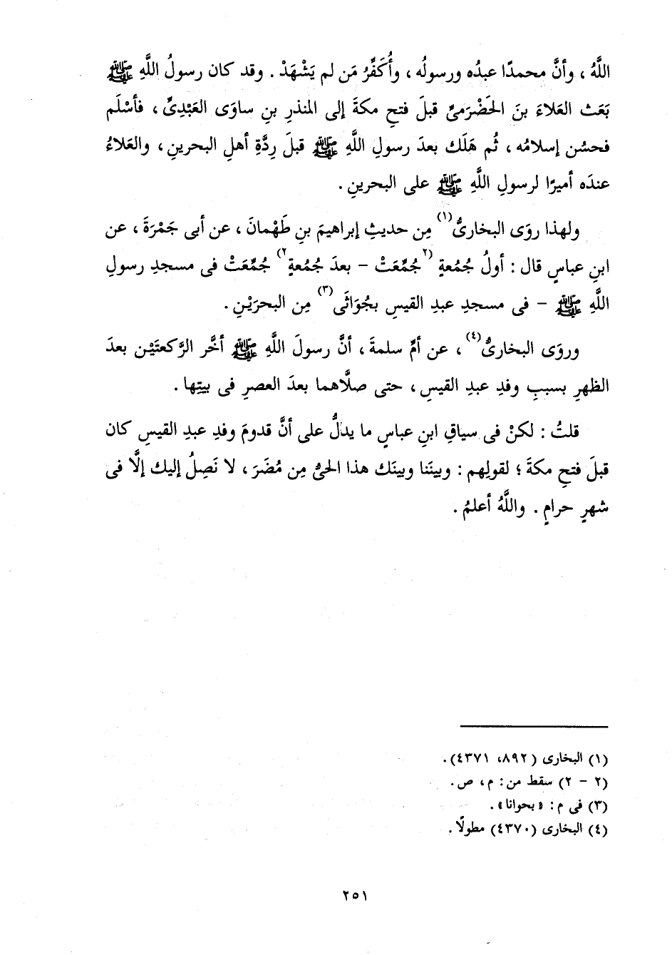 وَلِهَذَا رَوَى الْبُخَارِيُّ مِنْ حَدِيثِ إِبْرَاهِيمَ بْنِ طَهْمَانَ عَنْ أَبِي جَمْرَةَ عَنِ ابْنِ عَبَّاسٍ قَالَ: أَوَّلُ جُمُعَةٍ جُمِّعَتْ - بَعْدَ جُمُعَةٍ جُمِّعَتْ فِي مَسْجِدِ رَسُولِ اللَّهِ صَلَّى اللَّهُ عَلَيْهِ وَسَلَّمَ - فِي مَسْجِدِ عَبْدِ الْقَيْسِ بِجُوَاثَى مِنَ الْبَحْرَيْنِ. .
