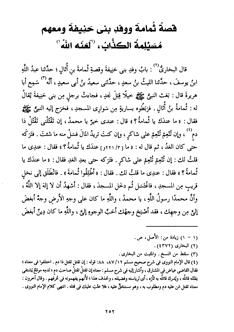 قَالَ الْبُخَارِيُّ: بَابُ وَفْدِ بَنِي حَنِيفَةَ وَقِصَّةِ ثُمَامَةَ بْنِ أُثَالٍ ; حَدَّثَنَا عَبْدُ اللَّهِ بْنُ يُوسُفَ حَدَّثَنَا اللَّيْثُ بْنُ سَعْدٍ حَدَّثَنِي سَعِيدُ بْنُ أَبِي سَعِيدٍ أَنَّهُ سَمِعَ أَبَا هُرَيْرَةَ قَالَ: «بَعَثَ النَّبِيُّ صَلَّى اللَّهُ عَلَيْهِ وَسَلَّمَ خَيْلًا قَبْلَ نَجْدٍ، فَجَاءَتْ بِرَجُلٍ مِنْ بَنِي حَنِيفَةَ يُقَالُ لَهُ: ثُمَامَةُ بْنُ أُثَالٍ. فَرَبَطُوهُ بِسَارِيَةٍ مِنْ سَوَارِي الْمَسْجِدِ، فَخَرَجَ إِلَيْهِ النَّبِيُّ صَلَّى اللَّهُ عَلَيْهِ وَسَلَّمَ فَقَالَ: " مَا عِنْدَكَ يَا ثُمَامَةُ؟ " قَالَ: عِنْدِي خَيْرٌ يَا مُحَمَّدُ، إِنْ تَقْتُلْنِي تَقْتُلْ ذَا دَمٍ، وَإِنْ تُنْعِمْ تُنْعِمْ عَلَى شَاكِرٍ، وَإِنْ كُنْتَ تُرِيدُ الْمَالَ فَسَلْ مِنْهُ مَا شِئْتَ. فَتَرَكَهُ حَتَّى كَانَ الْغَدُ ثُمَّ قَالَ لَهُ: " مَا عِنْدَكَ يَا ثُمَامَةُ؟ " فَقَالَ: عِنْدِي مَا قُلْتُ لَكَ. إِنْ تُنْعِمْ تُنْعِمْ عَلَى شَاكِرٍ. فَتَرَكَهُ حَتَّى بَعْدَ الْغَدِ فَقَالَ: مَا عِنْدَكَ يَا ثُمَامَةُ؟ فَقَالَ: عِنْدِي مَا قُلْتُ لَكَ. فَقَالَ: " أَطْلِقُوا ثُمَامَةَ ". فَانْطَلَقَ إِلَى نَخْلٍ قَرِيبٍ مِنَ الْمَسْجِدِ فَاغْتَسَلَ ثُمَّ دَخَلَ الْمَسْجِدَ فَقَالَ: أَشْهَدُ أَنْ لَا إِلَهَ إِلَّا اللَّهُ، وَأَنَّ مُحَمَّدًا رَسُولُ اللَّهِ، يَا مُحَمَّدُ، وَاللَّهِ مَا كَانَ عَلَى وَجْهِ الْأَرْضِ وَجْهٌ أَبْغَضَ إِلَيَّ مِنْ وَجْهِكَ، فَقَدْ أَصْبَحَ وَجْهُكَ أَحَبَّ الْوُجُوهِ إِلَيَّ، وَاللَّهِ مَا كَانَ دِينٌ أَبْغَضَ