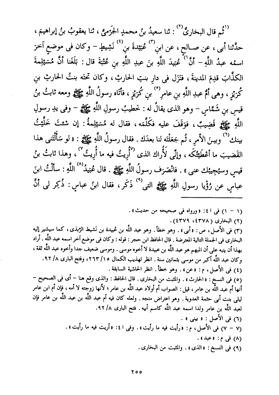 ثُمَّ قَالَ الْبُخَارِيُّ: ثنا سَعِيدُ بْنُ مُحَمَّدٍ الْجَرْمِيُّ ثنا يَعْقُوبُ بْنُ إِبْرَاهِيمَ حَدَّثَنَا أَبِي عَنْ صَالِحٍ عَنِ ابْنِ عُبَيْدَةَ بْنِ نَشِيطٍ - وَكَانَ فِي مَوْضِعٍ آخَرَ اسْمُهُ عَبْدُ اللَّهِ - أَنَّ عُبَيْدَ اللَّهِ بْنَ عَبْدِ اللَّهِ بْنِ عُتْبَةَ قَالَ: «بَلَغَنَا أَنَّ مُسَيْلِمَةَ الْكَذَّابَ قَدِمَ الْمَدِينَةَ، فَنَزَلَ فِي دَارِ بِنْتِ الْحَارِثِ، وَكَانَ تَحْتَهُ بِنْتُ الْحَارِثِ بْنِ كُرَيْزٍ، وَهِيَ أُمُّ عَبْدِ اللَّهِ بْنِ عَامِرِ بْنِ كُرَيْزٍ، فَأَتَاهُ رَسُولُ اللَّهِ صَلَّى اللَّهُ عَلَيْهِ وَسَلَّمَ وَمَعَهُ ثَابِتُ بْنُ قَيْسِ بْنِ شَمَّاسٍ - وَهُوَ الَّذِي يُقَالُ لَهُ: خَطِيبُ رَسُولِ اللَّهِ صَلَّى اللَّهُ عَلَيْهِ وَسَلَّمَ - وَفِي يَدِ رَسُولِ اللَّهِ صَلَّى اللَّهُ عَلَيْهِ وَسَلَّمَ قَضِيبٌ، فَوَقَفَ عَلَيْهِ فَكَلَّمَهُ، فَقَالَ لَهُ مُسَيْلِمَةُ: إِنْ شِئْتَ خَلَّيْتُ بَيْنَكَ وَبَيْنَ الْأَمْرِ ثُمَّ جَعَلْتَهُ لَنَا بَعْدَكَ. فَقَالَ رَسُولُ اللَّهِ صَلَّى اللَّهُ عَلَيْهِ وَسَلَّمَ: " لَوْ سَأَلْتَنِي هَذَا الْقَضِيبَ مَا أَعْطَيْتُكَهُ، وَإِنِّي لَأُرَاكَ الَّذِي أُرِيتُ فِيهِ مَا أُرِيتُ، وَهَذَا ثَابِتُ بْنُ قَيْسٍ وَسَيُجِيبُكَ عَنِّي ". فَانْصَرَفَ رَسُولُ اللَّهِ صَلَّى اللَّهُ عَلَيْهِ وَسَلَّمَ. قَالَ عُبَيْدُ اللَّهِ: سَأَلْتُ ابْنَ عَبَّاسٍ عَنْ رُؤْيَا رَسُولِ اللَّهِ صَلَّى اللَّهُ عَلَيْهِ وَسَلَّمَ الَّتِي ذَكَرَ، فَقَالَ ابْنُ عَبَّاسٍ: ذُكِرَ لِي أَنَّ