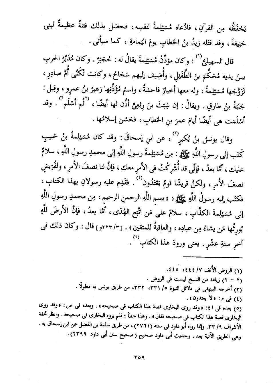 وَقَالَ يُونُسُ بْنُ بُكَيْرٍ عَنِ ابْنِ إِسْحَاقَ وَقَدْ كَانَ مُسَيْلِمَةُ بْنُ حَبِيبٍ كَتَبَ إِلَى رَسُولِ اللَّهِ صَلَّى اللَّهُ عَلَيْهِ وَسَلَّمَ: مِنْ مُسَيْلِمَةَ رَسُولِ اللَّهِ إِلَى مُحَمَّدٍ رَسُولِ اللَّهِ، سَلَامٌ عَلَيْكَ، أَمَّا بَعْدُ، فَإِنِّي قَدْ أُشْرِكْتُ فِي الْأَمْرِ مَعَكَ، فَإِنَّ لَنَا نِصْفَ الْأَمْرِ، وَلِقُرَيْشٍ نِصْفُ الْأَمْرِ، وَلَكِنَّ قُرَيْشًا قَوْمٌ يَعْتَدُونَ. فَقَدِمَ عَلَيْهِ رَسُولَانِ بِهَذَا الْكِتَابِ، فَكَتَبَ إِلَيْهِ رَسُولُ اللَّهِ صَلَّى اللَّهُ عَلَيْهِ وَسَلَّمَ: " بِسْمِ اللَّهِ الرَّحْمَنِ الرَّحِيمِ مِنْ مُحَمَّدٍ رَسُولِ اللَّهِ إِلَى مُسَيْلِمَةَ الْكَذَّابِ سَلَامٌ عَلَى مَنِ اتَّبَعَ الْهُدَى، أَمَّا بَعْدُ، فَإِنَّ الْأَرْضَ لِلَّهِ يُورِثُهَا مَنْ يَشَاءُ مِنْ عِبَادِهِ، وَالْعَاقِبَةُ لِلْمُتَّقِينَ " قَالَ: وَكَانَ ذَلِكَ فِي آخِرِ سَنَةِ عَشْرٍ. يَعْنِي وُرُودَ هَذَا الْكِتَابِ.