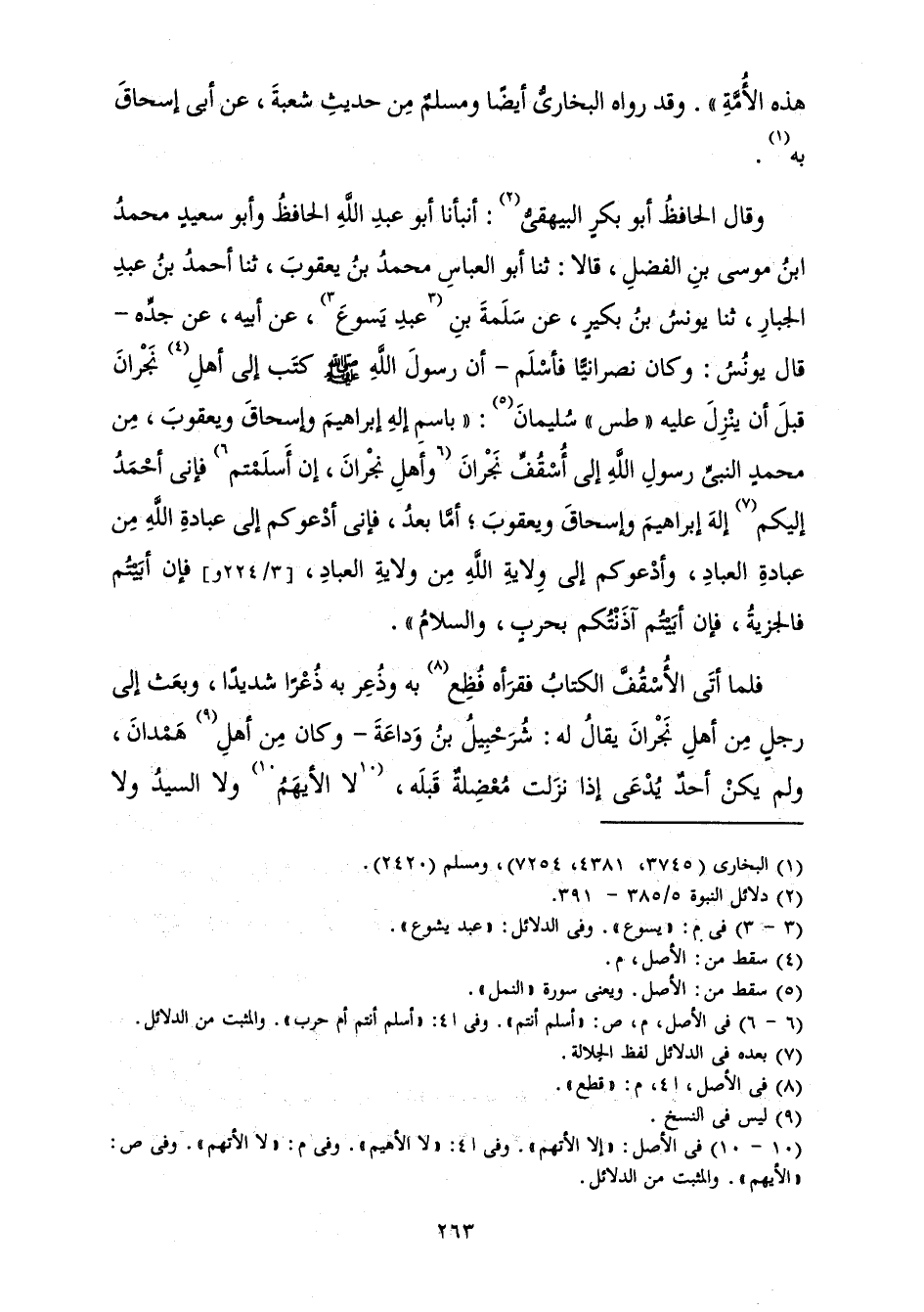 وَقَالَ الْحَافِظُ أَبُو بَكْرٍ الْبَيْهَقِيُّ: أَنْبَأَنَا أَبُو عَبْدِ اللَّهِ الْحَافِظُ وَأَبُو سَعِيدٍ مُحَمَّدُ بْنُ مُوسَى بْنِ الْفَضْلِ قَالَا: ثنا أَبُو الْعَبَّاسِ مُحَمَّدُ بْنُ يَعْقُوبَ ثنا أَحْمَدُ بْنُ عَبْدِ الْجَبَّارِ ثنا يُونُسُ بْنُ بُكَيْرٍ عَنْ سَلَمَةَ بْنِ عَبْدِ يَسُوعَ عَنْ أَبِيهِ، عَنْ جَدِّهِ قَالَ يُونُسُ: وَكَانَ نَصْرَانِيًّا فَأَسْلَمَ - «أَنَّ رَسُولَ اللَّهِ صَلَّى اللَّهُ عَلَيْهِ وَسَلَّمَ كَتَبَ إِلَى أَهْلِ نَجْرَانَ قَبْلَ أَنْ يَنْزِلَ عَلَيْهِ " طس " سُلَيْمَانَ: " بِاسْمِ إِلَهِ إِبْرَاهِيمَ وَإِسْحَاقَ وَيَعْقُوبَ، مِنْ مُحَمَّدٍ النَّبِيِّ رَسُولِ اللَّهِ إِلَى أُسْقُفِّ نَجْرَانَ، وَأَهْلِ نَجْرَانَ، إِنْ أَسْلَمْتُمْ فَإِنِّي أَحْمَدُ إِلَيْكُمْ إِلَهَ إِبْرَاهِيمَ وَإِسْحَاقَ وَيَعْقُوبَ ; أَمَّا بَعْدُ، فَإِنِّي أَدْعُوكُمْ إِلَى عِبَادَةِ اللَّهِ مِنْ عِبَادَةِ الْعِبَادِ، وَأَدْعُوكُمْ إِلَى وِلَايَةِ اللَّهِ مِنْ وِلَايَةِ الْعِبَادِ، فَإِنْ أَبَيْتُمْ فَالْجِزْيَةُ، فَإِنْ أَبَيْتُمْ، آذَنْتُكُمْ بِحَرْبٍ وَالسَّلَامُ» .