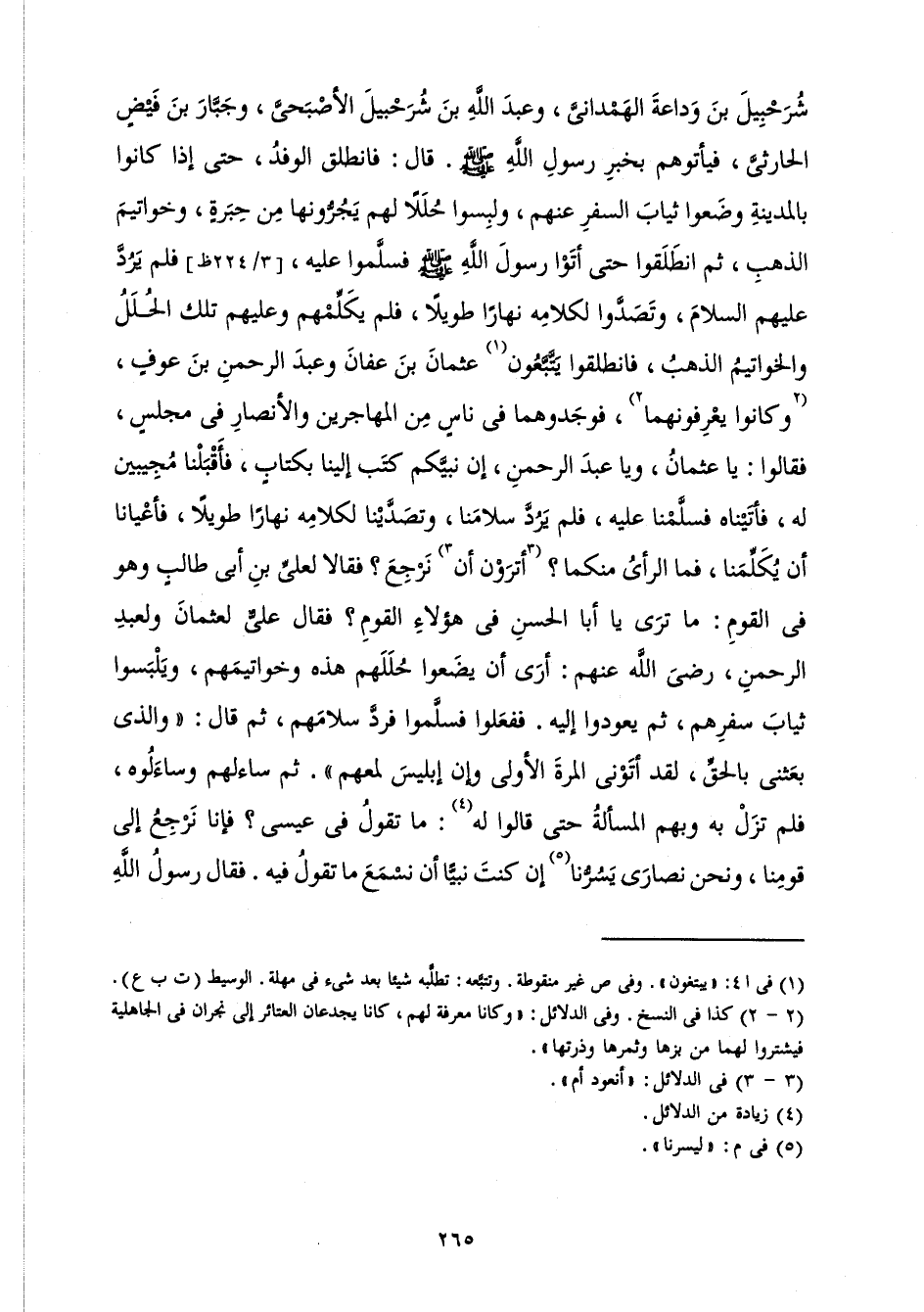 شُرَحْبِيلَ بْنَ وَدَاعَةَ الْهَمْدَانِيَّ وَعَبْدَ اللَّهِ بْنَ شُرَحْبِيلَ الْأَصْبَحِيَّ وَجَبَّارَ بْنَ فَيْضٍ الْحَارِثِيَّ فَيَأْتُوهُمْ بِخَبَرِ رَسُولِ اللَّهِ صَلَّى اللَّهُ عَلَيْهِ وَسَلَّمَ. قَالَ: فَانْطَلَقَ الْوَفْدُ حَتَّى إِذَا كَانُوا بِالْمَدِينَةِ وَضَعُوا ثِيَابَ السَّفَرِ عَنْهُمْ، وَلَبِسُوا حُلَلًا لَهُمْ يَجُرُّونَهَا ; مِنْ حِبَرَةٍ وَخَوَاتِيمَ الذَّهَبِ، ثُمَّ انْطَلَقُوا حَتَّى أَتَوْا رَسُولَ اللَّهِ صَلَّى اللَّهُ عَلَيْهِ وَسَلَّمَ فَسَلَّمُوا، فَلَمْ يَرُدَّ عَلَيْهِمُ السَّلَامَ، وَتَصَدَّوْا لِكَلَامِهِ نَهَارًا طَوِيلًا، فَلَمْ يُكَلِّمْهُمْ وَعَلَيْهِمْ تِلْكَ الْحُلَلُ وَالْخَوَاتِيمُ الذَّهَبُ، فَانْطَلَقُوا يَتَّبَّعُونَ عُثْمَانَ بْنَ عَفَّانَ وَعَبْدَ الرَّحْمَنِ بْنَ عَوْفٍ وَكَانُوا يَعْرِفُونَهُمَا، فَوَجَدُوهُمَا فِي نَاسٍ مِنَ الْمُهَاجِرِينَ وَالْأَنْصَارِ فِي مَجْلِسٍ، فَقَالُوا: يَا عُثْمَانُ وَيَا عَبْدَ الرَّحْمَنِ إِنَّ نَبِيَّكُمْ كَتَبَ إِلَيْنَا بِكِتَابٍ، فَأَقْبَلْنَا مُجِيبِينَ لَهُ، فَأَتَيْنَاهُ فَسَلَّمْنَا عَلَيْهِ، فَلَمْ يَرُدَّ سَلَامَنَا، وَتَصَدَّيْنَا لِكَلَامِهِ نَهَارًا طَوِيلًا، فَأَعْيَانَا أَنْ يُكَلِّمَنَا، فَمَا الرَّأْيُ مِنْكَمَا؟ أَتَرَوْنَ أَنْ نَرْجِعَ؟ فَقَالَا لِعَلِيِّ بْنِ أَبِي طَالِبٍ وَهُوَ فِي الْقَوْمِ: مَا تَرَى يَا أَبَا الْحَسَنِ فِي هَؤُلَاءِ الْقَوْمِ؟ فَقَالَ عَلِيٌّ لِعُثْمَانَ وَلِعَبْدِ الرَّحْمَنِ رَضِيَ اللَّهُ عَنْهُمْ: أَرَى أَنْ يَضَعُوا حُلَلَهُمْ هَذِهِ وَخَوَاتِيمَهُمْ، وَيَلْبَسُوا ثِيَابَ سَفَرِهِمْ، ثُمَّ يَعُودُوا إِلَيْهِ. فَفَعَلُوا فَسَلَّمُوا فَرَدَّ سَلَامَهُمْ، ثُمَّ قَالَ: " وَالَّذِي بَعَثَنِي بِالْحَقِّ، لَقَدْ أَتَوْنِي الْمَرَّةَ الْأُولَى وَإِنَّ إِبْلِيسَ لَمَعَهُمْ ". ثُمَّ سَاءَلَهُمْ وَسَاءَلُوهُ، فَلَمْ تَزَلْ بِهِ وَبِهِمُ الْمَسْأَلَةُ حَتَّى قَالُوا لَهُ: مَا تَقُولُ فِي عِيسَى؟ فَإِنَّا نَرْجِعُ إِلَى قَوْمِنَا، وَنَحْنُ نَصَارَى يَسُرُّنَا إِنْ كُنْتَ نَبِيًّا أَنْ نَسْمَعَ مَا تَقُولُ فِيهِ. فَقَالَ رَسُولُ اللَّهِ