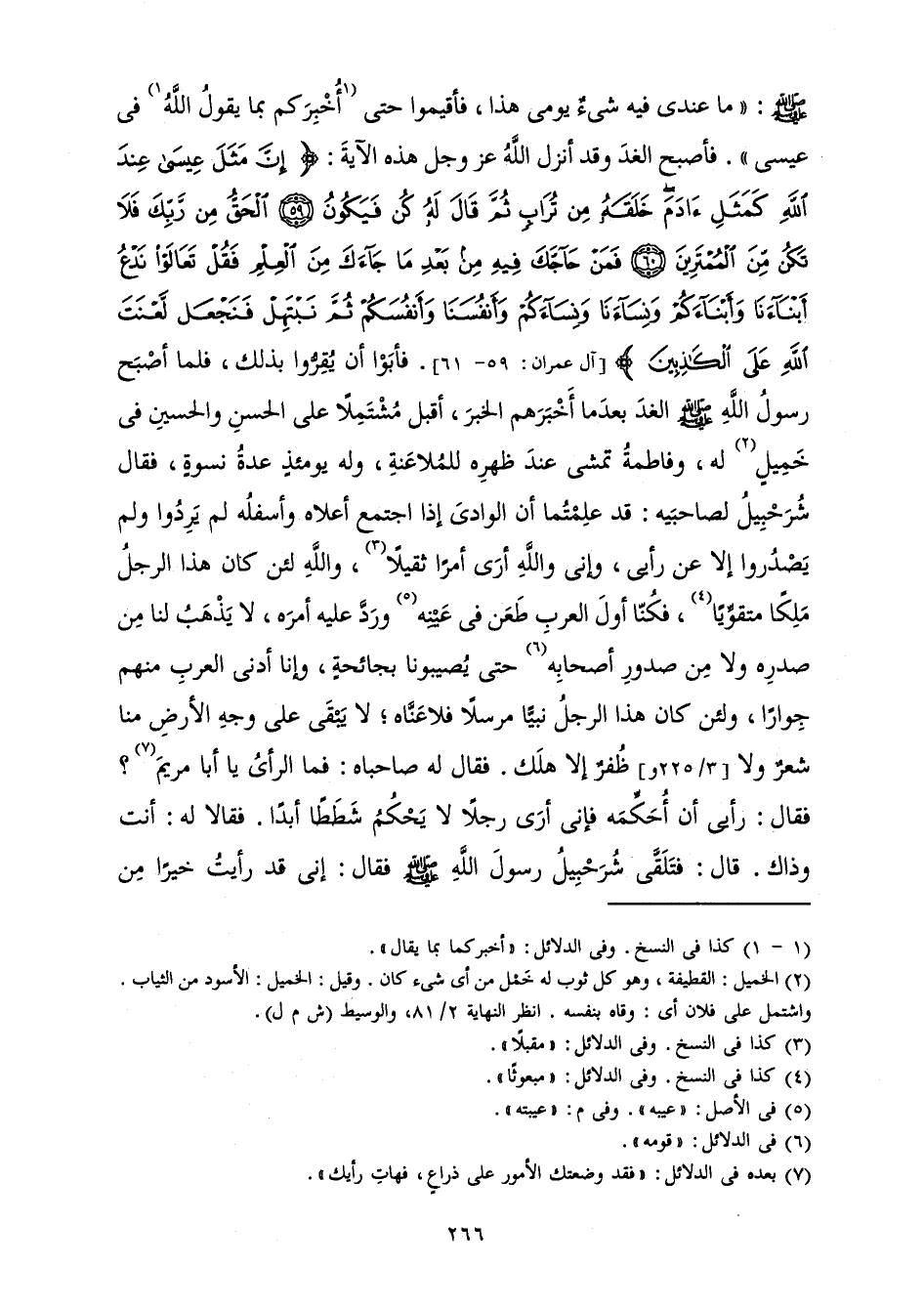 صَلَّى اللَّهُ عَلَيْهِ وَسَلَّمَ: " مَا عِنْدِي فِيهِ شَيْءٌ يَوْمِي هَذَا، فَأَقِيمُوا حَتَّى أُخْبِرَكُمْ بِمَا يَقُولُ اللَّهُ فِي عِيسَى ". فَأَصْبَحَ الْغَدُ وَقَدْ أَنْزَلَ اللَّهُ عَزَّ وَجَلَّ هَذِهِ الْآيَةَ " {إِنَّ مَثَلَ عِيسَى عِنْدَ اللَّهِ كَمَثَلِ آدَمَ خَلَقَهُ مِنْ تُرَابٍ ثُمَّ قَالَ لَهُ كُنْ فَيَكُونُ الْحَقُّ مِنْ رَبِّكَ فَلَا تَكُنْ مِنَ الْمُمْتَرِينَ فَمَنْ حَاجَّكَ فِيهِ مِنْ بَعْدِ مَا جَاءَكَ مِنَ الْعِلْمِ فَقُلْ تَعَالَوْا نَدْعُ أَبْنَاءَنَا وَأَبْنَاءَكُمْ وَنِسَاءَنَا وَنِسَاءَكُمْ وَأَنْفُسَنَا وَأَنْفُسَكُمْ ثُمَّ نَبْتَهِلْ فَنَجْعَلْ لَعْنَةَ اللَّهِ عَلَى الْكَاذِبِينَ} [آل عمران: 59] " [آلِ عِمْرَانَ: 59 - 61] فَأَبَوْا أَنْ يُقِرُّوا بِذَلِكَ فَلَمَّا أَصْبَحَ رَسُولُ اللَّهِ صَلَّى اللَّهُ عَلَيْهِ وَسَلَّمَ الْغَدَ بَعْدَ مَا أَخْبَرَهُمُ الْخَبَرَ، أَقْبَلَ مُشْتَمِلًا عَلَى الْحَسَنِ وَالْحُسَيْنِ فِي خَمِيلٍ لَهُ، وَفَاطِمَةُ تَمْشِي عِنْدَ ظَهْرِهِ لِلْمُلَاعَنَةِ، وَلَهُ يَوْمَئِذٍ عِدَّةُ نِسْوَةٍ، فَقَالَ شُرَحْبِيلُ لِصَاحِبَيْهِ: قَدْ عَلِمْتُمَا أَنَّ الْوَادِيَ إِذَا اجْتَمَعَ أَعْلَاهُ وَأَسْفَلُهُ لَمْ يَرِدُوا وَلَمْ يَصْدُرُوا إِلَّا عَنْ رَأْيِي، وَإِنِّي وَاللَّهِ أَرَى أَمْرًا ثَقِيلًا، وَاللَّهِ لَئِنْ كَانَ هَذَا الرَّجُلُ مَلِكَا مُتَقَوِّيًا، فَكُنَّا أَوَّلَ الْعَرَبِ طَعَنَ فِي عَيْنِهِ وَرَدَّ عَلَيْهِ أَمْرَهُ، لَا يَذْهَبُ لَنَا مِنْ صَدْرِهِ وَلَا مِنْ صُدُورِ أَصْحَابِهِ حَتَّى يُصِيبُونَا بِجَائِحَةٍ، وَإِنَّا أَدْنَى الْعَرَبِ مِنْهُمْ جِوَارًا، وَلَئِنْ كَانَ هَذَا الرَّجُلُ نَبِيًّا مُرْسَلًا فَلَاعَنَّاهُ ; لَا يَبْقَى عَلَى وَجْهِ الْأَرْضِ مِنَّا شَعْرٌ وَلَا ظُفْرٌ إِلَّا هَلَكَ. فَقَالَ لَهُ صَاحِبَاهُ: فَمَا الرَّأْيُ يَا أَبَا مَرْيَمَ؟ فَقَالَ: رَأْيِي أَنَّ أُحَكِّمَهُ فَإِنِّي أَرَى رَجُلًا لَا يَحْكُمُ شَطَطًا أَبَدًا. فَقَالَا لَهُ: أَنْتَ وَذَاكَ. قَالَ: فَتَلَقَّى شُرَحْبِيلُ رَسُولَ اللَّهِ صَلَّى اللَّهُ عَلَيْهِ وَسَلَّمَ فَقَالَ: إِنِّي قَدْ رَأَيْتُ خَيْرًا مِنْ