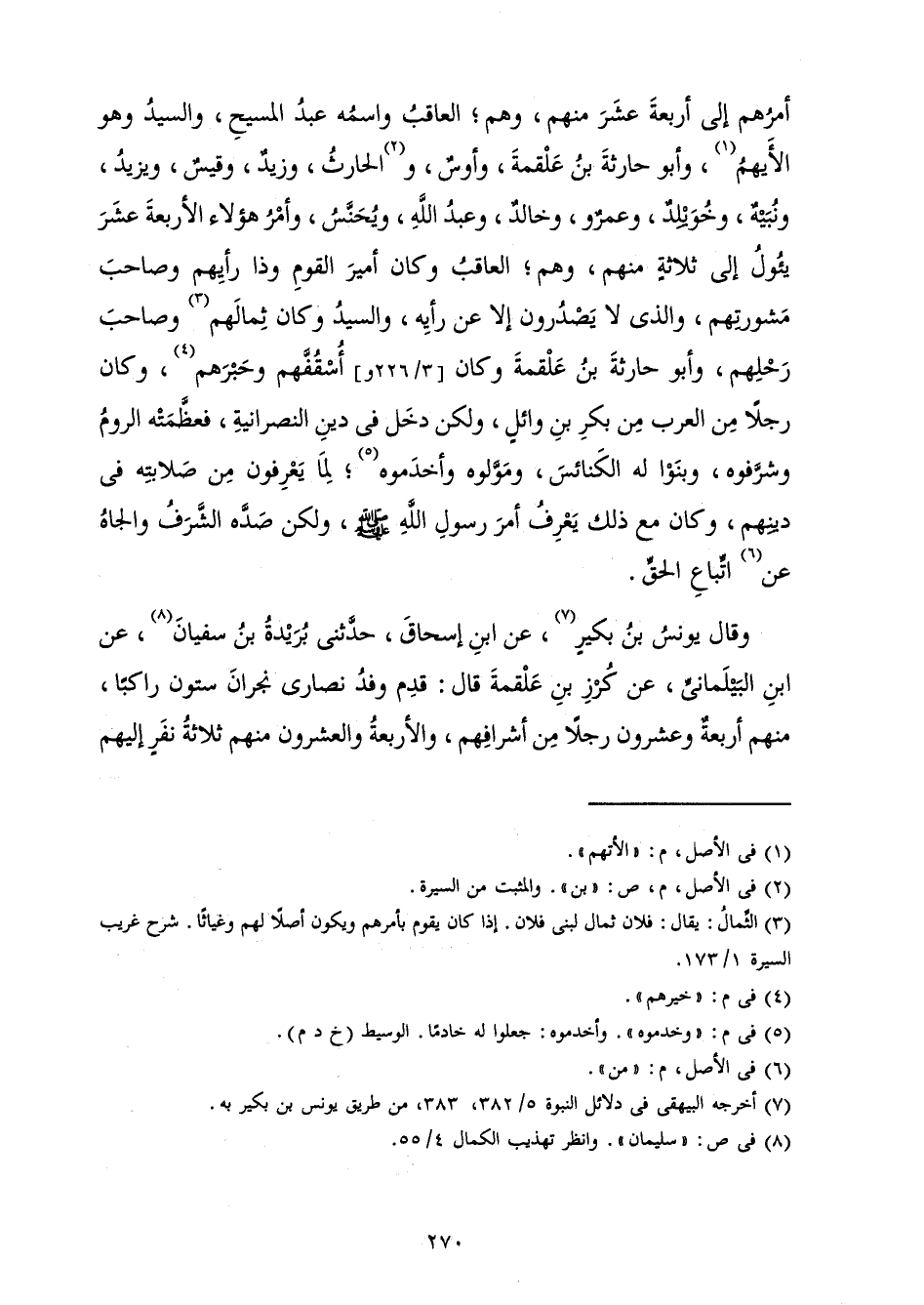 أَمْرُهُمْ إِلَى أَرْبَعَةَ عَشَرَ مِنْهُمْ، وَهُمْ الْعَاقِبُ وَاسْمُهُ عَبْدُ الْمَسِيحِ وَالسَّيِّدُ وَهُوَ الْأَيْهَمُ وَأَبُو حَارِثَةَ بْنُ عَلْقَمَةَ وَأَوْسٌ وَالْحَارِثُ وَزَيْدٌ وَقَيْسٌ وَيَزِيدُ وَنُبَيْهٌ وَخُوَيْلِدٌ وَعَمْرٌو وَخَالِدٌ وَعَبْدُ اللَّهِ وَيُحَنَّسُ وَأَمْرُ هَؤُلَاءِ الْأَرْبَعَةَ عَشَرَ يَئُولُ إِلَى ثَلَاثَةٍ مِنْهُمْ، وَهُمْ ; الْعَاقِبُ وَكَانَ أَمِيرَ الْقَوْمِ وَذَا رَأْيهِمْ وَصَاحِبَ مَشُورَتِهِمْ، وَالَّذِي لَا يَصْدُرُونَ إِلَّا عَنْ رَأْيِهِ وَالسَّيِّدُ وَكَانَ ثِمَالَهُمْ وَصَاحِبَ رَحْلِهِمْ وَأَبُو حَارِثَةَ بْنُ عَلْقَمَةَ وَكَانَ أُسْقُفَّهُمْ وَحَبْرَهُمْ، وَكَانَ رَجُلًا مِنَ الْعَرَبِ مِنْ بَكْرِ بْنِ وَائِلٍ، وَلَكِنْ دَخَلَ فِي دِينِ النَّصْرَانِيَّةِ، فَعَظَّمَتْهُ الرُّومُ وَشَرَّفُوهُ، وَبَنَوْا لَهُ الْكَنَائِسَ، وَمَوَّلُوهُ وَأَخْدَمُوهُ ; لِمَا يَعْرِفُونَ مِنْ صَلَابَتِهِ فِي دِينِهِمْ، وَكَانَ مَعَ ذَلِكَ يَعْرِفُ أَمْرَ رَسُولِ اللَّهِ صَلَّى اللَّهُ عَلَيْهِ وَسَلَّمَ، وَلَكِنْ صَدَّهُ الشَّرَفُ وَالْجَاهُ عَنِ اتِّبَاعِ الْحَقِّ.