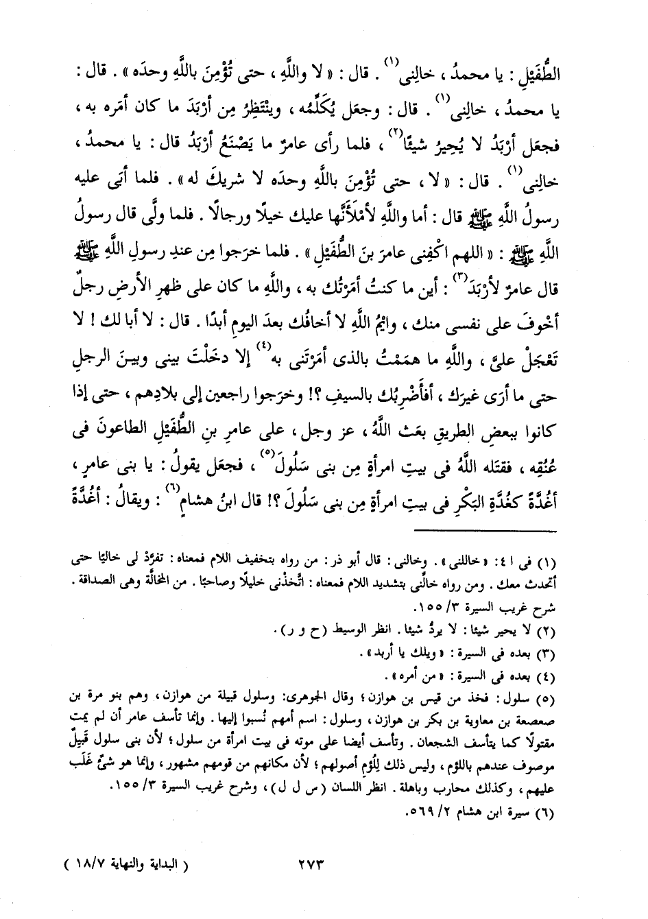 الطُّفَيْلِ يَا مُحَمَّدُ، خَالِنِي. قَالَ: " لَا وَاللَّهِ حَتَّى تُؤْمِنَ بِاللَّهِ وَحْدَهُ ". قَالَ: يَا مُحَمَّدُ، خَالِنِي. قَالَ: وَجَعَلَ يُكَلِّمُهُ، وَيَنْتَظِرُ مِنْ أَرْبَدَ مَا كَانَ أَمَرَهُ بِهِ، فَجَعَلَ أَرْبَدُ لَا يُحِيرُ شَيْئًا، فَلَمَّا رَأَى عَامِرٌ مَا يَصْنَعُ أَرْبَدُ قَالَ: يَا مُحَمَّدُ، خَالِنِي. قَالَ: " لَا حَتَّى تُؤْمِنَ بِاللَّهِ وَحْدَهُ لَا شَرِيكَ لَهُ ". فَلَمَّا أَبَى عَلَيْهِ رَسُولُ اللَّهِ صَلَّى اللَّهُ عَلَيْهِ وَسَلَّمَ قَالَ: أَمَا وَاللَّهِ لَأَمْلَأَنَّهَا عَلَيْكَ خَيْلًا وَرِجَالًا. فَلَمَّا وَلَّى قَالَ رَسُولُ اللَّهِ صَلَّى اللَّهُ عَلَيْهِ وَسَلَّمَ: " اللَّهُمَّ اكْفِنِي عَامِرَ بْنَ الطُّفَيْلِ ". فَلَمَّا خَرَجُوا مِنْ عِنْدِ رَسُولِ اللَّهِ صَلَّى اللَّهُ عَلَيْهِ وَسَلَّمَ قَالَ عَامِرٌ لِأَرْبَدَ: أَيْنَ مَا كُنْتُ أَمَرْتُكَ بِهِ، وَاللَّهِ مَا كَانَ عَلَى ظَهْرِ الْأَرْضِ رَجُلٌ أَخْوَفَ عَلَى نَفْسِي مِنْكَ، وَايْمُ اللَّهِ لَا أَخَافُكَ بَعْدَ الْيَوْمِ أَبَدًا. قَالَ: لَا أَبًا لَكَ! لَا تَعْجَلْ عَلَيَّ، وَاللَّهِ مَا هَمَمْتُ بِالَّذِي أَمَرْتَنِي بِهِ إِلَّا دَخَلْتَ بَيْنِي وَبَيْنَ الرَّجُلِ حَتَّى مَا أَرَى غَيْرَكَ، أَفَأَضْرِبُكَ بِالسَّيْفِ؟ ! وَخَرَجُوا رَاجِعِينَ إِلَى بِلَادِهِمْ، حَتَّى إِذَا كَانُوا بِبَعْضِ الطَّرِيقِ بَعَثَ اللَّهُ، عَزَّ وَجَلَّ، عَلَى عَامِرِ بْنِ الطُّفَيْلِ الطَّاعُونَ فِي عُنُقِهِ، فَقَتَلَهُ اللَّهُ فِي بَيْتِ امْرَأَةٍ مِنْ بَنِي سَلُولٍ، فَجَعَلَ يَقُولُ: يَا بَنِي عَامِرٍ، أَغُدَّةً كَغُدَّةِ الْبِكْرِ فِي بَيْتِ امْرَأَةٍ مِنْ بَنِي سَلُولٍ؟ ! قَالَ ابْنُ هِشَامٍ وَيُقَالُ: أَغُدَّةً