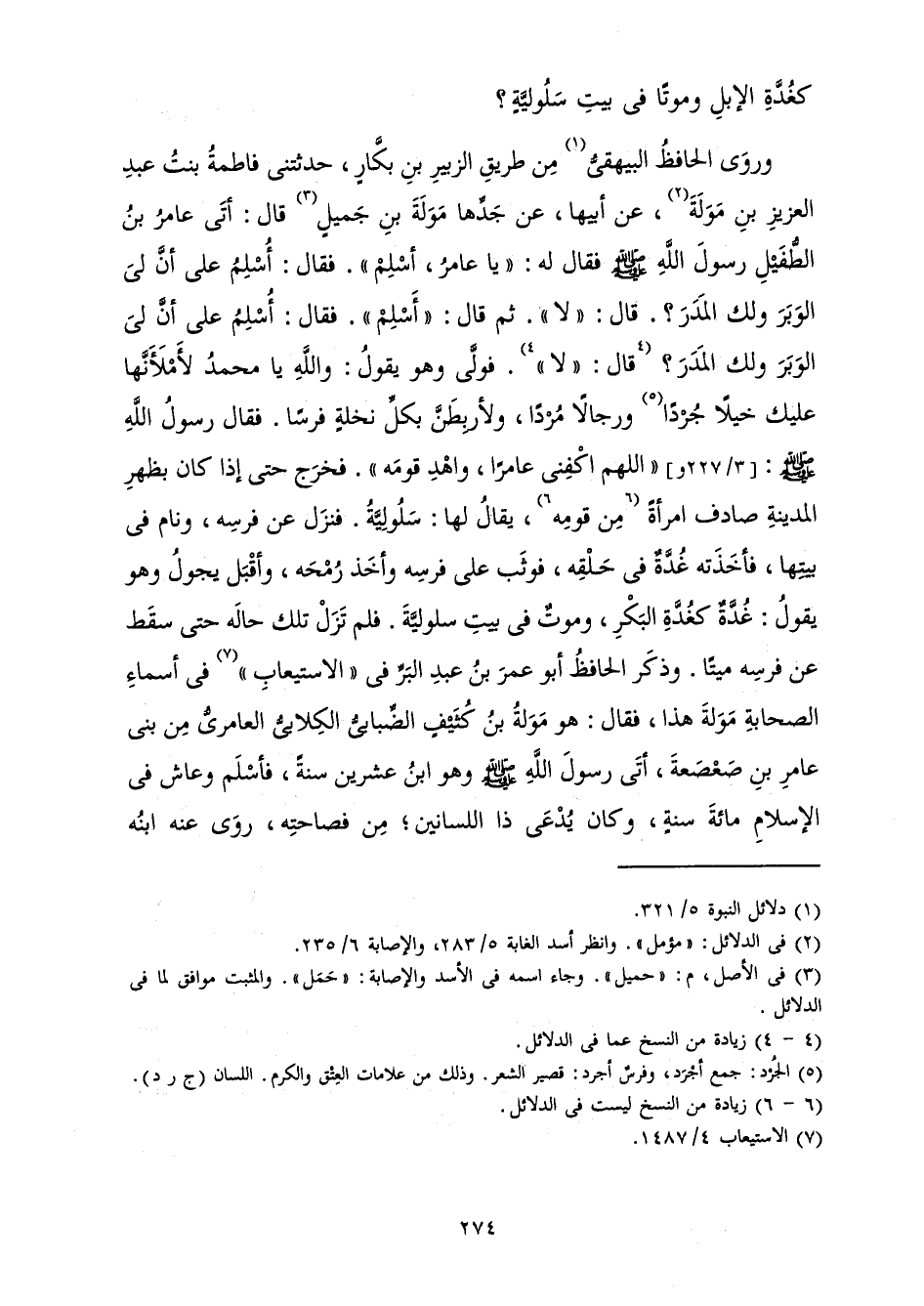 وَرَوَى الْحَافِظُ الْبَيْهَقِيُّ مِنْ طَرِيقِ الزُّبَيْرِ بْنِ بَكَّارٍ حَدَّثَتْنِي فَاطِمَةُ بِنْتُ عَبْدِ الْعَزِيزِ بْنِ مَوَلَةَ، عَنْ أَبِيهَا، عَنْ جَدِّهَا مَوَلَةَ بْنِ جَمِيلٍ قَالَ: أَتَى عَامِرُ بْنُ الطُّفَيْلِ رَسُولَ اللَّهِ صَلَّى اللَّهُ عَلَيْهِ وَسَلَّمَ فَقَالَ لَهُ: " يَا عَامِرُ أَسْلِمْ ". فَقَالَ: أُسْلِمُ عَلَى أَنَّ لِي الْوَبَرَ وَلَكَ الْمَدَرَ؟ قَالَ: " لَا " ثُمَّ قَالَ: " أَسْلِمْ ". فَقَالَ: أُسْلِمُ عَلَى أَنَّ لِي الْوَبَرَ وَلَكَ الْمَدَرَ؟ قَالَ: " لَا ". فَوَلَّى وَهُوَ يَقُولُ: وَاللَّهِ يَا مُحَمَّدُ لَأَمْلَأَنَّهَا عَلَيْكَ خَيْلًا جُرْدًا وَرِجَالًا مُرْدًا، وَلَأَرْبِطَنَّ بِكُلِّ نَخْلَةٍ فَرَسًا. فَقَالَ رَسُولُ اللَّهِ صَلَّى اللَّهُ عَلَيْهِ وَسَلَّمَ: " اللَّهُمَّ اكْفِنِي عَامِرًا وَاهْدِ قَوْمَهُ ". فَخَرَجَ حَتَّى إِذَا كَانَ بِظَهْرِ الْمَدِينَةِ صَادَفَ امْرَأَةً مِنْ قَوْمِهِ، يُقَالُ لَهَا: سَلُولِيَّةٌ. فَنَزَلَ عَنْ فَرَسِهِ، وَنَامَ فِي بَيْتِهَا، فَأَخَذَتْهُ غُدَّةٌ فِي حَلْقِهِ، فَوَثَبَ عَلَى فَرَسِهِ وَأَخَذَ رُمْحَهُ، وَأَقْبَلَ يَجُولُ وَهُوَ يَقُولُ: غُدَّةٌ كَغُدَّةِ الْبِكْرِ، وَمَوْتٌ فِي بَيْتِ سَلُولِيَّةٍ. فَلَمْ تَزَلْ تِلْكَ حَالُهُ حَتَّى سَقَطَ عَنْ فَرَسِهِ مَيِّتًا. وَذَكَرَ الْحَافِظُ أَبُو عُمَرَ بْنُ عَبْدِ الْبَرِّ فِي " الِاسْتِيعَابِ " فِي أَسْمَاءِ الصَّحَابَةِ مَوَلَةَ هَذَا، فَقَالَ: هُوَ مَوَلَةُ بْنُ كُثَيْفٍ الضَّبَابِيُّ الْكِلَابِيُّ الْعَامِرِيُّ مِنْ بَنِي عَامِرِ بْنِ صَعْصَعَةَ، أَتَى رَسُولَ اللَّهِ صَلَّى اللَّهُ عَلَيْهِ وَسَلَّمَ وَهُوَ ابْنُ عِشْرِينَ سَنَةً، فَأَسْلَمَ وَعَاشَ فِي الْإِسْلَامِ مِائَةَ سَنَةٍ، وَكَانَ يُدْعَى ذَا اللِّسَانَيْنِ ; مِنْ فَصَاحَتِهِ، رَوَى عَنْهُ ابْنُهُ