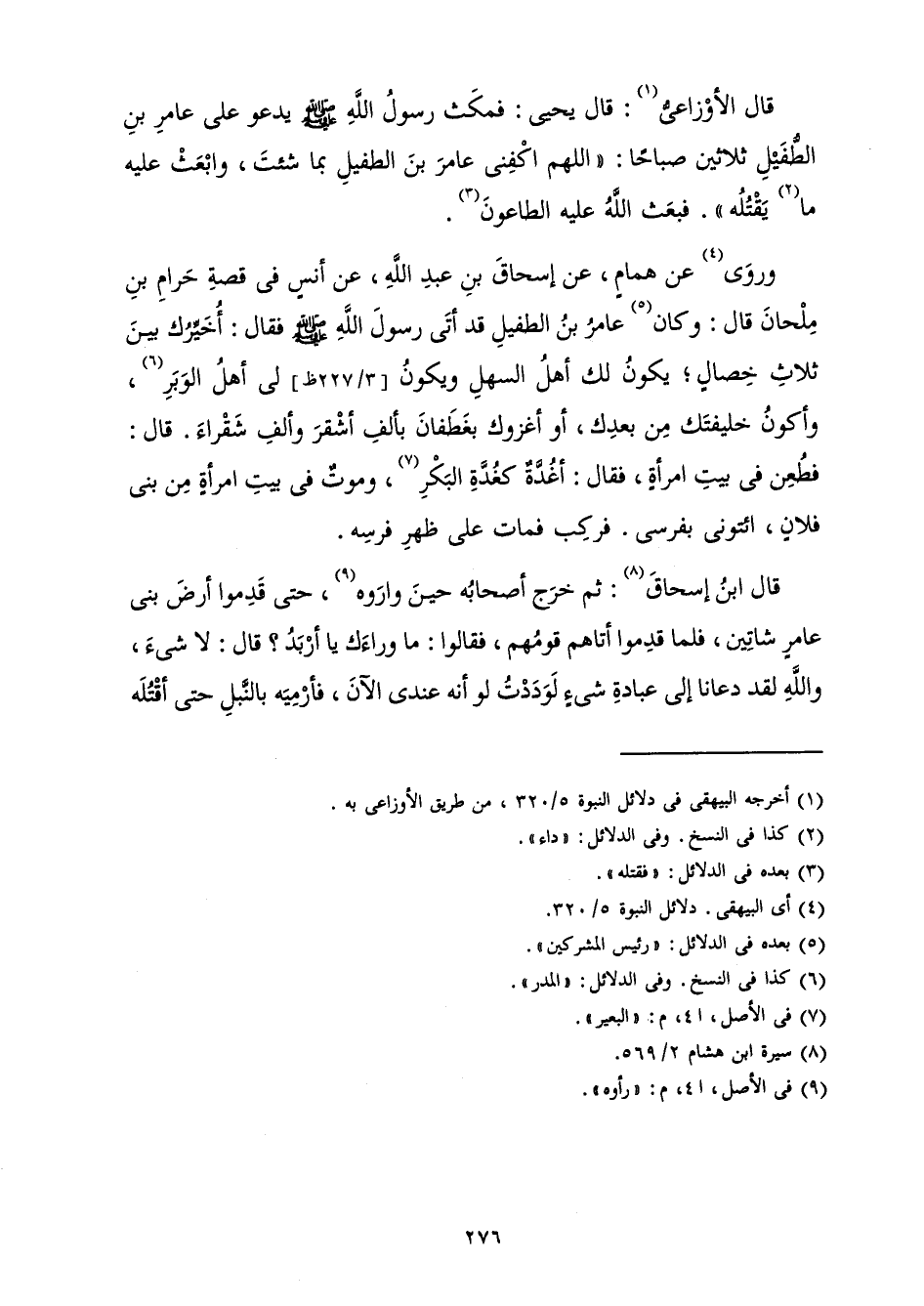 قَالَ الْأَوْزَاعِيُّ: قَالَ يَحْيَى: فَمَكَثَ رَسُولُ اللَّهِ صَلَّى اللَّهُ عَلَيْهِ وَسَلَّمَ يَدْعُو عَلَى عَامِرِ بْنِ الطُّفَيْلِ ثَلَاثِينَ صَبَاحًا: «اللَّهُمَّ اكْفِنِي عَامِرَ بْنَ الطُّفَيْلِ بِمَا شِئْتَ، وَابْعَثْ عَلَيْهِ مَا يَقْتُلُهُ» . فَبَعَثَ اللَّهُ عَلَيْهِ الطَّاعُونَ.