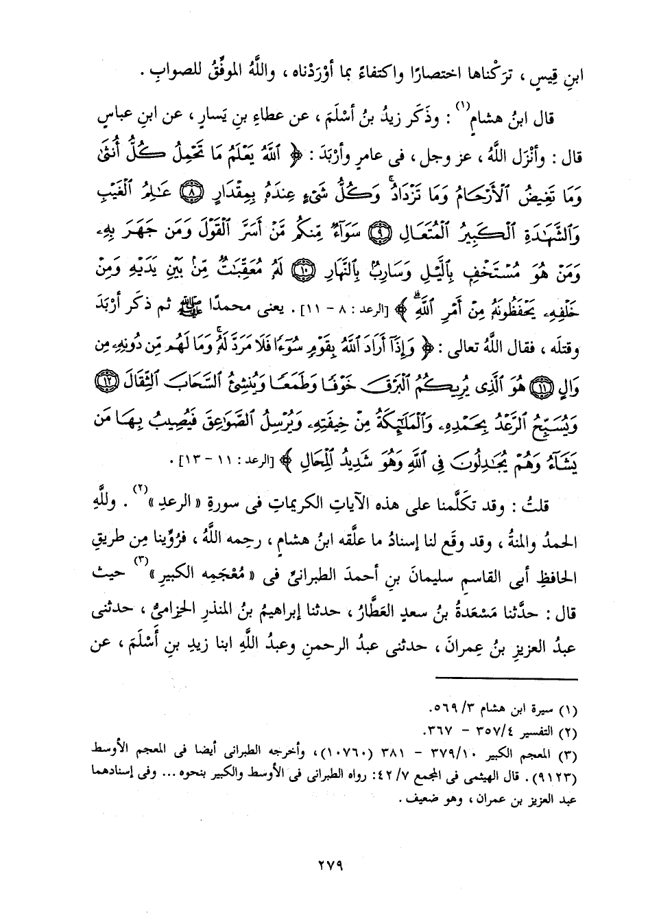 قُلْتُ: وَقَدْ تَكَلَّمْنَا عَلَى هَذِهِ الْآيَاتِ الْكَرِيمَاتِ فِي سُورَةِ " الرَّعْدِ ". وَلِلَّهِ الْحَمْدُ وَالْمِنَّةُ، وَقَدْ وَقَعَ لَنَا إِسْنَادُ مَا عَلَّقَهُ ابْنُ هِشَامٍ، رَحِمَهُ اللَّهُ، فَرَوَيْنَا مِنْ طَرِيقِ الْحَافِظِ أَبِي الْقَاسِمِ سُلَيْمَانَ بْنِ أَحْمَدَ الطَّبَرَانِيِّ فِي " مُعْجَمِهِ الْكَبِيرِ " حَيْثُ قَالَ: حَدَّثَنَا مَسْعَدَةُ بْنُ سَعْدٍ الْعَطَّارُ حَدَّثَنَا إِبْرَاهِيمُ بْنُ الْمُنْذِرِ الْحِزَامِيُّ حَدَّثَنِي عَبْدُ الْعَزِيزِ بْنُ عِمْرَانَ حَدَّثَنِي عَبْدُ الرَّحْمَنِ وَعَبْدُ اللَّهِ ابْنَا زَيْدِ بْنِ أَسْلَمَ عَنْ