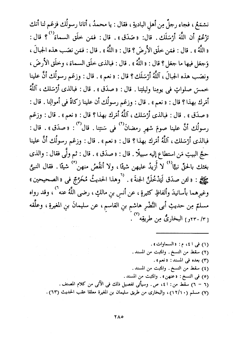 نَسْمَعُ، فَجَاءَ رَجُلٌ مِنْ أَهْلِ الْبَادِيَةِ فَقَالَ: يَا مُحَمَّدُ، أَتَانَا رَسُولُكَ فَزَعَمَ لَنَا أَنَّكَ تَزْعُمُ أَنَّ اللَّهَ أَرْسَلَكَ. قَالَ: " صَدَقَ ". قَالَ: فَمَنْ خَلَقَ السَّمَاءَ؟ قَالَ: " اللَّهُ ". قَالَ: فَمَنْ خَلَقَ الْأَرْضَ؟ قَالَ: " اللَّهُ ". قَالَ: فَمَنْ نَصَبَ هَذِهِ الْجِبَالَ وَجَعَلَ فِيهَا مَا جَعَلَ؟ قَالَ: " اللَّهُ ". قَالَ: فَبِالَّذِي خَلَقَ السَّمَاءَ، وَخَلَقَ الْأَرْضَ وَنَصَبَ هَذِهِ الْجِبَالَ، آللَّهُ أَرْسَلَكَ؟ قَالَ: " نَعَمْ ". قَالَ: وَزَعَمَ رَسُولُكَ أَنَّ عَلَيْنَا خَمْسَ صَلَوَاتٍ فِي يَوْمِنَا وَلَيْلَتِنَا. قَالَ: " صَدَقَ ". قَالَ: فَبِالَّذِي أَرْسَلَكَ آللَّهُ أَمَرَكَ بِهَذَا؟ قَالَ: " نَعَمْ ". قَالَ: وَزَعَمَ رَسُولُكَ أَنَّ عَلَيْنَا زَكَاةً فِي أَمْوَالِنَا. قَالَ: " صَدَقَ ". قَالَ: فَبِالَّذِي أَرْسَلَكَ، آللَّهُ أَمَرَكَ بِهَذَا؟ قَالَ: " نَعَمْ ". قَالَ: وَزَعَمَ رَسُولُكَ أَنَّ عَلَيْنَا صَوْمَ شَهْرِ رَمَضَانَ فِي سَنَتِنَا. قَالَ: " صَدَقَ ". قَالَ: فَبِالَّذِي أَرْسَلَكَ، آللَّهُ أَمَرَكَ بِهَذَا؟ قَالَ: " نَعَمْ ". قَالَ: وَزَعَمَ رَسُولُكَ أَنَّ عَلَيْنَا حَجَّ الْبَيْتِ مَنِ اسْتَطَاعَ إِلَيْهِ سَبِيلًا. قَالَ: " صَدَقَ ". قَالَ: ثُمَّ وَلَّى، فَقَالَ: وَالَّذِي بَعَثَكَ بِالْحَقِّ نَبِيًّا لَا أَزِيدُ عَلَيْهِنَّ شَيْئًا، وَلَا أَنْقُصُ مِنْهُنَّ شَيْئًا. فَقَالَ النَّبِيُّ صَلَّى اللَّهُ عَلَيْهِ وَسَلَّمَ: " لَئِنْ صَدَقَ لَيَدْخُلَنَّ الْجَنَّةَ» ". وَهَذَا الْحَدِيثُ مُخَرَّجٌ فِي " الصَّحِيحَيْنِ " وَغَيْرِهِمَا بِأَسَانِيدَ وَأَلْفَاظٍ كَثِيرَةٍ، عَنْ أَنَسِ بْنِ مَالِكٍ رَضِيَ اللَّهُ عَنْهُ، وَقَدْ رَوَاهُ مُسْلِمٌ مِنْ حَدِيثِ أَبِي النَّضْرِ هَاشِمِ بْنِ الْقَاسِمِ عَنْ سُلَيْمَانَ بْنِ الْمُغِيرَةِ وَعَلَّقَهُ الْبُخَارِيُّ مِنْ طَرِيقِهِ.