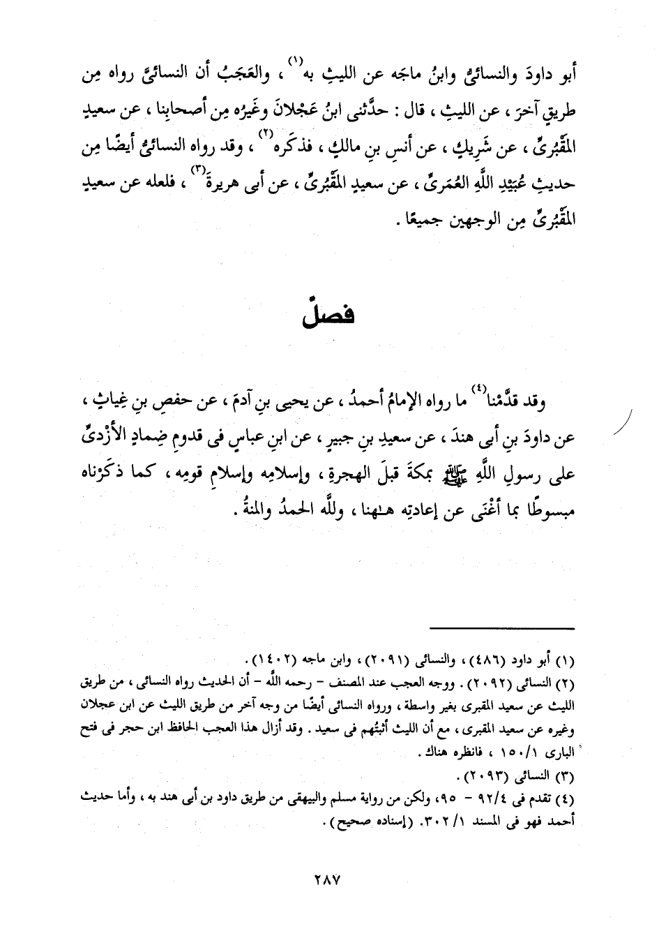 أَبُو دَاوُدَ وَالنَّسَائِيُّ وَابْنُ مَاجَهْ عَنِ اللَّيْثِ بِهِ، وَالْعَجَبُ أَنَّ النَّسَائِيَّ رَوَاهُ مِنْ طَرِيقٍ آخَرَ، عَنِ اللَّيْثِ قَالَ: حَدَّثَنِي ابْنُ عَجْلَانَ وَغَيْرُهُ مِنْ أَصْحَابِنَا عَنْ سَعِيدٍ الْمَقْبُرِيِّ عَنْ شَرِيكٍ عَنْ أَنَسِ بْنِ مَالِكٍ فَذَكَرَهُ، وَقَدْ رَوَاهُ النَّسَائِيُّ أَيْضًا مِنْ حَدِيثِ عُبَيْدِ اللَّهِ الْعُمَرِيِّ عَنْ سَعِيدٍ الْمَقْبُرِيِّ عَنْ أَبِي هُرَيْرَةَ فَلَعَلَّهُ عَنْ سَعِيدٍ الْمَقْبُرِيِّ مِنَ الْوَجْهَيْنِ جَمِيعًا.