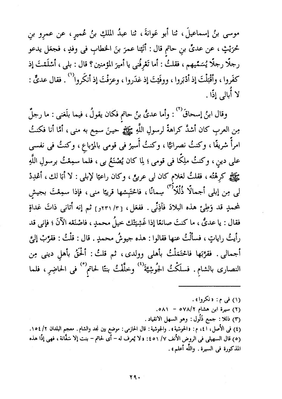 وَقَالَ ابْنُ إِسْحَاقَ: وَأَمَّا عَدِيُّ بْنُ حَاتِمٍ فَكَانَ يَقُولُ، فِيمَا بَلَغَنِي: مَا رَجُلٌ مِنَ الْعَرَبِ كَانَ أَشَدَّ كَرَاهَةً لِرَسُولِ اللَّهِ صَلَّى اللَّهُ عَلَيْهِ وَسَلَّمَ حِينَ سَمِعَ بِهِ مِنِّي، أَمَّا أَنَا فَكُنْتُ امْرَأً شَرِيفًا، وَكُنْتُ نَصْرَانِيًّا، وَكُنْتُ أَسِيرُ فِي قَوْمِي بِالْمِرْبَاعِ، وَكُنْتُ فِي نَفْسِي عَلَى دِينٍ، وَكُنْتُ مَلِكًا فِي قَوْمِي ; لِمَا كَانَ يُصْنَعُ بِي، فَلَمَّا سَمِعْتُ بِرَسُولِ اللَّهِ صَلَّى اللَّهُ عَلَيْهِ وَسَلَّمَ كَرِهْتُهُ، فَقُلْتُ لِغُلَامٍ كَانَ لِي عَرَبِيٍّ، وَكَانَ رَاعِيًا لِإِبِلِي: لَا أَبًا لَكَ، أُعْدُدْ لِي مِنْ إِبِلِي أَجْمَالًا ذُلُلًا سِمَانًا، فَاحْتَبِسْهَا قَرِيبًا مِنِّي، فَإِذَا سَمِعْتَ بِجَيْشٍ لِمُحَمَّدٍ قَدْ وَطِئَ هَذِهِ الْبِلَادَ فَآذِنِّي، فَفَعَلَ، ثُمَّ أَنَّهُ أَتَانِي ذَاتَ غَدَاةٍ فَقَالَ: يَا عَدِيُّ مَا كُنْتَ صَانِعًا إِذَا غَشِيَتْكَ خَيْلُ مُحَمَّدٍ، فَاصْنَعْهُ الْآنَ ; فَإِنِّي قَدْ رَأَيْتُ رَايَاتٍ، فَسَأَلْتُ عَنْهَا فَقَالُوا: هَذِهِ جُيُوشُ مُحَمَّدٍ. قَالَ: قُلْتُ: فَقَرِّبْ إِلَى أَجْمَالِي، فَقَرَّبَهَا فَاحْتَمَلْتُ بِأَهْلِي وَوَلَدِي، ثُمَّ قُلْتُ: أَلْحَقُ بِأَهْلِ دِينِي مِنَ النَّصَارَى بِالشَّامِ. فَسَلَكْتُ الْجُوشِيَّةَ وَخَلَّفْتُ بِنْتًا لِحَاتِمٍ فِي الْحَاضِرِ، فَلَمَّا