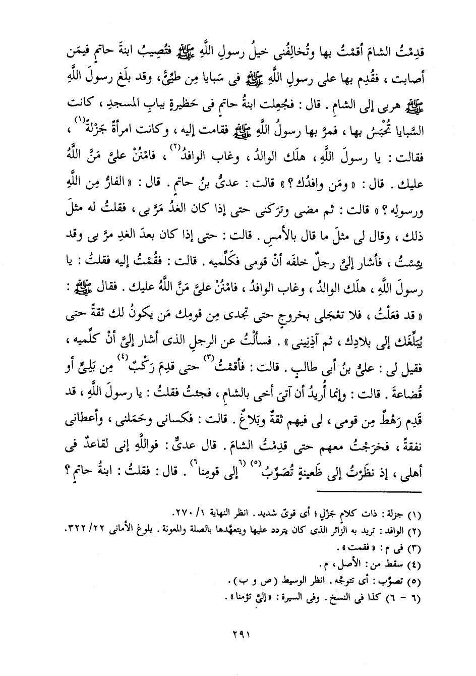 قَدِمْتُ الشَّامَ أَقَمْتُ بِهَا وَتُخَالِفُنِي خَيْلُ رَسُولِ اللَّهِ صَلَّى اللَّهُ عَلَيْهِ وَسَلَّمَ فَتُصِيبُ ابْنَةَ حَاتِمٍ فِيمَنْ أَصَابَتْ، فَقُدِمَ بِهَا عَلَى رَسُولِ اللَّهِ صَلَّى اللَّهُ عَلَيْهِ وَسَلَّمَ فِي سَبَايَا مِنْ طَيِّئٍ، وَقَدْ بَلَغَ رَسُولَ اللَّهِ صَلَّى اللَّهُ عَلَيْهِ وَسَلَّمَ هَرَبِي إِلَى الشَّامِ. قَالَ: فَجُعِلَتِ ابْنَةُ حَاتِمٍ فِي حَظِيرَةٍ بِبَابِ الْمَسْجِدِ، كَانَتِ السَّبَايَا تُحْبَسُ بِهَا، فَمَرَّ بِهَا رَسُولُ اللَّهِ صَلَّى اللَّهُ عَلَيْهِ وَسَلَّمَ فَقَامَتْ إِلَيْهِ، وَكَانَتِ امْرَأَةً جَزْلَةً فَقَالَتْ: يَا رَسُولَ اللَّهِ، هَلَكَ الْوَالِدُ، وَغَابَ الْوَافِدُ، فَامْنُنْ عَلَيَّ مَنَّ اللَّهُ عَلَيْكَ. قَالَ: " وَمَنْ وَافِدُكِ؟ " قَالَتْ: عَدِيُّ بْنُ حَاتِمٍ قَالَ: " الْفَارُّ مِنَ اللَّهِ وَرَسُولِهِ؟ " قَالَتْ: ثُمَّ مَضَى وَتَرَكَنِي حَتَّى إِذَا كَانَ الْغَدُ مَرَّ بِي، فَقُلْتُ لَهُ مِثْلَ ذَلِكَ، وَقَالَ لِي مِثْلَ مَا قَالَ بِالْأَمْسِ. قَالَتْ: حَتَّى إِذَا كَانَ بَعْدَ الْغَدِ مَرَّ بِي وَقَدْ يَئِسْتُ، فَأَشَارَ إِلَيَّ رَجُلٌ خَلْفَهُ أَنْ قُومِي فَكَلِّمِيهِ. قَالَتْ: فَقُمْتُ إِلَيْهِ فَقُلْتُ: يَا رَسُولَ اللَّهِ، هَلَكَ الْوَالِدُ، وَغَابَ الْوَافِدُ، فَامْنُنْ عَلَيَّ مَنَّ اللَّهُ عَلَيْكَ. فَقَالَ صَلَّى اللَّهُ عَلَيْهِ وَسَلَّمَ: " قَدْ فَعَلْتُ، فَلَا تَعْجَلِي بِخُرُوجٍ حَتَّى تَجِدِي مِنْ قَوْمِكَ مَنْ يَكُونُ لَكِ ثِقَةً حَتَّى يُبَلِّغَكِ إِلَى بِلَادِكِ، ثُمَّ آذِنِينِي ". فَسَأَلَتْ عَنِ الرَّجُلِ الَّذِي أَشَارَ إِلَيَّ أَنْ كَلِّمِيهِ فَقِيلَ لِي: عَلِيُّ بْنُ أَبِي طَالِبٍ قَالَتْ: فَأَقَمْتُ حَتَّى قَدِمَ رَكْبٌ مِنْ بَلِيٍّ أَوْ قُضَاعَةَ. قَالَتْ: وَإِنَّمَا أُرِيدُ أَنْ آتِيَ أَخِي بِالشَّامِ، فَجِئْتُ فَقُلْتُ: يَا رَسُولَ اللَّهِ، قَدْ قَدِمَ رَهْطٌ مِنْ قَوْمِي، لِي فِيهِمْ ثِقَةٌ وَبَلَاغٌ. قَالَتْ: فَكَسَانِي وَحَمَلَنِي، وَأَعْطَانِي نَفَقَةً، فَخَرَجْتُ مَعَهُمْ حَتَّى قَدِمْتُ الشَّامَ. قَالَ عَدِيٌّ: فَوَاللَّهِ إِنِّي لَقَاعِدٌ فِي أَهْلِي إِذْ نَظَرْتُ إِلَى ظَعِينَةٍ تُصَوِّبُ إِلَى قَوْمِنَا. قَالَ: فَقُلْتُ: ابْنَةُ حَاتِمٍ؟