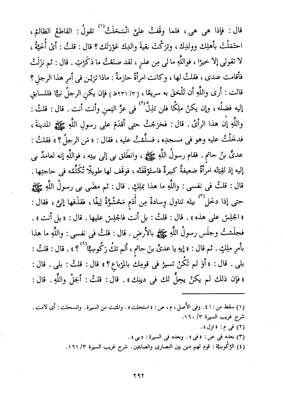 قَالَ: فَإِذَا هِيَ هِيَ، فَلَمَّا وَقَفَتْ عَلَيَّ انْسَحَلَتْ تَقُولُ: الْقَاطِعُ الظَّالِمُ، احْتَمَلْتَ بِأَهْلِكَ وَوَلَدِكَ وَتَرَكْتَ بَقِيَّةَ وَالِدِكَ عَوْرَتَكَ؟ قَالَ: قُلْتُ: أَيْ أُخَيَّةُ لَا تَقُولِي إِلَّا خَيْرًا، فَوَاللَّهِ مَا لِي مِنْ عُذْرٍ، لَقَدْ صَنَعْتُ مَا ذَكَرْتِ. قَالَ: ثُمَّ نَزَلَتْ فَأَقَامَتْ عِنْدِي، فَقُلْتُ لَهَا وَكَانَتِ امْرَأَةً حَازِمَةً: مَاذَا تَرَيْنَ فِي أَمْرِ هَذَا الرَّجُلِ؟ قَالَتْ: أَرَى وَاللَّهِ أَنْ تَلْحَقَ بِهِ سَرِيعًا، فَإِنْ يَكُنِ الرَّجُلُ نَبِيًّا فَلِلسَّابِقِ إِلَيْهِ فَضْلُهُ، وَإِنْ يَكُنْ مَلِكًا فَلَنْ تَزِلَّ فِي عِزِّ الْيَمَنِ وَأَنْتَ أَنْتَ. قَالَ: قُلْتُ: وَاللَّهِ إِنَّ هَذَا الرَّأْيُ. قَالَ: فَخَرَجْتُ حَتَّى أَقْدُمَ عَلَى رَسُولِ اللَّهِ صَلَّى اللَّهُ عَلَيْهِ وَسَلَّمَ الْمَدِينَةَ، فَدَخَلْتُ عَلَيْهِ وَهُوَ فِي مَسْجِدِهِ، فَسَلَّمْتُ عَلَيْهِ، فَقَالَ: " مَنِ الرَّجُلُ؟ " فَقُلْتُ: عَدِيُّ بْنُ حَاتِمٍ. فَقَامَ رَسُولُ اللَّهِ صَلَّى اللَّهُ عَلَيْهِ وَسَلَّمَ وَانْطَلَقَ بِي إِلَى بَيْتِهِ، فَوَاللَّهِ إِنَّهُ لَعَامِدٌ بِي إِلَيْهِ إِذْ لَقِيَتْهُ امْرَأَةٌ ضَعِيفَةٌ كَبِيرَةٌ فَاسْتَوْقَفَتْهُ، فَوَقَفَ لَهَا طَوِيلًا تُكَلِّمُهُ فِي حَاجَتِهَا، قَالَ: قُلْتُ فِي نَفْسِي: وَاللَّهِ مَا هَذَا بِمَلِكٍ. قَالَ: ثُمَّ مَضَى بِي رَسُولُ اللَّهِ صَلَّى اللَّهُ عَلَيْهِ وَسَلَّمَ حَتَّى إِذَا دَخَلَ بَيْتَهُ تَنَاوَلَ وِسَادَةً مِنْ أَدَمٍ مَحْشُوَّةً لِيفًا فَقَذَفَهَا إِلَيَّ فَقَالَ: " اجْلِسْ عَلَى هَذِهِ ". قَالَ: قُلْتُ: بَلْ أَنْتَ فَاجْلِسْ عَلَيْهَا. قَالَ: " بَلْ أَنْتَ ". فَجَلَسْتُ وَجَلَسَ رَسُولُ اللَّهِ صَلَّى اللَّهُ عَلَيْهِ وَسَلَّمَ بِالْأَرْضِ. قَالَ: قُلْتُ فِي نَفْسِي: وَاللَّهِ مَا هَذَا بِأَمْرِ مَلِكٍ. ثُمَّ قَالَ: " إِيهِ يَا عَدِيَّ بْنَ حَاتِمٍ أَلَمْ تَكُ رَكُوسِيًّا؟ " قَالَ: قُلْتُ: بَلَى. قَالَ: " أَوَلَمْ تَكُنْ تَسِيرُ فِي قَوْمِكَ بِالْمِرْبَاعِ؟ " قَالَ: قُلْتُ: بَلَى. قَالَ: " فَإِنَّ ذَلِكَ لَمْ يَكُنْ يَحِلُّ لَكَ فِي دِينِكَ ". قَالَ: قُلْتُ: أَجَلْ وَاللَّهِ. قَالَ: