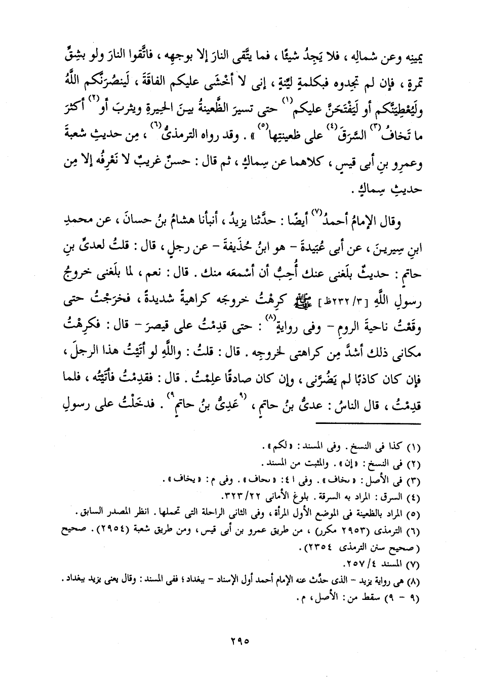 وَقَالَ الْإِمَامُ أَحْمَدُ أَيْضًا: حَدَّثَنَا يَزِيدُ أَنْبَأَنَا هِشَامُ بْنُ حَسَّانَ عَنْ مُحَمَّدِ بْنِ سِيرِينَ عَنْ أَبِي عُبَيْدَةَ - هُوَ ابْنُ حُذَيْفَةَ - عَنْ رَجُلٍ، قَالَ: قُلْتُ لِعَدِيِّ بْنِ حَاتِمٍ: حَدِيثٌ بَلَغَنِي عَنْكَ أُحِبُّ أَنْ أَسْمَعَهُ مِنْكَ. قَالَ: نَعَمْ، لَمَّا بَلَغَنِي خُرُوجُ رَسُولِ اللَّهِ صَلَّى اللَّهُ عَلَيْهِ وَسَلَّمَ كَرِهْتُ خُرُوجَهُ كَرَاهِيَةً شَدِيدَةً، فَخَرَجْتُ حَتَّى وَقَعْتُ نَاحِيَةَ الرُّومِ - وَفِي رِوَايَةٍ: حَتَّى قَدِمْتُ عَلَى قَيْصَرَ - قَالَ: فَكَرِهْتُ مَكَانِي ذَلِكَ أَشَدَّ مِنْ كَرَاهَتِي لِخُرُوجِهِ. قَالَ: قُلْتُ: وَاللَّهِ لَوْ أَتَيْتُ هَذَا الرَّجُلَ فَإِنْ كَانَ كَاذِبًا لَمْ يَضُرَّنِي، وَإِنْ كَانَ صَادِقًا عَلِمْتُ. قَالَ: فَقَدِمْتُ فَأَتَيْتُهُ، فَلَمَّا قَدِمْتُ، قَالَ النَّاسُ: عَدِيُّ بْنُ حَاتِمٍ عَدِيُّ بْنُ حَاتِمٍ فَدَخَلْتُ عَلَى رَسُولِ